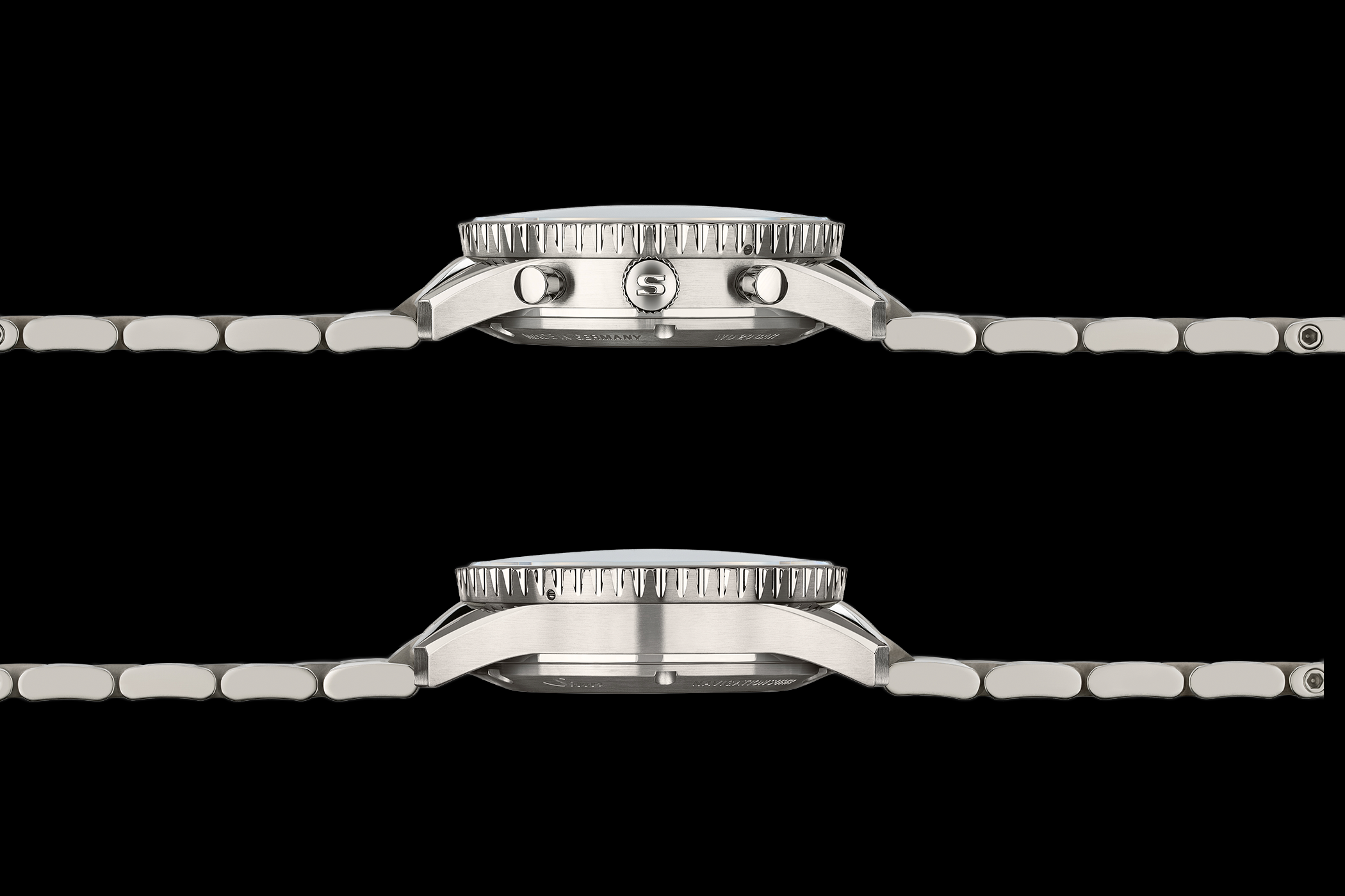 Das 41-mm-Gehäuse der 903 Ti II Jubiläum unterstreicht den technischen Anspruch. Sinn setzt dabei auf hochfestes Titan Grade 5, kombiniert mit polierten und satinierten Flächen. Die entscheidende Innovation steckt jedoch in der Bedienung des Drehrings mit Innenskala. Dank DSP-Technologie lässt sich der Drehring direkt am Außendurchmesser gleitend bedienen, ohne Kompromisse bei der Wasserdichtigkeit. Die Uhr ist bis 20 bar wasserdicht und zudem unterdrucksicher.