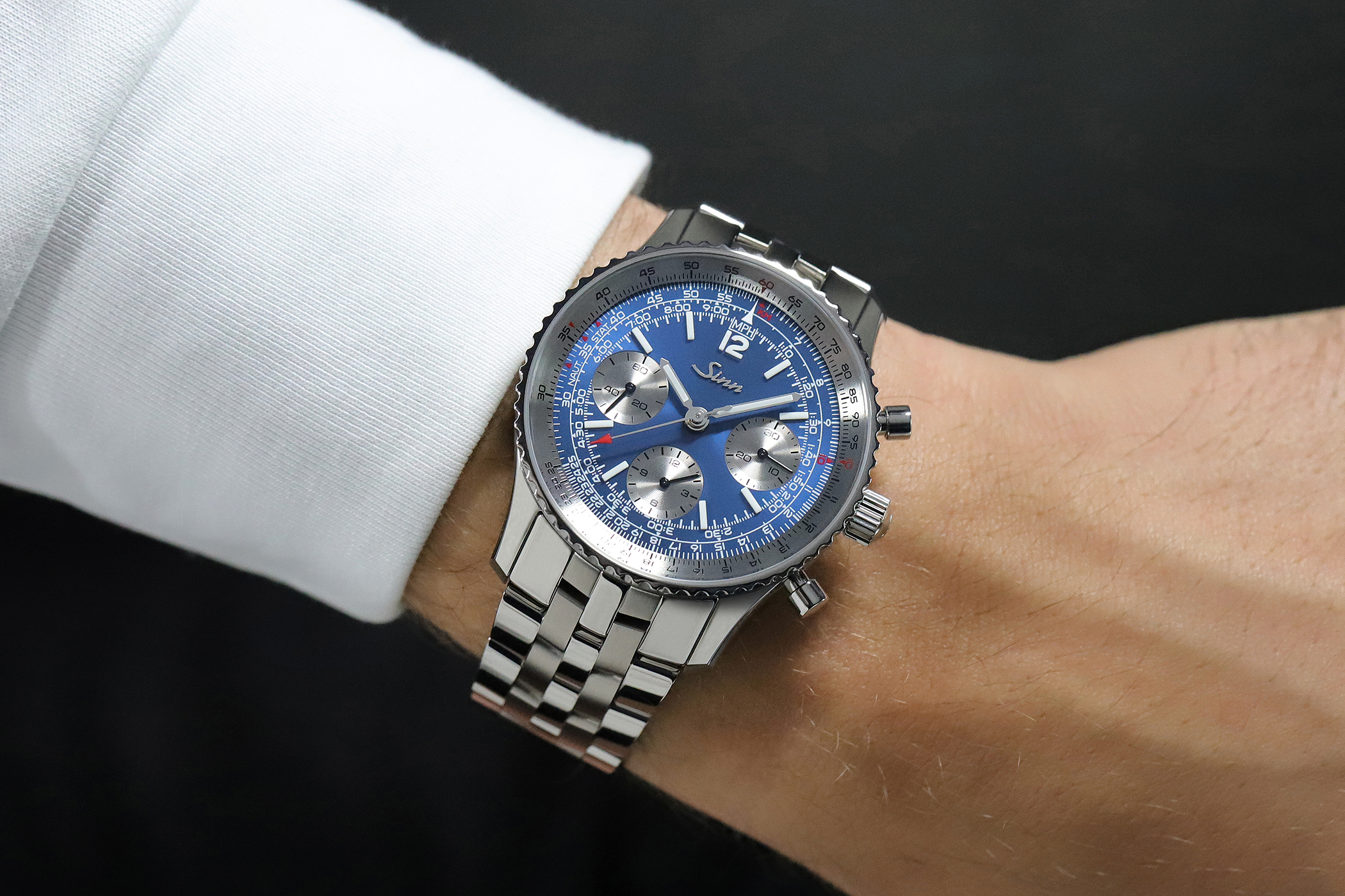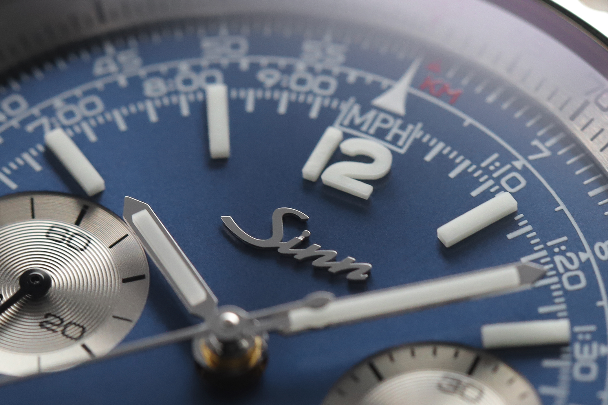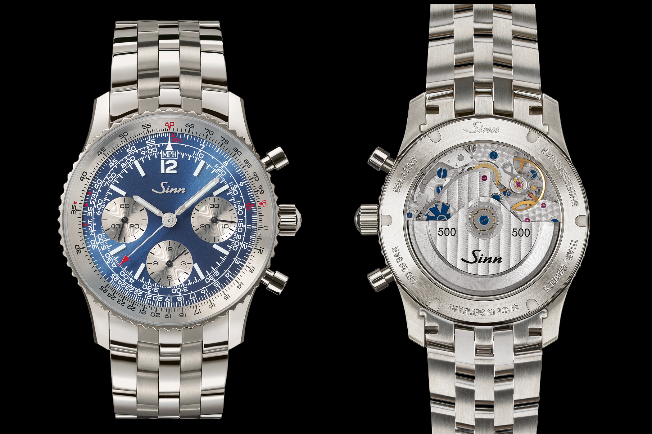 Optisch setzt die 903 Ti II Jubiläum auf ein dunkelblaues, galvanisches Zifferblatt mit Sonnenschliff. Der logarithmisch skalierte Rechenschieber erlaubt Navigationsrechnungen, etwa zu Zeiten, Entfernungen oder Währungsumrechnungen. Die Totalisatoren sind im Tricompax-Layout angeordnet, ihre Zählerkreise galvanisch rhodiniert. Für die Nachtablesbarkeit nutzt Sinn von Hand aufgesetzte hybridkeramische Nachleuchtelemente: Indizes, die „12“ sowie Stunden- und Minutenzeiger tragen diese Elemente, bei denen die Leuchtpigmente direkt in das keramische Formteil integriert sind.