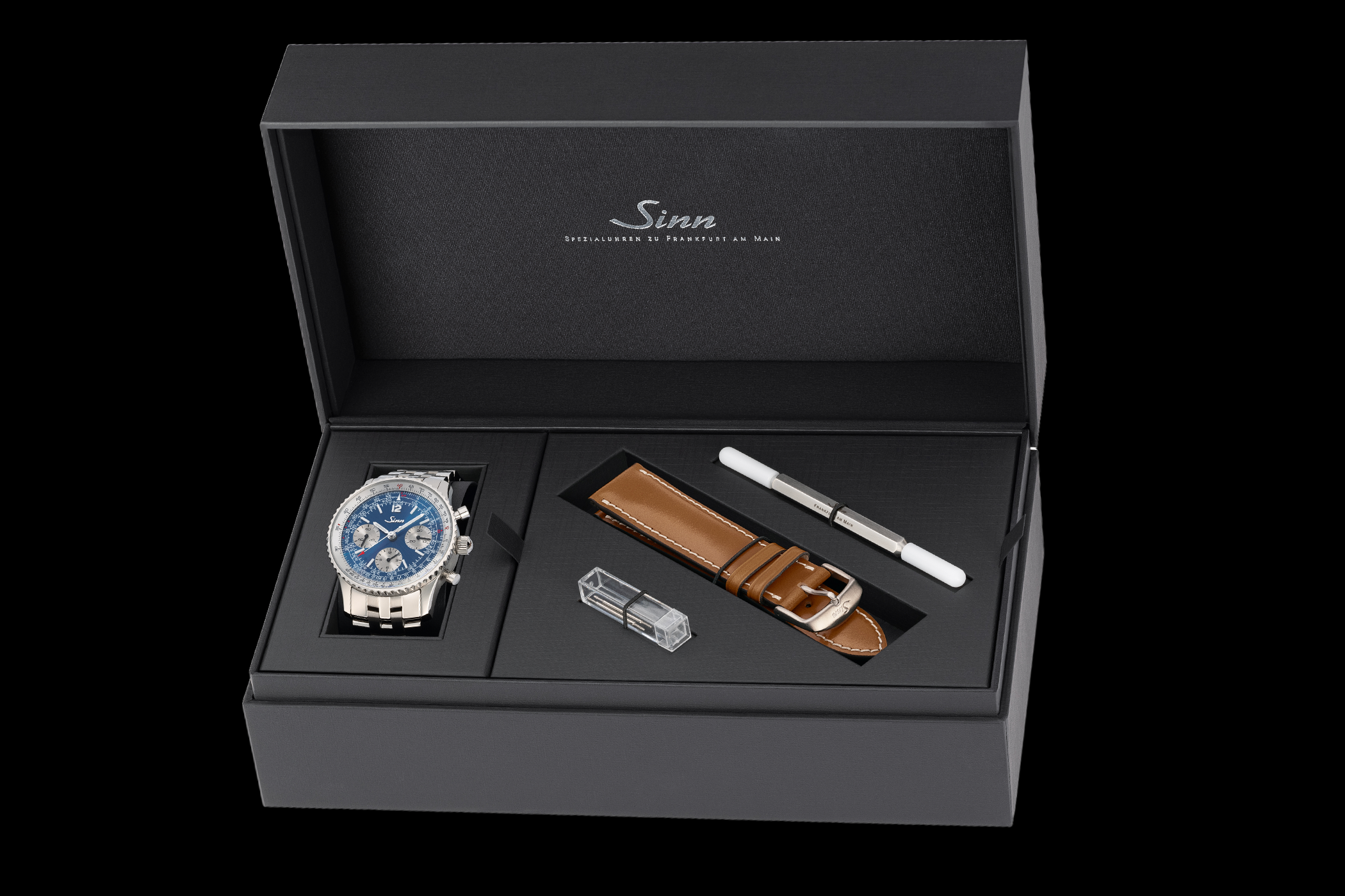 Geliefert wird die 903 Ti II Jubiläum in einem Doppeletui inklusive braunem Pferdelederarmband und feingliedrigem Massivarmband aus Titan, dazu Bandwechselwerkzeug, Ersatzfederstege und Broschüre. Der Preis beträgt 3.980,00 Euro inkl. MwSt.