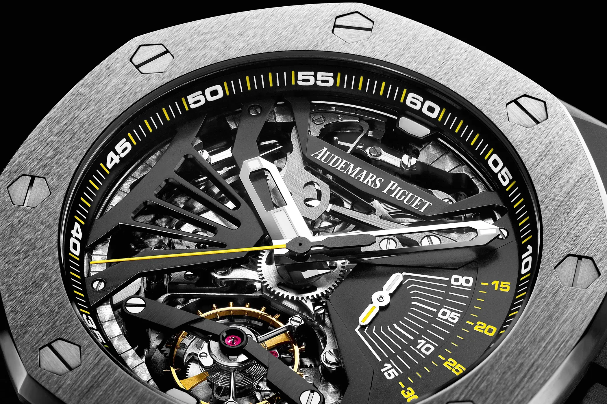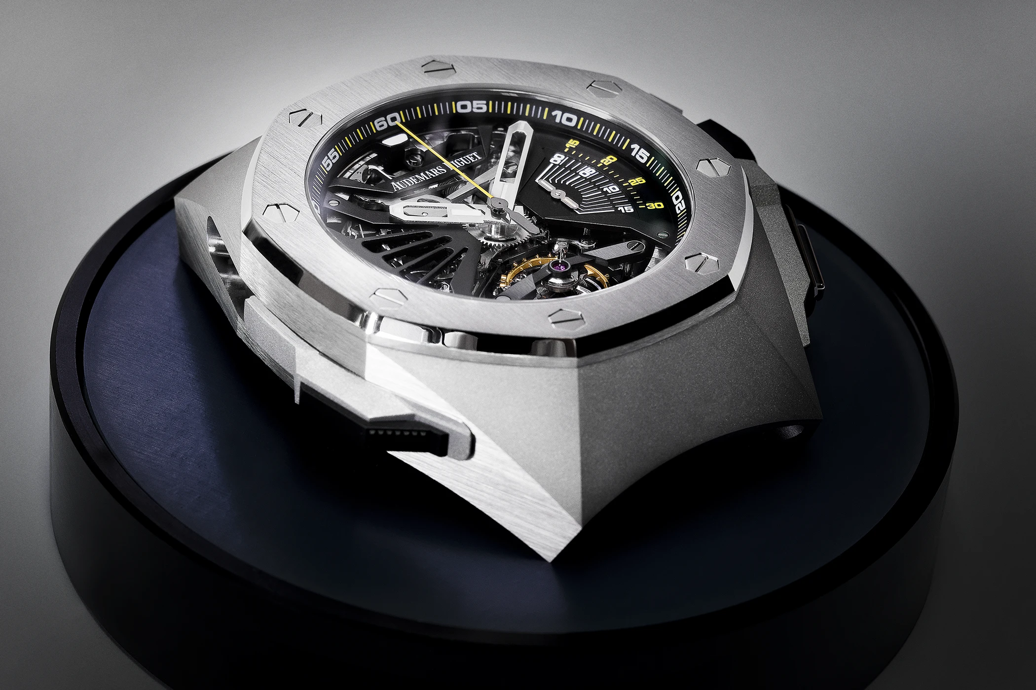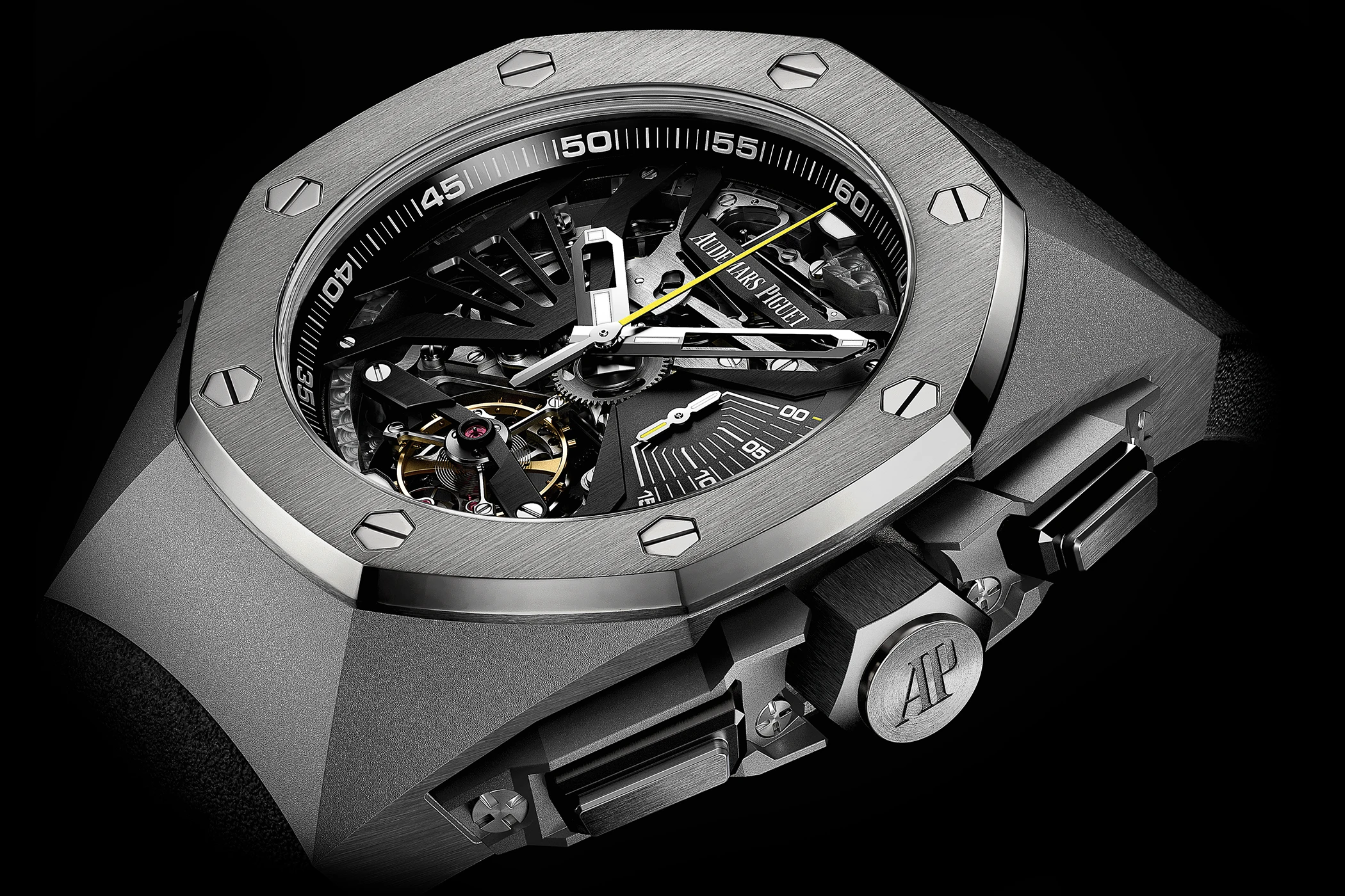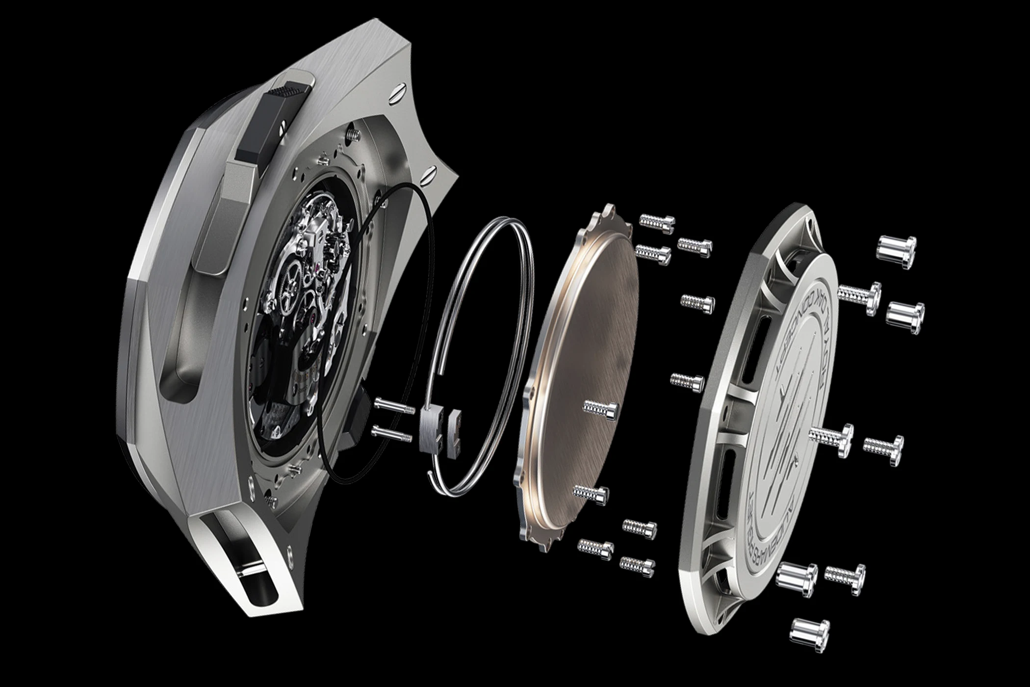 Auch beim Gehäuse hat sich Audemars Piguet für eine innovative funktionale Lösung entschieden: Die Marke kombiniert Titan mit „Massivem Metallischem Glas“ (Bulk Metallic Glass). Dabei handelt es sich um eine neue Materialklasse, die durch schnelles Abkühlen statt einer bei Metallen üblichen kristallinen Struktur eine amorphe Struktur erhält und damit glasartige Eigenschaften wie eine extreme Härte.