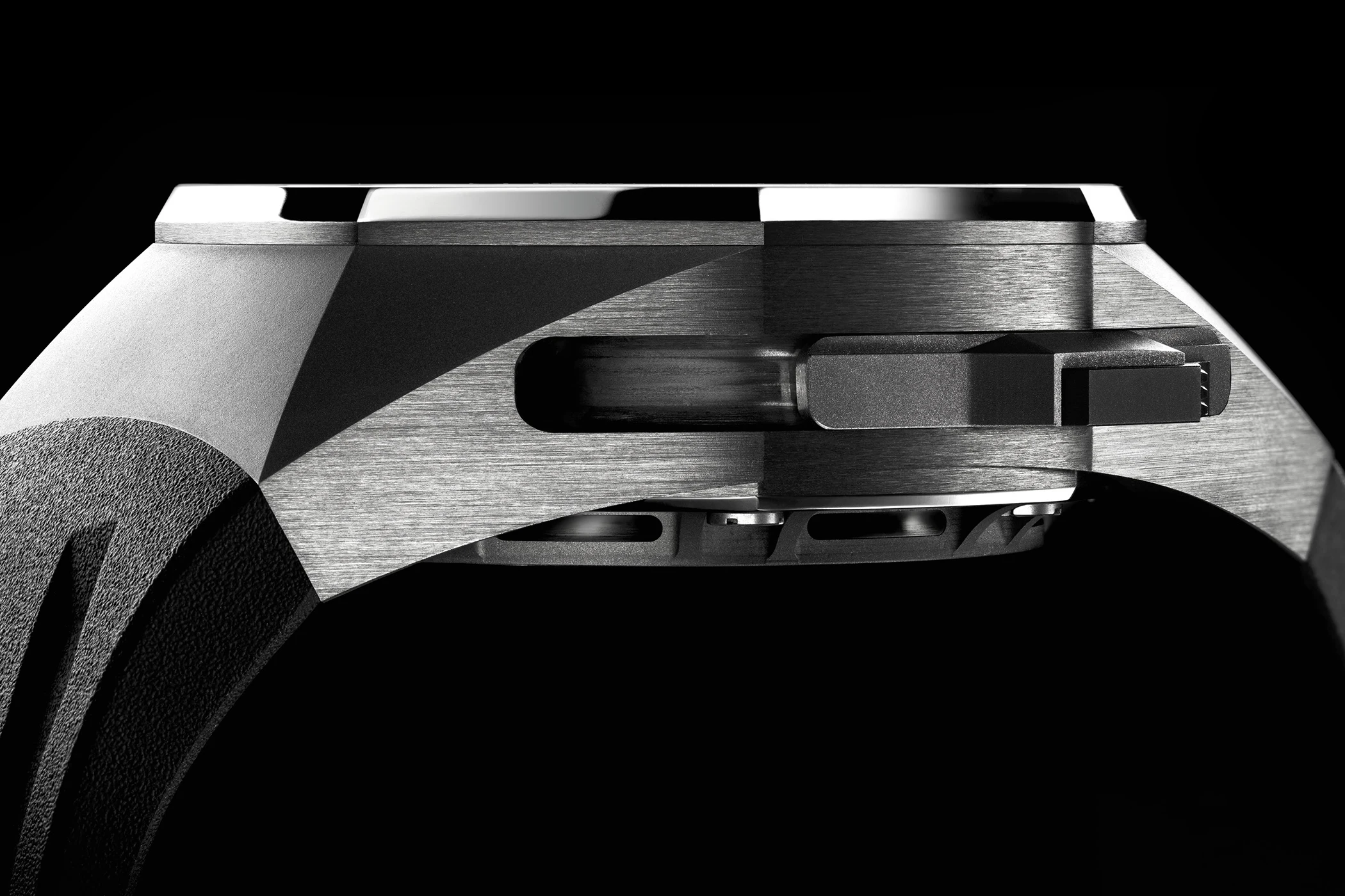 Audemars Piguet hat zudem die Krone mit einem Drücker zur Funktionswahl zwischen Zeigerstellen und Aufziehen ausgestattet. In der Zeigerstellposition steht der Drücker weiter heraus und ein roter Ring wird als visuelle Rückmeldung sichtbar, sodass der Träger genau weiß, welche Funktion die Krone gerade übernimmt.