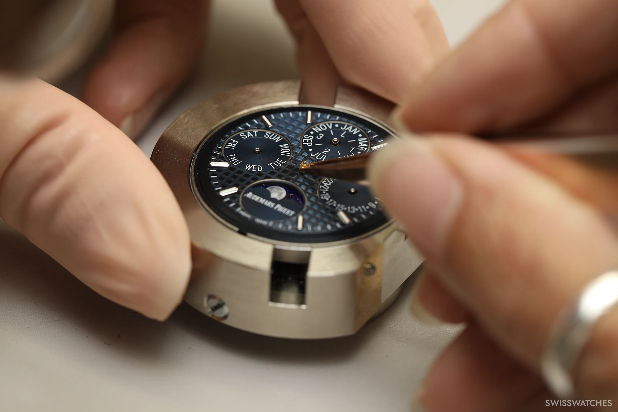 Dafür entwickelte Audemars Piguet wieder mehrere patentierte Innovationen: So ist die Kurvenscheibe für das Monatsende in das Datumsrad integriert und die Kurvenscheibe für den Monat ist mit dem Monatsrad kombiniert. Auch die Geometrie der einzelnen Bauteile wurde von Anfang an optimiert, was die Einstell- und Montagezeit verkürzt. Alle Funktionen des ewigen Kalenders liegen zudem auf einer Ebene. Um die Ablesbarkeit zu verbessern, haben die Entwickler keine Anzeige doppelt belegt, was sonst bei ewigen Kalendern fast immer gemacht wird.