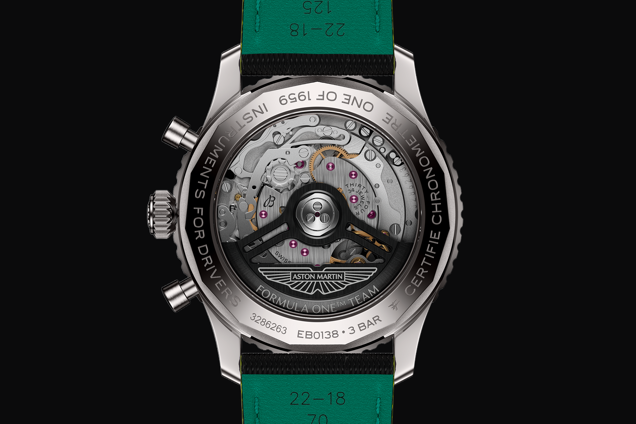 Zum ersten Mal findet sich mit der Navitimer B01 Chronograph 43 Aston Martin Aramco Formula One Team ein Titangehäuse in der Navitimer-Kollektion. Dank dieser Materialwahl ist das 43 mm-große Gehäuse um nahezu die Hälfte leichter als ein Edelstahlgehäuse. Über den offenen Saphirglasboden lässt sich das geschäftige Automatikwerk beobachten, während die Fassung des Gehäusebodens mit den Gravuren “One of 1959” und “Instruments for Divers” versehen ist.