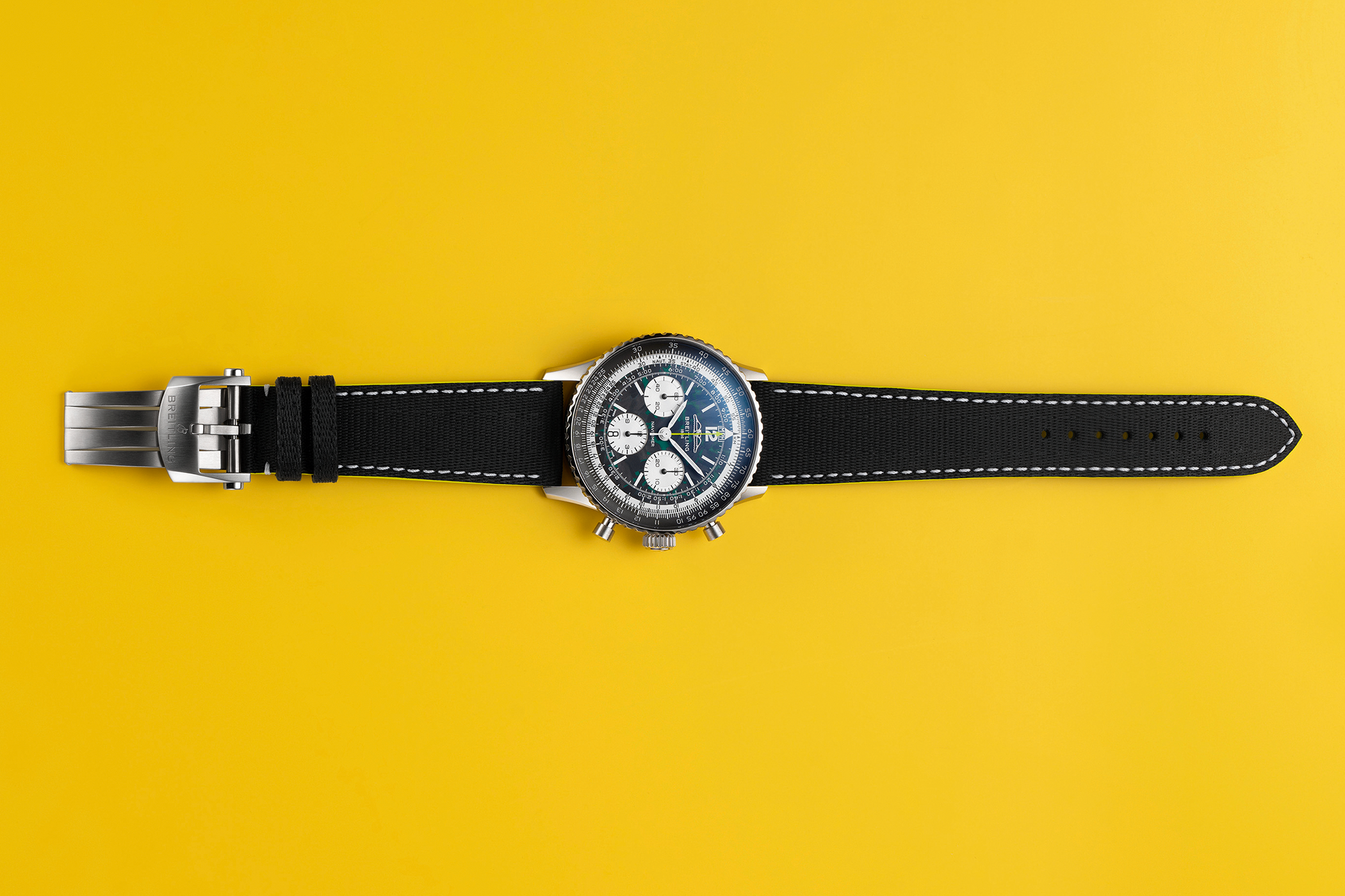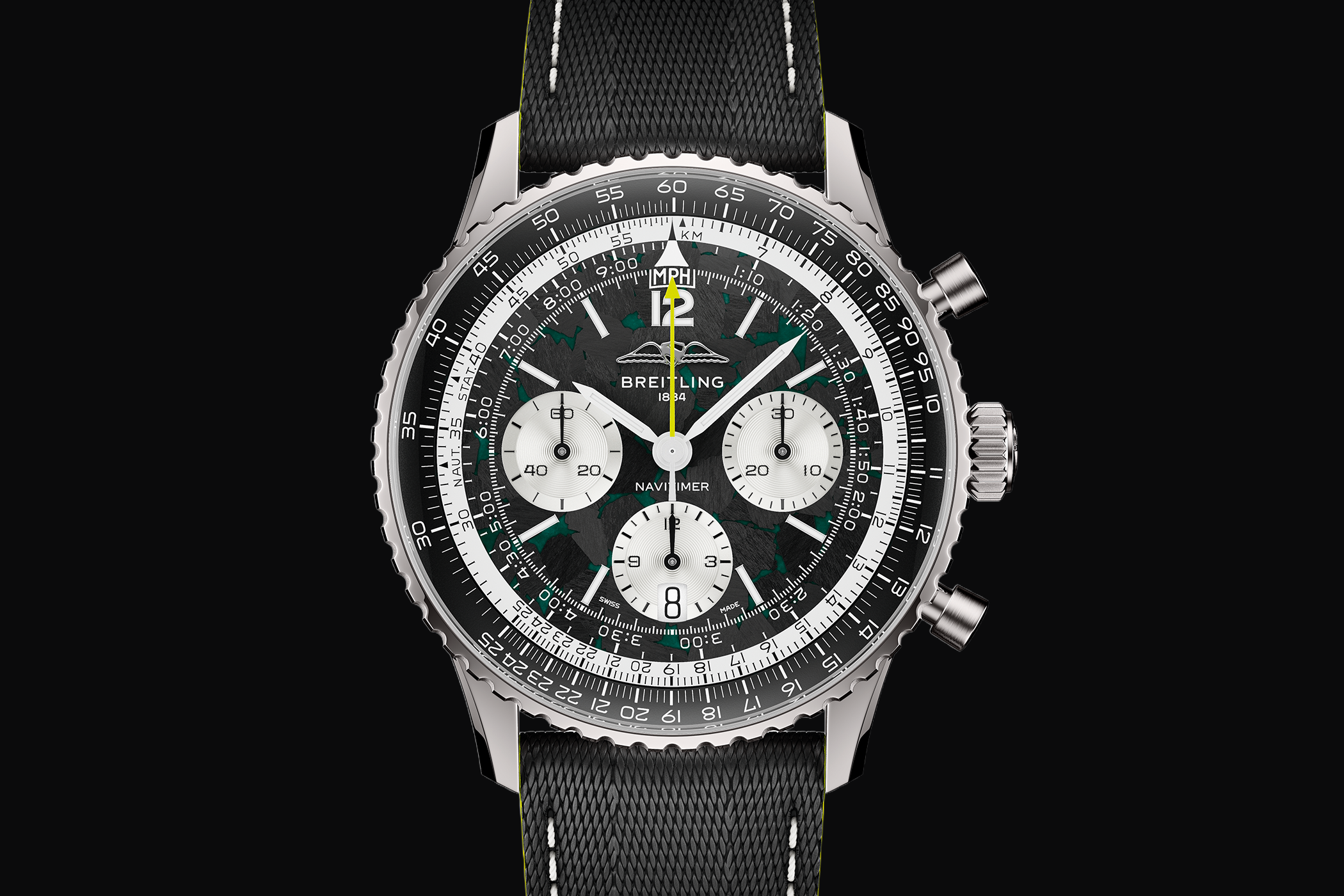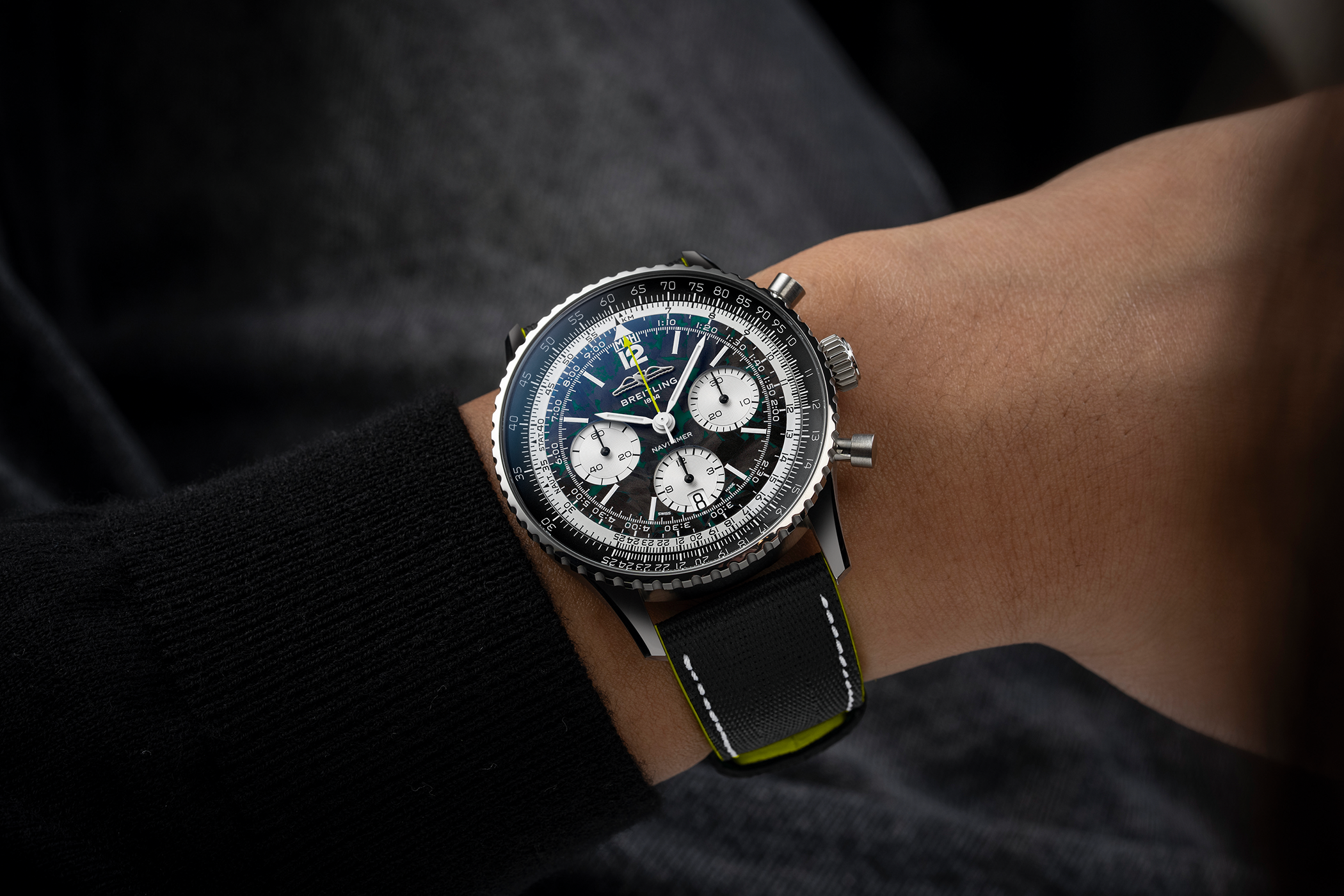Inspiriert von der Aston Martin Aramco Lackierung durchziehen grüne Farbakzente das schwarze Kohlefaserzifferblatt. Passend dazu leuchtet die Super-LumiNova auf dem Stunden- und Minutenzeiger sowie auf den Indizes in Grün und sorgt gleichzeitig für eine erhöhte Sichtbarkeit bei Nacht. Der Zentralsekundenzeiger hebt sich hingegen in einem Limettengrün besonders vom Zifferblatt ab. Der 30-Minuten-Zähler befindet sich bei 3 Uhr und steht dem ¼-Sekunden-Zähler bei 9 Uhr gegenüber. Das Hilfszifferblatt mit dem 12-Stunden-Zähler ist bei 6 Uhr platziert und integriert ein Datumsfenster. Zur besseren Lesbarkeit sind alle Hilfszifferblätter in Weiß gehalten.