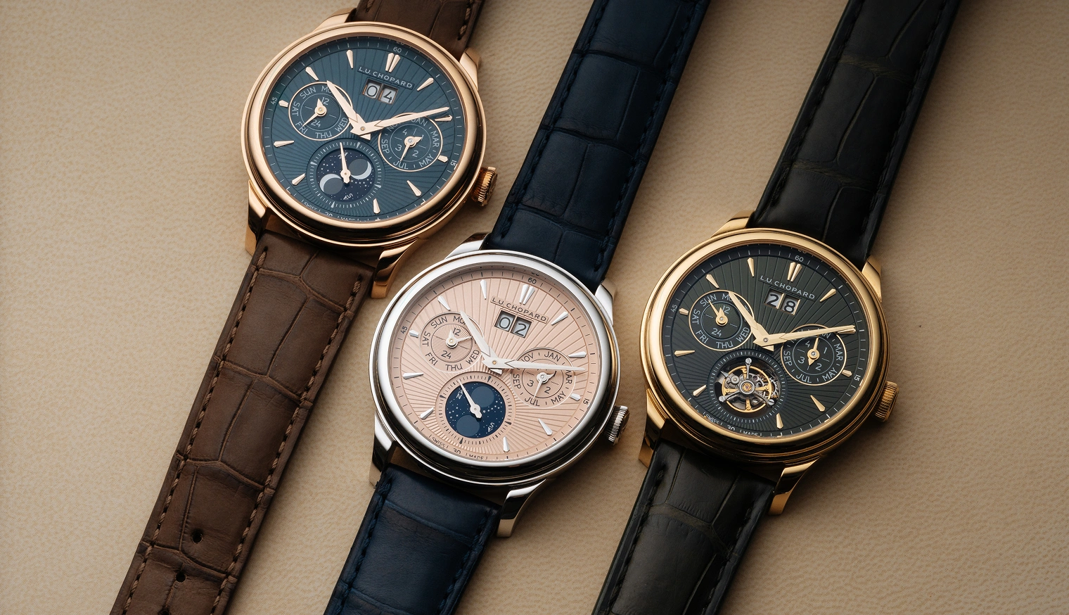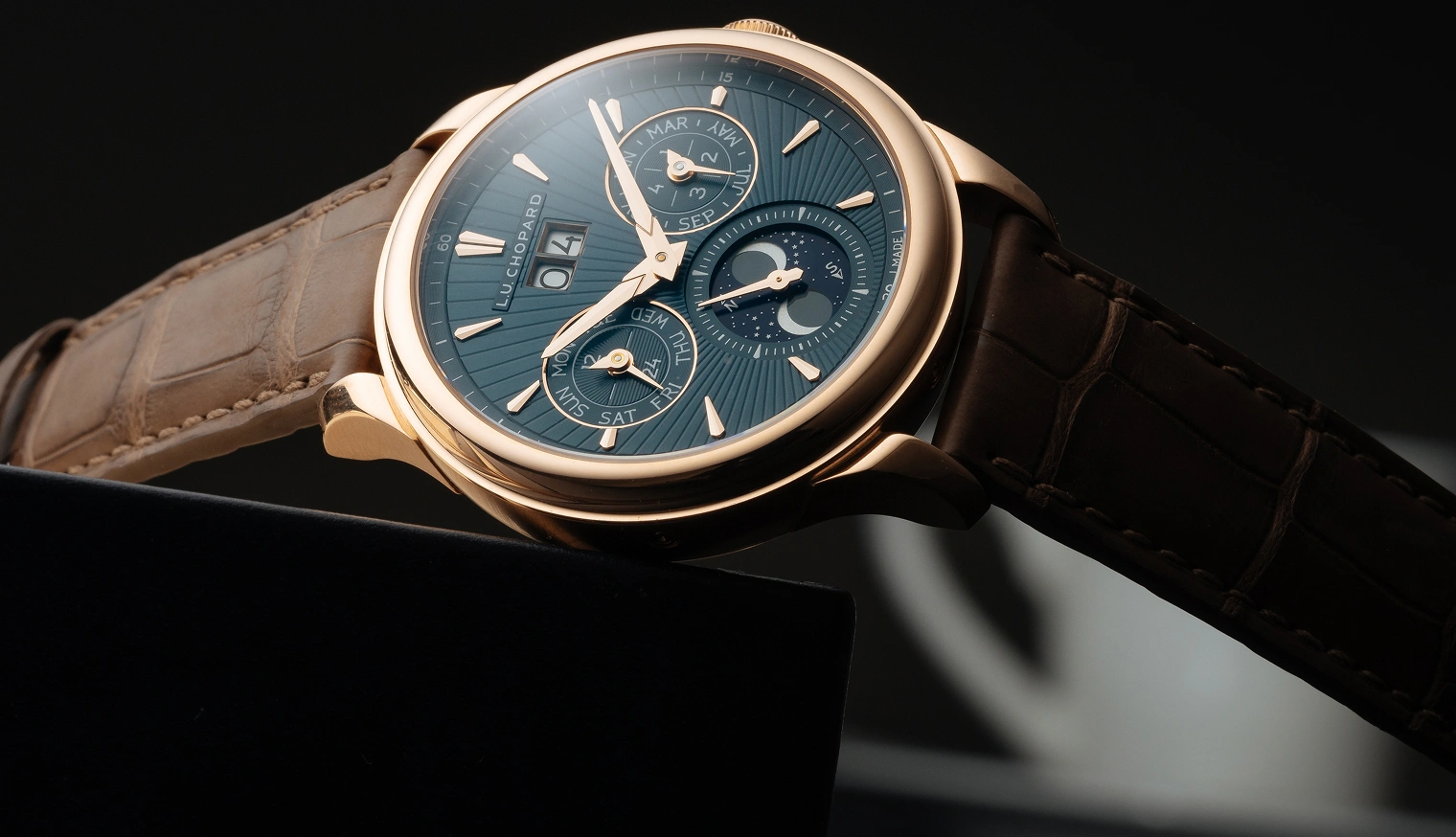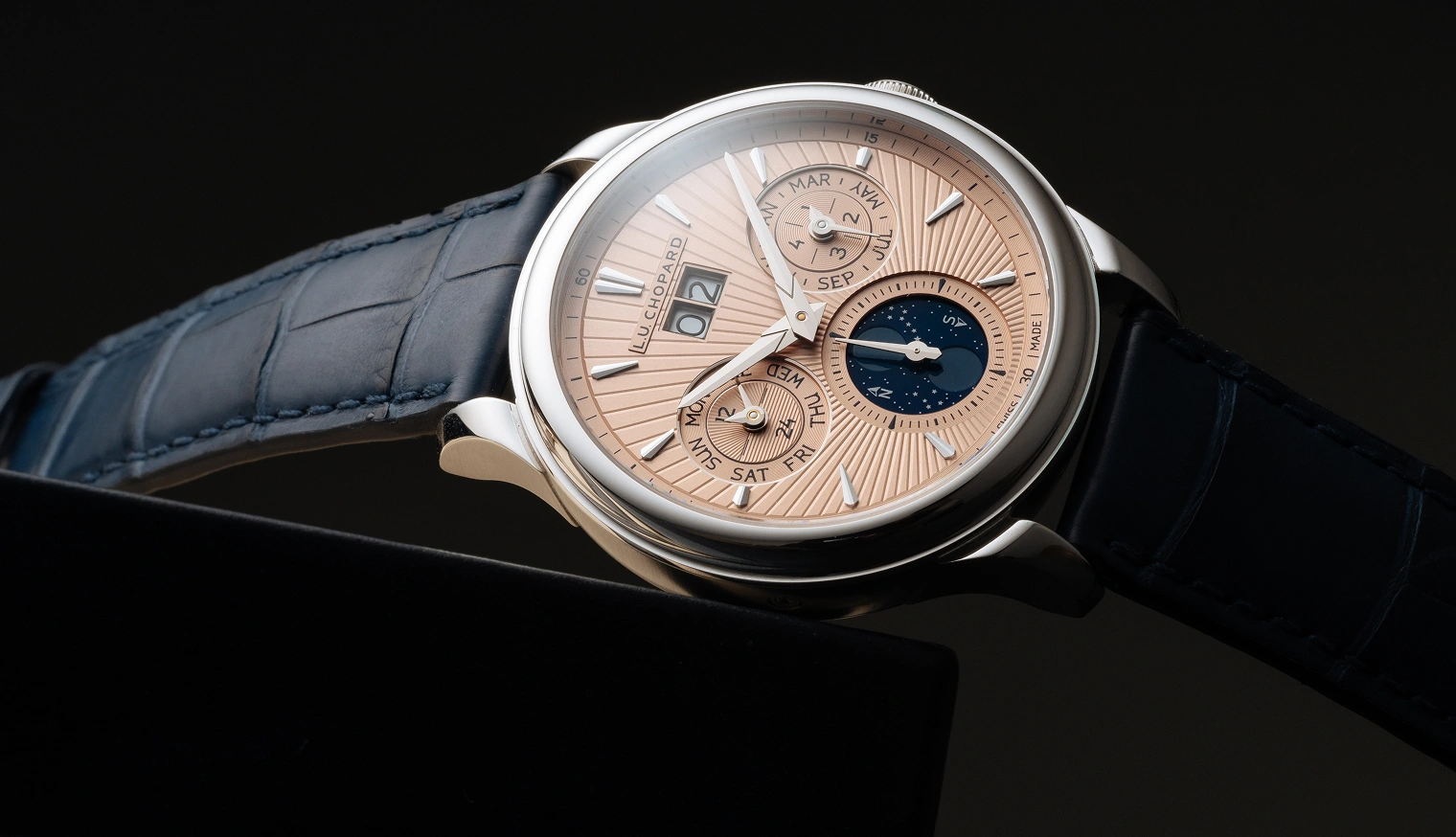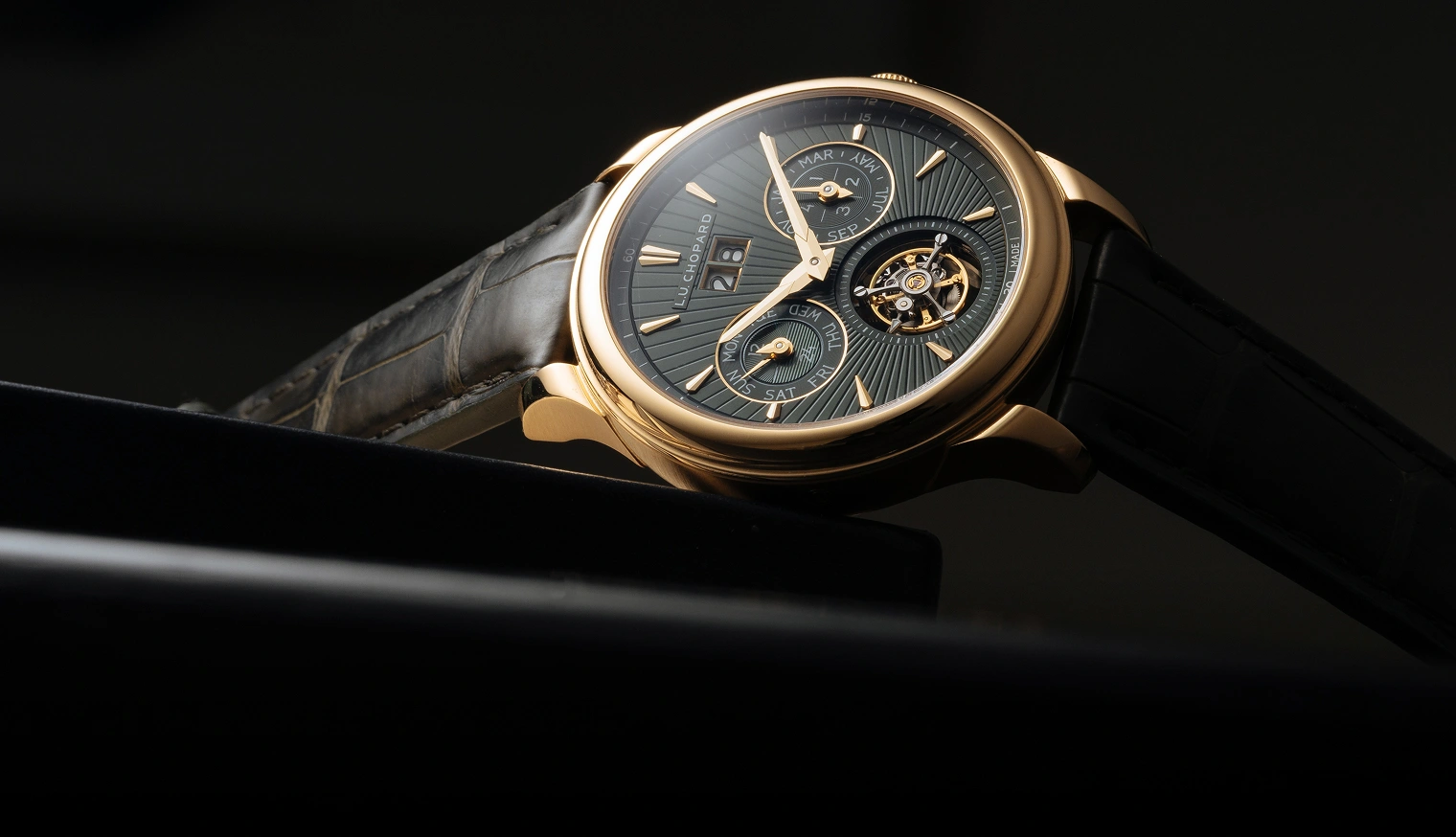 Die L.U.C Lunar One verkörpert die Essenz der Ästhetik von Chopard: elegant, technisch raffiniert, zeitlos. Das Gehäuse wird aus hauseigenem Gold gefertigt und ist sowohl in Weiß- als auch in Roségold erhältlich, passend zu den sich verjüngenden Indexen und Zeigern. Das Schwestermodell, die L.U.C Flying T Twin Perpetual, glänzt in einem besonders faszinierenden Material: Gelbgold. Bei jedem Modell unterstreicht ein von Hand guillochiertes Sonnenstrahlmuster den unverwechselbaren Look dieser hochkomplexen Modelle.