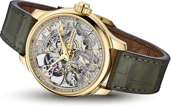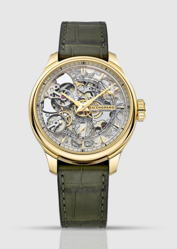 Das Herzstück bildet das Kaliber L.U.C 08.03-L mit 686 Bauteilen. Seine Architektur integriert den Sonnerie-Mechanismus und die Minutenrepetition und präsentiert die technische Raffinesse durch ein skelettiertes Design.