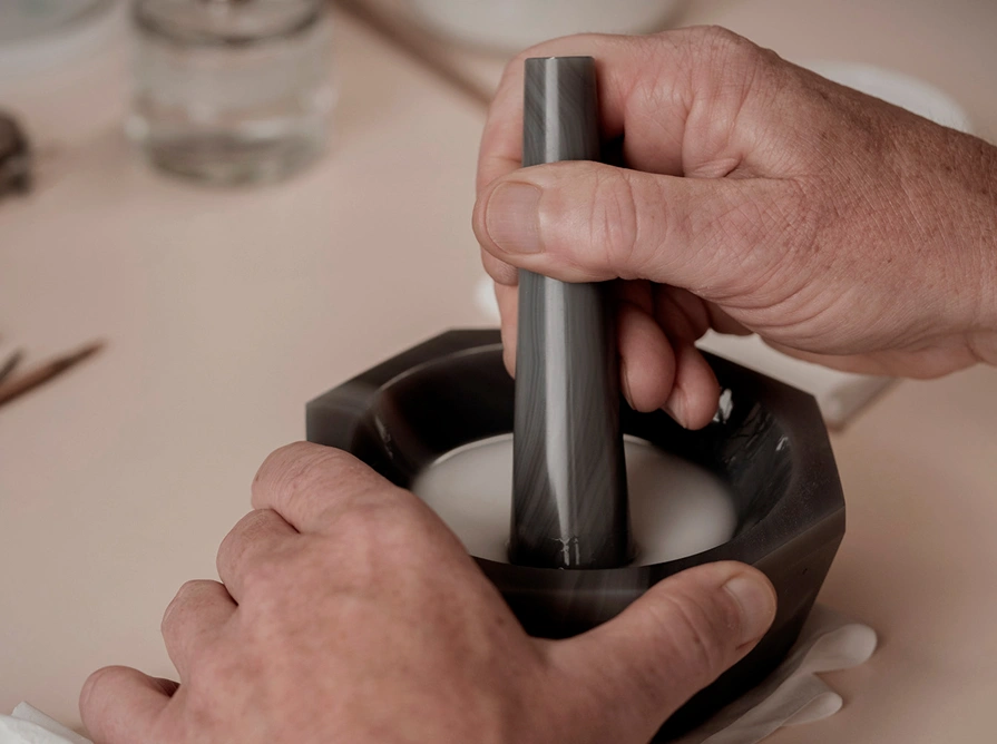 Für Christophe beginnt jedes Email-Zifferblatt mit farbigen Glasplatten, die mit Metalloxiden getönt sind. Einige sind leuchtend und durchscheinend, andere reichhaltig und opak. Das Glas wird zu einem feinen Pulver zermahlen und mit Kiefernöl vermischt, wodurch es sich in Farbe verwandelt – der Werkstoff für sein Handwerk.