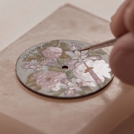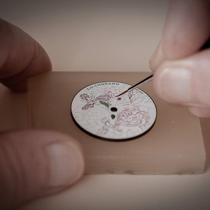 Prägen, Sonnenstrahlenmotiv, Emailieren: Chopard beherrscht eine Vielzahl von Handwerkskünsten, wenn es um die Herstellung von Zifferblättern geht. Eine davon steht jedoch an erster Stelle: Grand-Feu-Emailieren. Für dieses besonders geschätzte Handwerk vertraut die Maison auf einen einzigen talentierten Handwerker: Christophe, der seit 2019 für Chopard tätig ist. Seine ruhige Hand und sein Gespür für Farben ermöglichen es ihm, Zifferblätter mit einer Tiefe und Ausstrahlung zu schaffen, die man mit keiner anderen Technik erzielen kann.