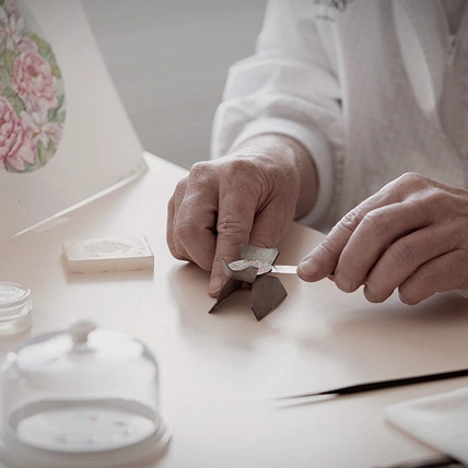 Ihre Arbeit beginnt bereits in der Entwurfsphase: Sie sitzt an ihrem Arbeitstisch und skizziert jedes Motiv freihändig mit Bleistift direkt auf die Brücke. Mit selbst gefertigten und geschärften Sticheln schneidet sie das umgebende Material weg, sodass Blumen und Voluten in zartem Flachrelief hervortreten. Der Hintergrund wird mit denselben Werkzeugen Stück für Stück verfeinert, bevor die Motive poliert werden – eine heikle Aufgabe angesichts der weichen Beschaffenheit des Goldes. Das Endergebnis ist ein Lichtspiel, das eine unverwechselbare Lebendigkeit erzeugt.
