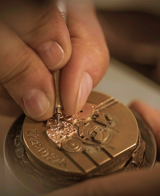 Diese Tradition wäre möglicherweise in Vergessenheit geraten, hätte Karl-Friedrich Scheufele im L.U.CEUM, dem Museum von Chopard in Fleurier, nicht eine goldene Uhr mit einem im alten Stil gravierten Uhrwerk entdeckt. Von dieser Entdeckung inspiriert, belebte er diese Technik für die außergewöhnlichsten Stücke des Hauses wieder und behielt sie ausschließlich für Unikate oder streng limitierte Editionen vor. Eine Kollektion von nur acht Uhren dieser Art erforderte ein ganzes Jahr Gravurarbeit, bevor sie fertiggestellt werden konnte.
