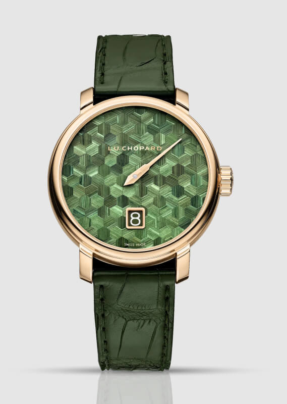 Für diese Art der Verzierung ist nicht nur Geschick, sondern auch Zeit erforderlich. Einige von Nathalies Werkzeugen, darunter Feilen, Stempel und Stichel, begleiten sie seit über 15 Jahren. Sie sind so geschliffen, dass keine Spuren in den gravierten Rillen zurückbleiben. Jede ihrer Markierungen zeugt von Geduld und Präzision – den Markenzeichen ihres Handwerks, bei dem die traditionelle menschliche Note sowohl sichtbar als auch unverzichtbar ist. Über die Gravur hinaus hat Nathalie auch die filigrane Kunst der Strohintarsien gemeistert und wendet diese seltene Dekorationstechnik an, um komplexe, lichtreflektierende Muster zu schaffen. Ihr Fachwissen kommt in der Kollektion 2025 L.U.C zum Ausdruck, insbesondere bei einem Modell mit einem auffälligen grünen Zifferblatt. Bei diesem Modell verwandeln die Intarsien die Oberfläche in ein leuchtendes, geometrisches Tableau und integrieren gleichzeitig subtil eine springende Stundenfunktion.