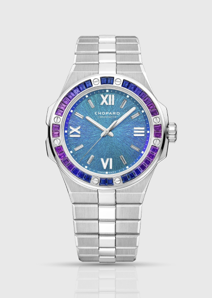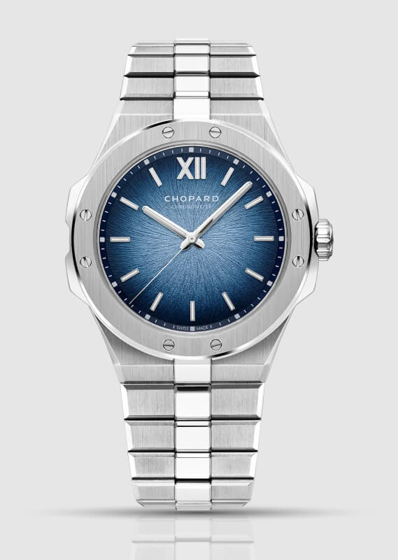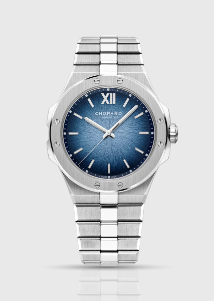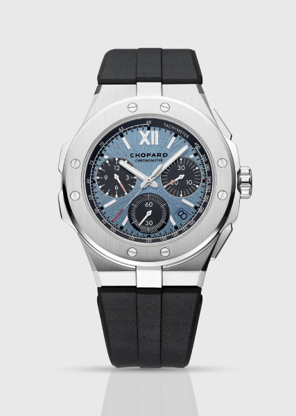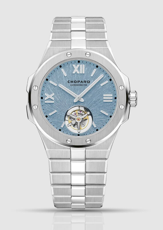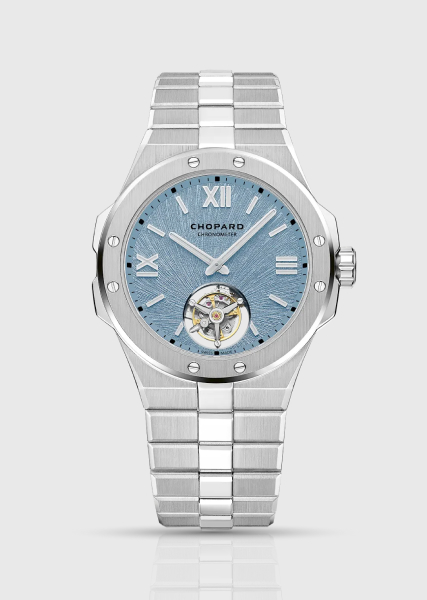 Die Chopard Alpine Eagle Flying Tourbillon (Ref. 298616-3003) verbindet echte Haute Horlogerie mit der sportlich-schicken Designsprache der Kollektion. Sie verfügt über ein 41 mm großes Gehäuse aus Lucent Stahl, ein integriertes Armband und ein „Rhône Blue”-Zifferblatt, das mit einem strahlenförmigen Adler-Iris-Motiv geprägt ist. Bei 6 Uhr wird das Zifferblatt durch ein fliegendes Tourbillon geöffnet.