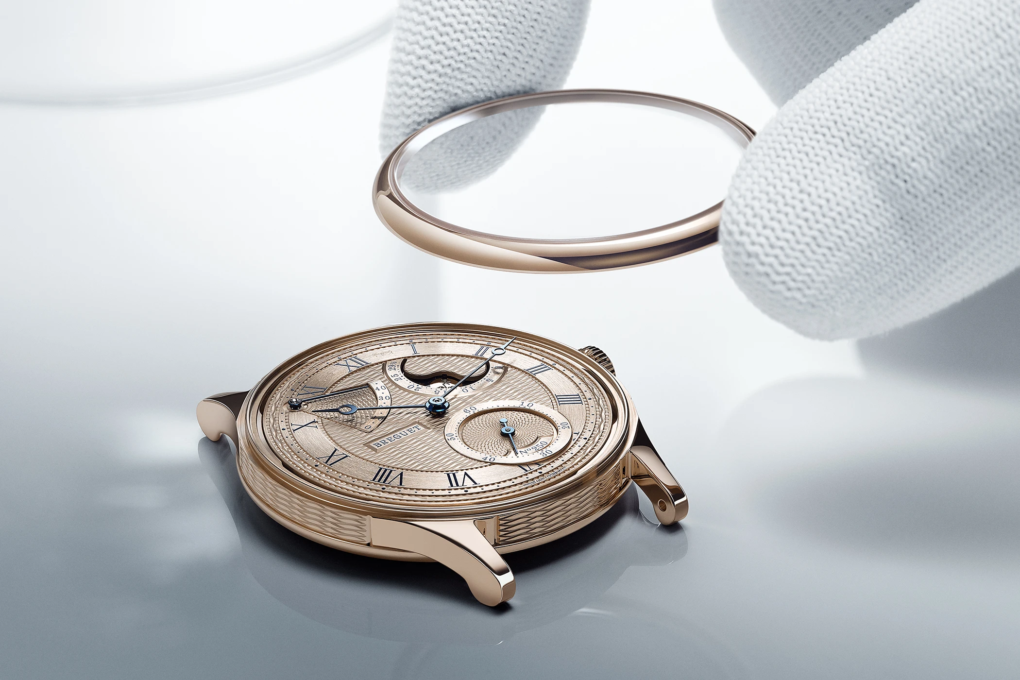 Dieselbe Verzierungstiefe wohnt auch dem Gehäuse aus Breguet-Gold mit einem Durchmesser von 39 mm und einer Höhe von 9,9 mm inne – erstmals bei einem Classique-Gehäuse ersetzt Breguet hier die klassischen, vertikal verlaufenden kannelierten Rillen am Gehäusemittelteil durch das horizontale „Quai de l’Horloge“-Motiv. Der Rand des Gehäusebodens trägt dieselbe Verzierung und darüber hinaus die Limitierungsgravur 1/250 bis 250/250, während die Wasserdichtheit mit 3 bar (30 Metern) angegeben ist. Zudem übernimmt Breguet bei dieser Neuheit die Bandanstöße vom Modell Souscription – dem Modell, das die Feierlichkeiten des Jubiläums eröffnete. Im Vergleich zu den Bandanstößen früherer Classique-Modelle, die gerade ausgeführt sind, wölbt Breguet die neuen Bandanstöße, was nicht zuletzt den Tragekomfort der Uhren erhöhen soll.