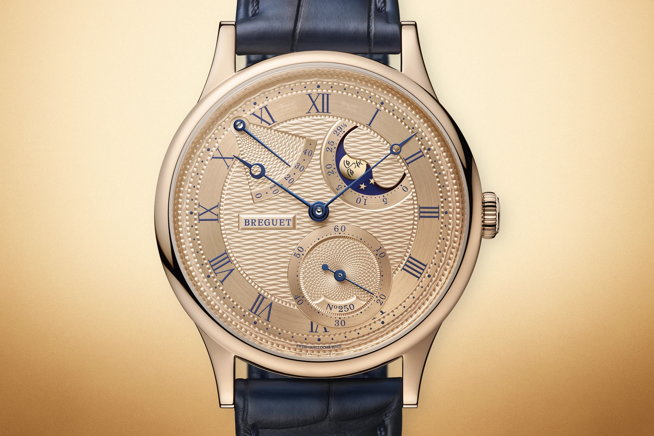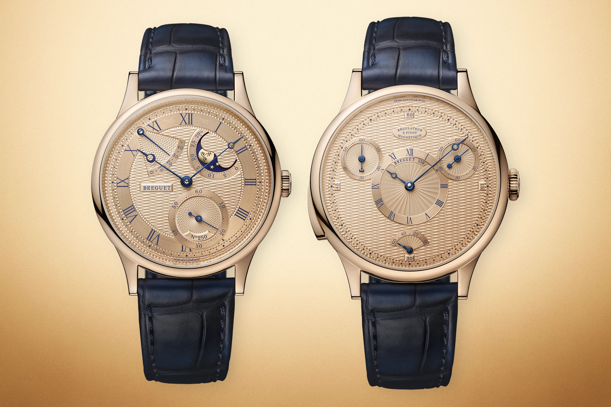 Anlässlich ihres 250. Markenjubiläums stellt Breguet eine Reihe von Jubiläumsuhren vor, die jeweils mit einer der sechs Kernkollektionen – Reine de Naples, Marine, Type XX, Classique, Tradition und Héritage – in Verbindung stehen. Dieser Ansatz soll die Tatsache widerspiegeln, dass Breguet nicht nur für eine einzige Uhr oder Kollektion steht. Diese Uhren folgen einer erklärten Formel, die sich durch die gesamte Jubiläumskollektion zieht: Zum einen verweist jedes Jubiläumsmodell einerseits mit seiner Konstruktion auf bedeutende Erfindungen aus den mehr als 200 Patentanmeldungen der Marke und andererseits in seiner Gestaltung auf stilprägende, meist historische Zeitmesser aus der Unternehmensgeschichte. Zum anderen präsentieren die meisten Jubiläumsmodelle die eigens für das Jubiläum entwickelte Goldlegierung „Breguet Gold“ sowie die Verwendung des ebenfalls neu erdachten „Quai de l’Horloge“-Musters auf Komponenten wie den Zifferblättern, den Gehäusen oder Gehäuseböden sowie der Schwungmasse.