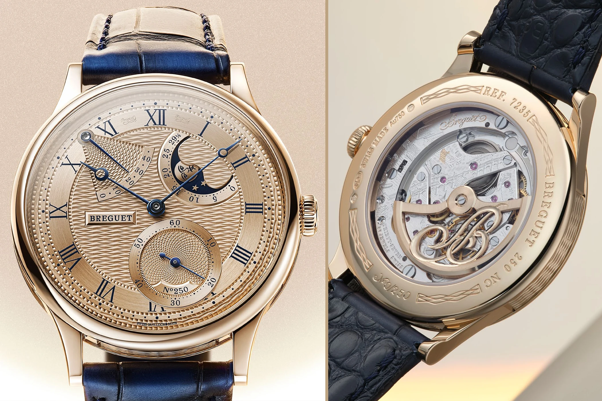 Als Teil der Feierlichkeiten zum 250-jährigen Jubiläum der Marke lanciert Breguet mit der Classique Phase de lune 7235 und der Classique Régulateur à Pivot Magnétique 7225 zwei weitere Jubiläumsmodelle, die durch mehrere Gesichtspunkte geeint werden: zum einen die Tatsache, dass Gehäuse und Zifferblätter vollständig aus Breguet-Gold gefertigt sind, diese Komponenten das handguillochierte Motiv „Quai de l’Horloge“ tragen und beide Uhren zudem von historischen Breguet-Taschenuhren inspiriert sind. Hier sind alle Details über die Neuheiten.