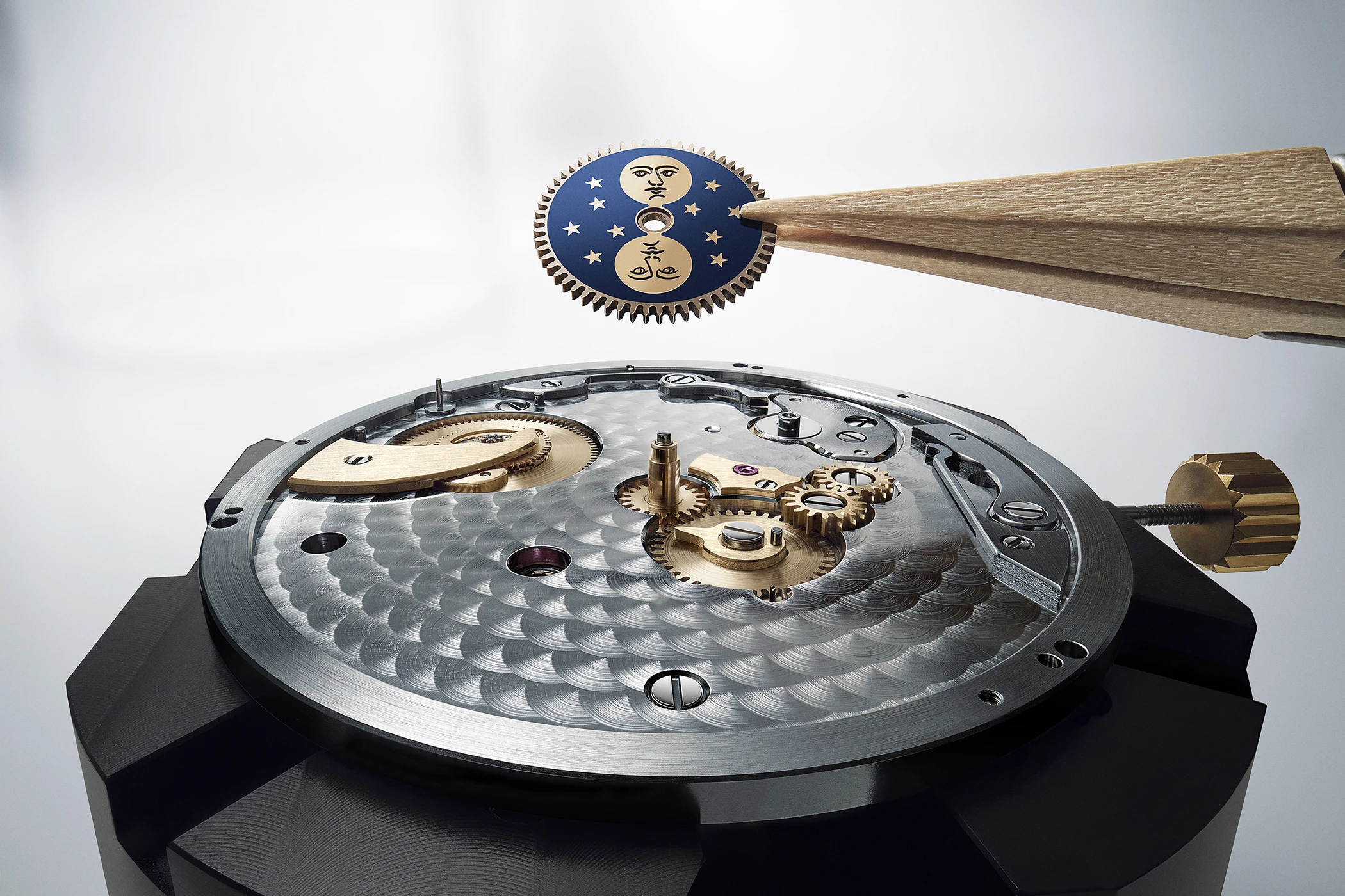 Die Komplexität des Zifferblatts lässt sich auch dann erkennen, wenn man auf die verschiedenen Guillochage-Muster blickt: Der innere Bereich des Zifferblatts weist – ebenso wie das Zentrum der Mondphasenanzeige – das „Quai de l’Horloge“-Motiv auf. Die kleine Sekunde und die Gangreserveanzeige sind hingegen mit zwei unterschiedlich ausgeführten, konzentrisch verlaufenden Mustern versehen, deren Gravur zu den Zeigern hin zunehmend feiner und präziser wird. Eine dritte, letzte Verzierung zeigt sich in Form eines kreisförmigen Dekors an den Rändern des Stundenrings sowie rund um die Gangreserve und die kleine Sekunde. Ein letztes Detail offenbart sich beim Mond selbst: Dieser ist mit demselben schnauzbärtigen Mondgesicht versehen wie jener Mond der Perpétuelle-Taschenuhr Nr. 5.