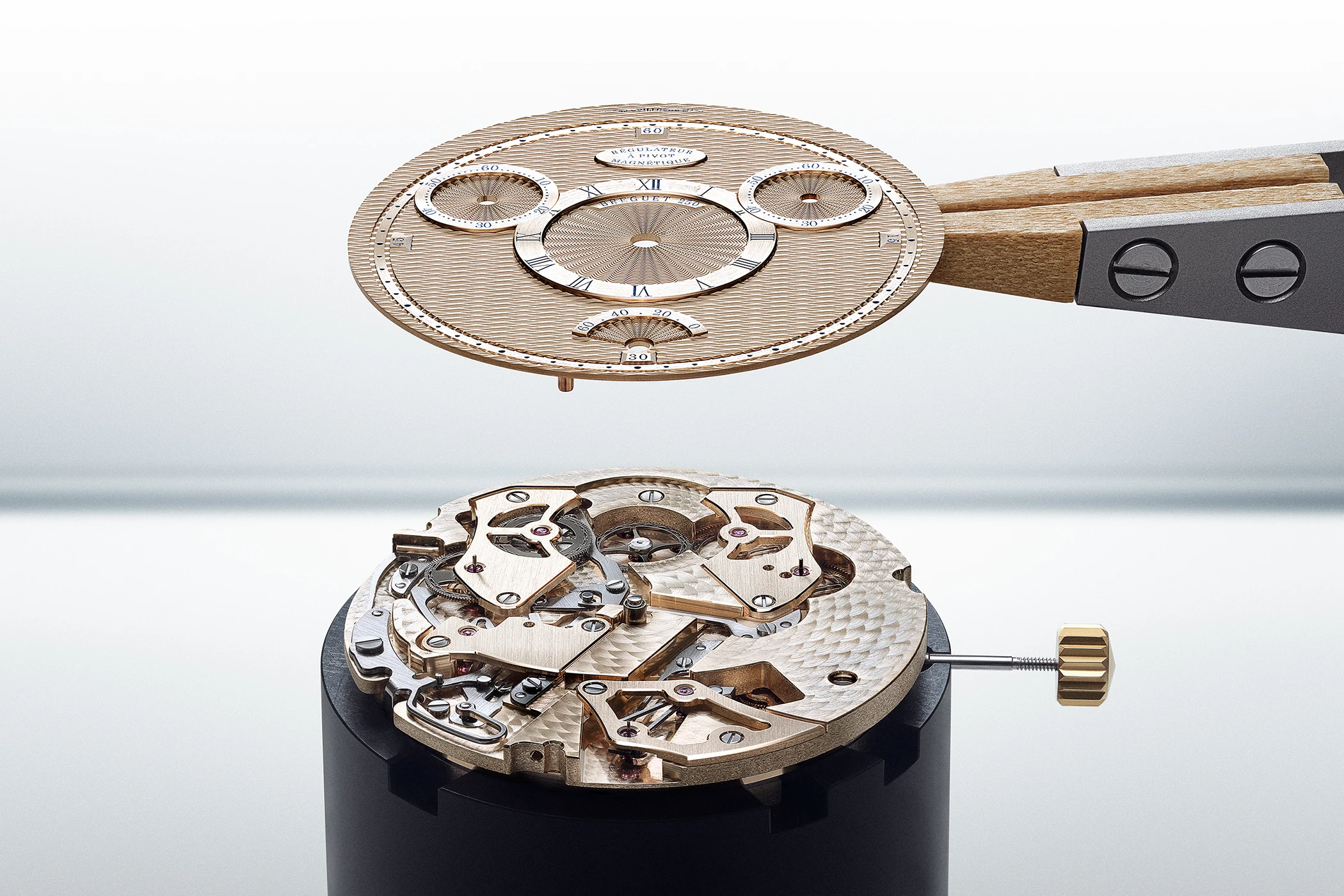 Das 41 mm große und 10,7 mm hohe Gehäuse aus 18 Karat Breguet-Gold, dessen Gehäusemittelteil ebenfalls mit dem Motiv „Quai de l’Horloge“ handguillochiert ist, offenbart durch den Saphirglasboden die magnetisch gelagerte Unruh. Zudem präsentiert sich am Gehäuse ein Drücker bei 8 Uhr, dessen Funktion besser verständlich wird, wenn man auf die Anzeigen des Zifferblatts blickt: Gestalterisch zitiert die Uhr ihr historisches Vorbild, die Taschenuhr Nr. 1176, mit einer kleinen, fächerförmigen Gangreserveanzeige bei 6 Uhr (damals 35 Stunden, heute 60 Stunden), einem handguillochierten Zifferblatt im Motiv „Quai de l’Horloge“ sowie zwei kleinen Sekundenanzeigen bei 2 und 10 Uhr, die zunächst demselben Zweck zu dienen scheinen und bereits bei der Referenz 1176 zu finden waren. Ihr Unterschied liegt jedoch im Zählsystem: Bei 2 Uhr befindet sich eine „traditionelle” kleine Sekunde, die während der gesamten Gangreserve der Uhr läuft. Bei 10 Uhr wiederum befindet sich eine sogenannte Beobachtungssekunde, die mit dem Drücker bei 8 Uhr am Gehäuse zurückgesetzt werden kann. Diese zusätzliche Funktion ermöglicht die Messung von Zwischenzeiten oder der Dauer zweier gleichzeitiger Ereignisse.