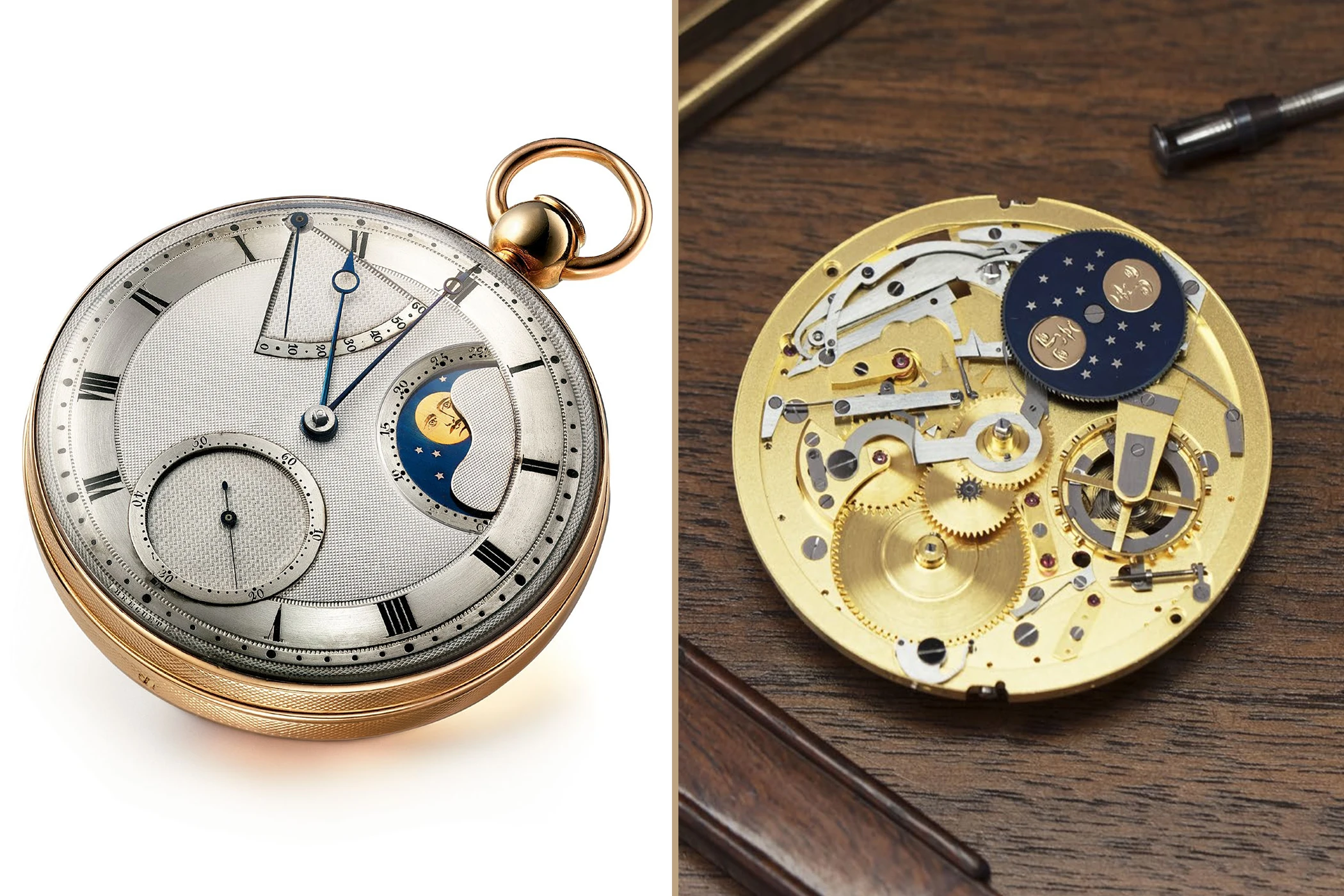 Die 7235 übernimmt deshalb die Komplikationen und Anzeigenlogik der Perpétuelle-Taschenuhr Nr. 5: Stunden und Minuten können aus der Mitte durch flammengebläute Breguet-Ringzeiger mit „Pomme“-Spitze abgelesen werden, während die Gangreserve für 40 Stunden bei 10:30 Uhr, die Mondphase bei 2 Uhr und die vertiefte kleine Sekunde – ganz wie bei der stilprägenden Perpétuelle-Taschenuhr Nr. 5 – bei 5 Uhr positioniert sind. Während der Stundenkreis über römische Ziffern verfügt, präsentieren die Anzeigen arabische Ziffern – alle sind jedoch in einem blauen Farbton ausgeführt, der sich den Zeigern optisch anpasst.