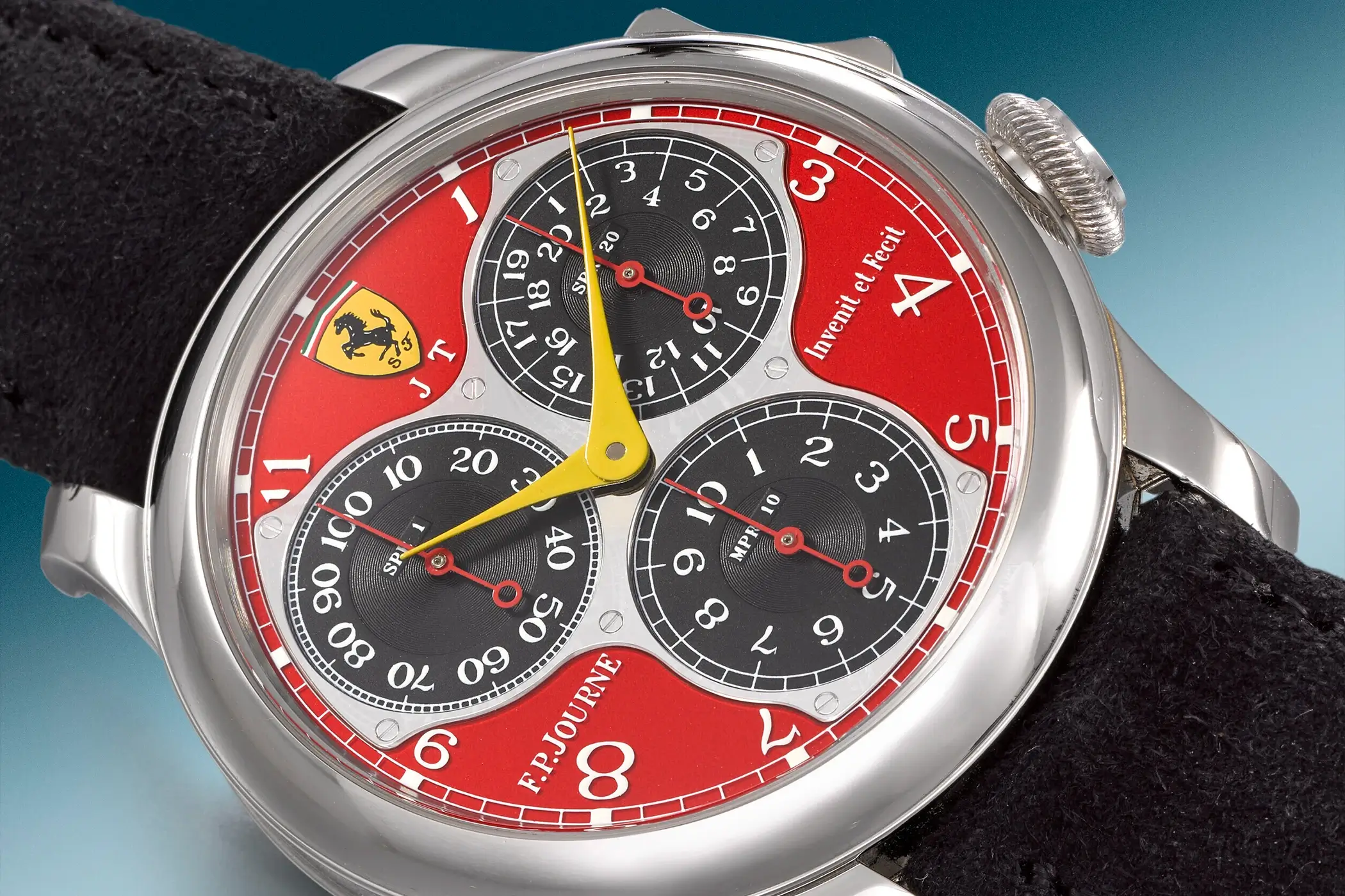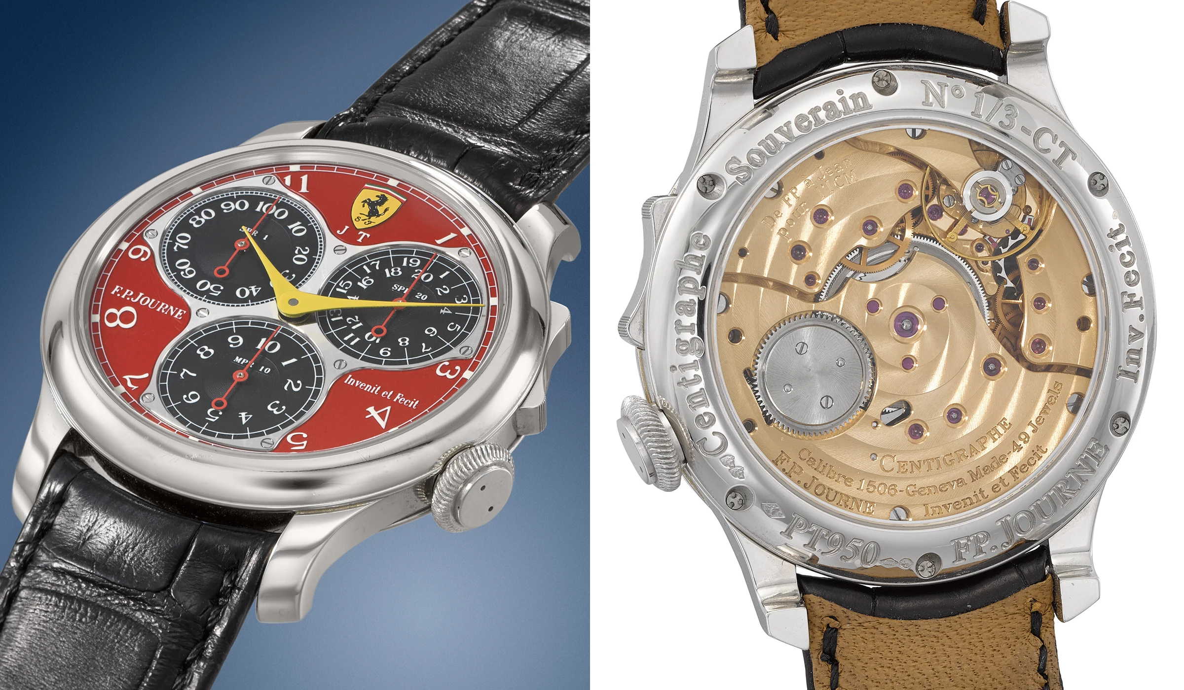 Bei der Nummer 13 unserer Liste der teuersten F.P.Journe Uhren, die jemals auf einer Auktion verkauft wurden, handelt es sich um den ersten Zeitmesser einer Kleinserie von drei Uhren, von denen der erste für Jean Todt, der zweite für Michael Schumacher und der dritte für F.P.Journe selbst gefertigt wurde. Die hier beschriebene Uhr kennzeichnet sich durch ihr ferrarirotes Zifferblatt, das mit einem Ferrari-Emblem bei zwölf Uhr sowie den Initialien „JT“ versehen ist.