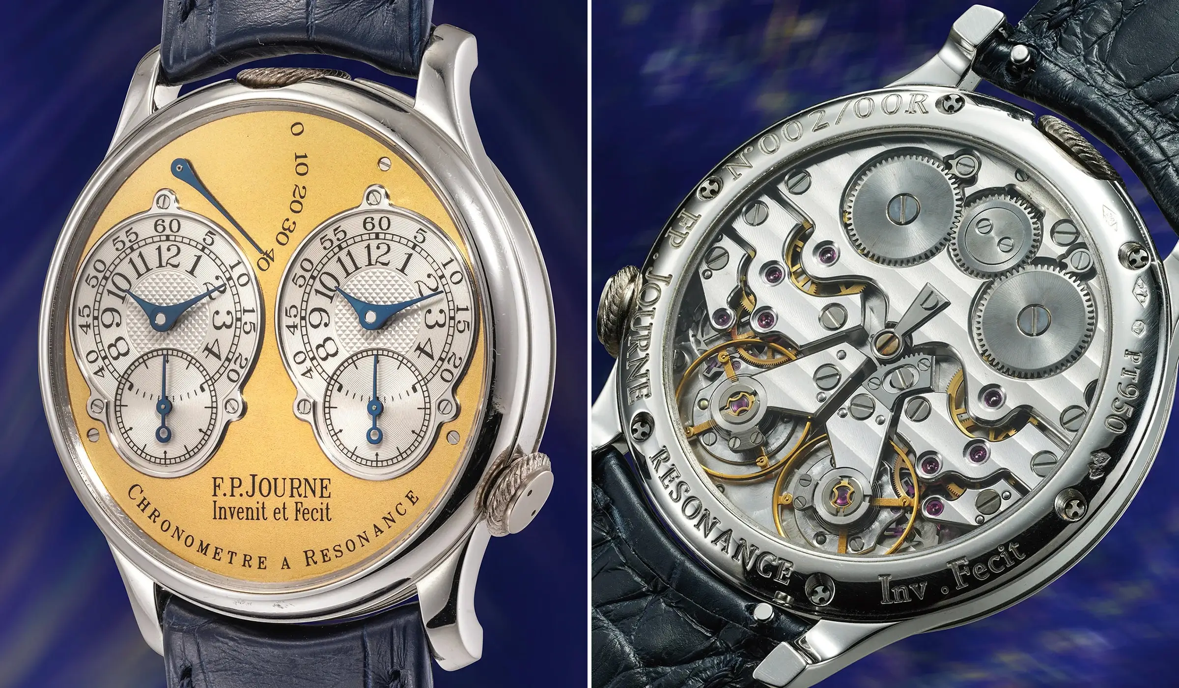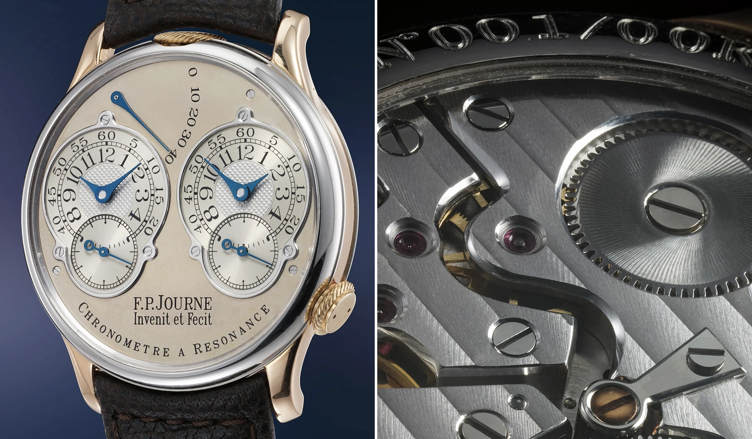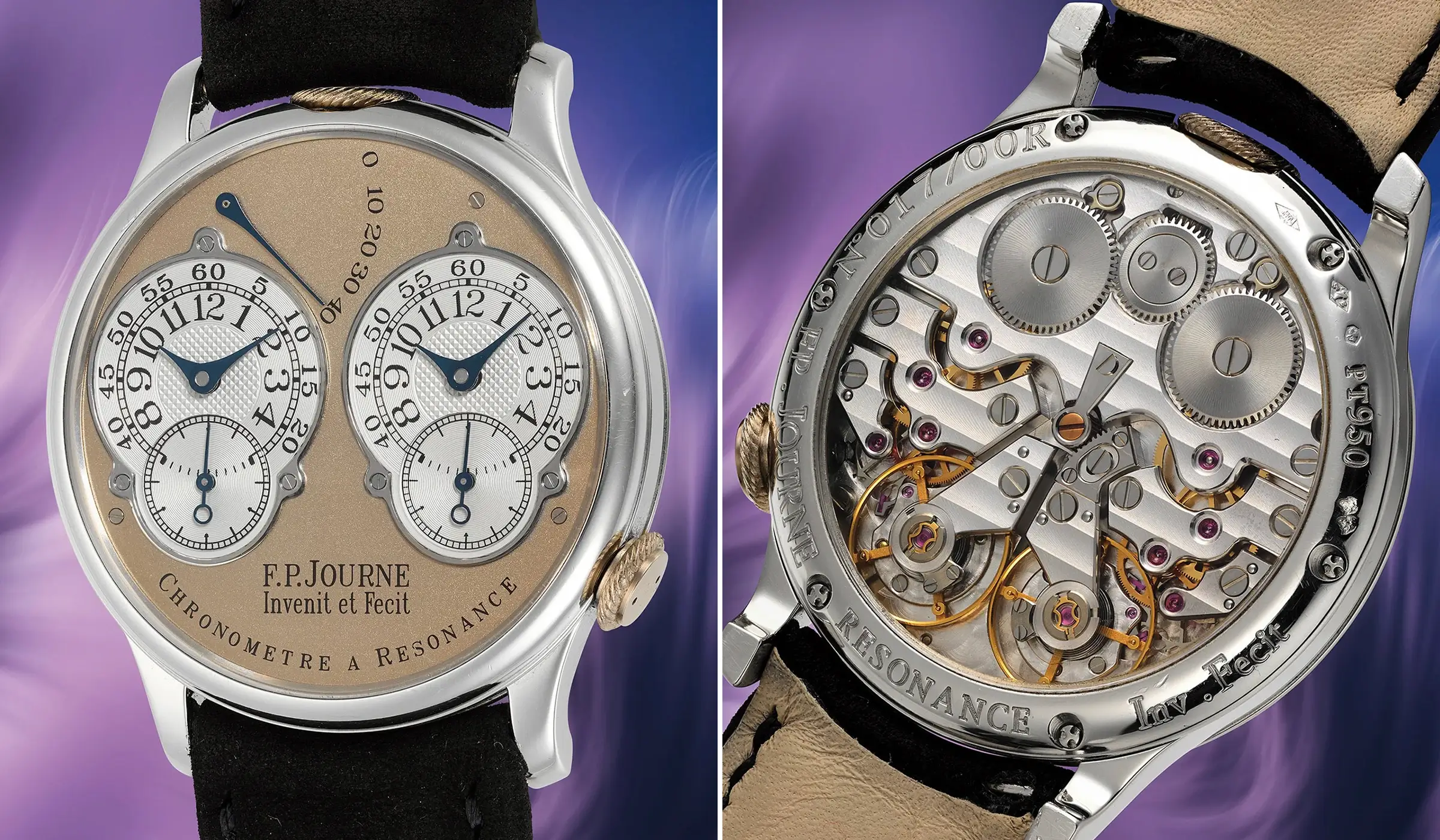 Dem Resonanzprinzip folgend, zeichnet sich die F.P.Journe Chronomètre à Résonance durch ihre charakteristischen zwei Unruhen aus, die sich auf natürliche Weise synchronisieren oder in „Resonanz“ zueinander schwingen, wodurch die negativen Einflüsse auf die Ganggenauigkeit von Arm- und Körperbewegungen reduziert werden sollen. Diese doppelte Konstruktion setzt sich auch auf dem Zifferblatt fort: Auf dem versilberten Zifferblatt befinden sich zwei separate, silbern guillochierte Anzeigen für Stunden und Minuten, deren Anordnung die Darstellung zweier unterschiedlicher Zeitzonen ermöglicht. Ergänzt werden sie darunter von zwei kleinen Sekundenanzeigen. Unterhalb dieser beiden Sekundenregister ist in klassischer F.-P.-Journe-Manier der Schriftzug „Invenit et Fecit“ eingraviert – lateinisch für „erfunden und gefertigt“ –, eine bewusste Anlehnung an die Signaturtraditionen vergangener Jahrhunderte.