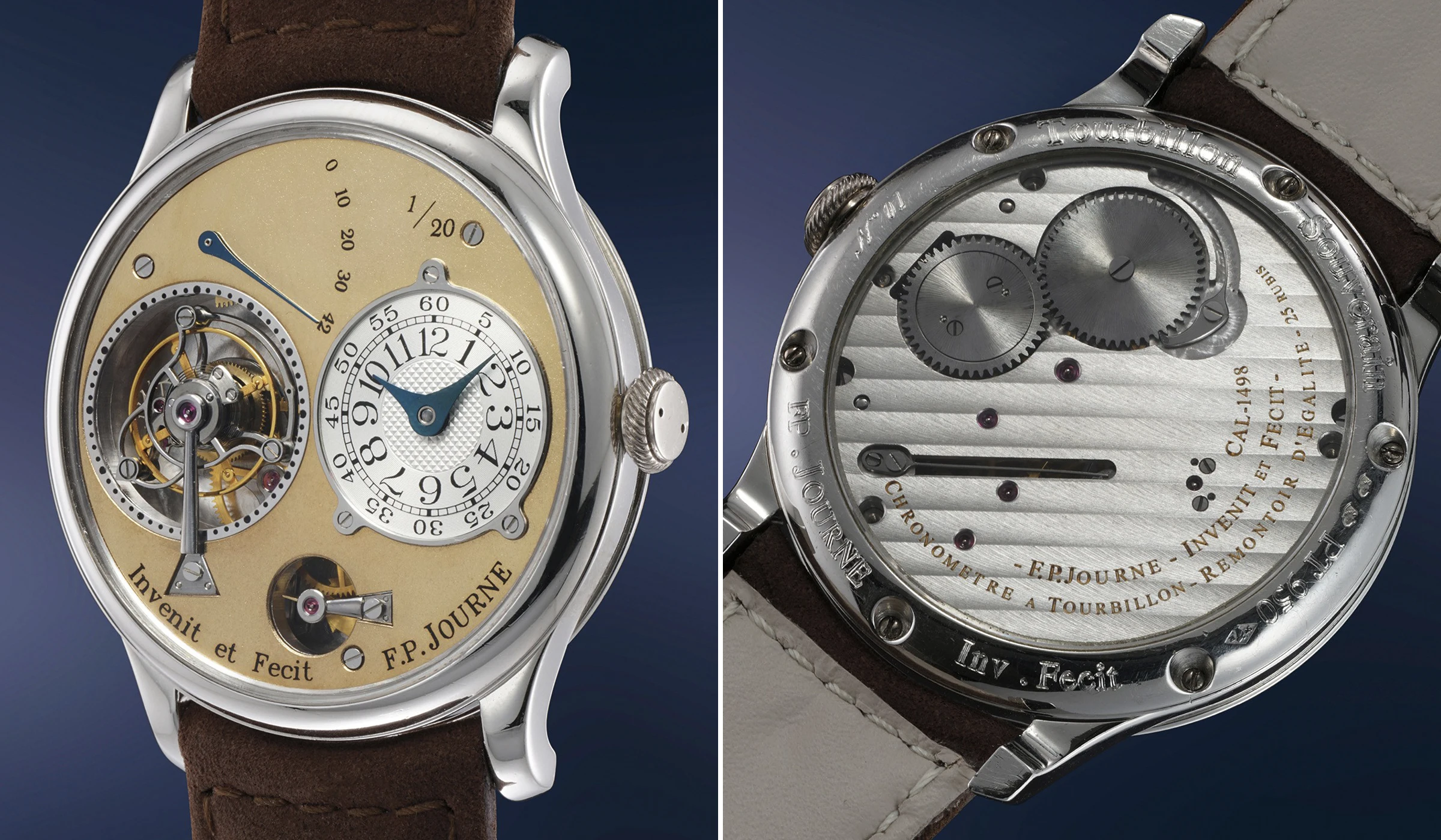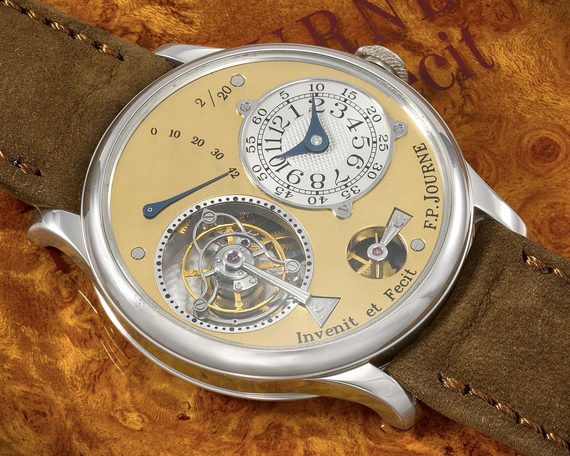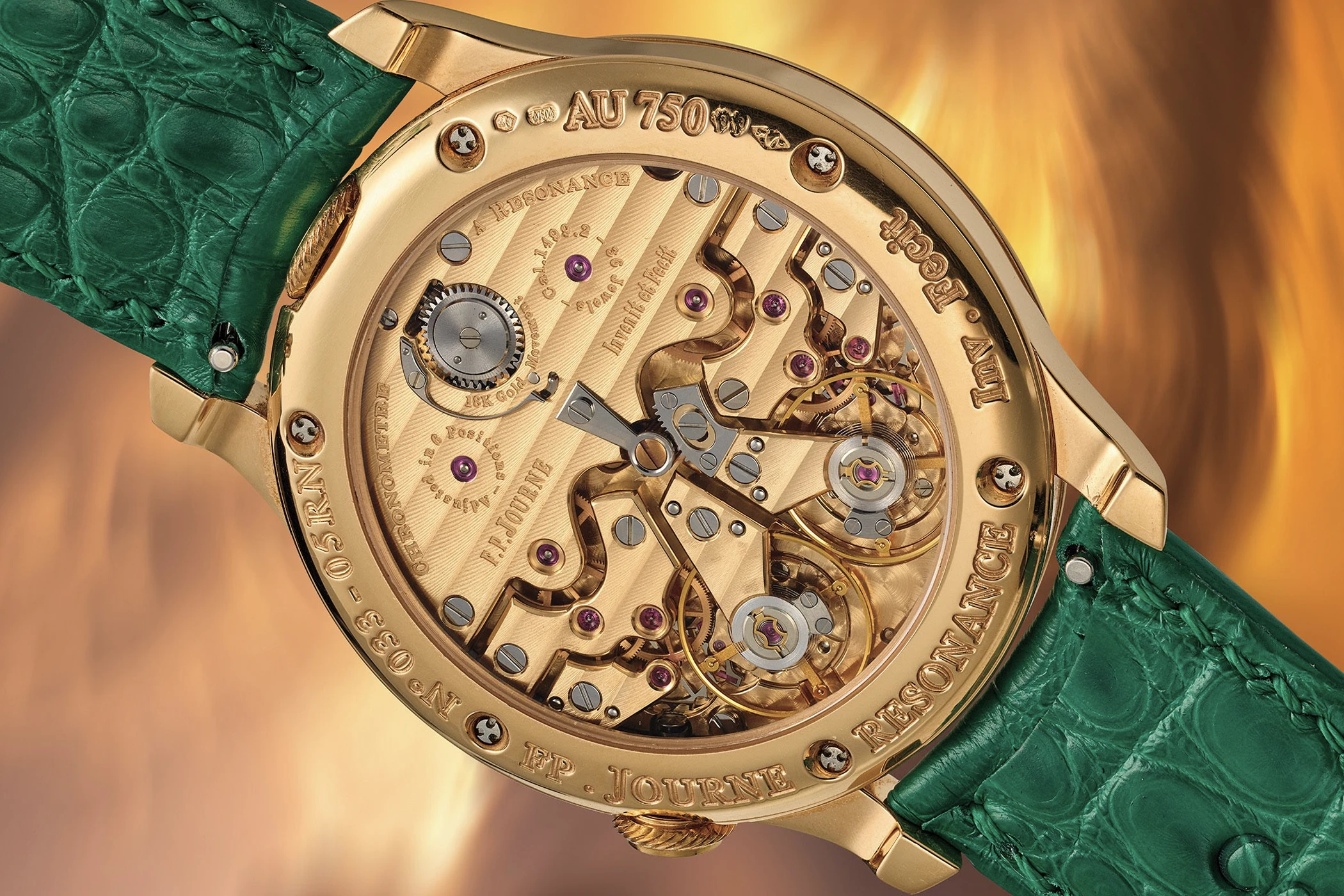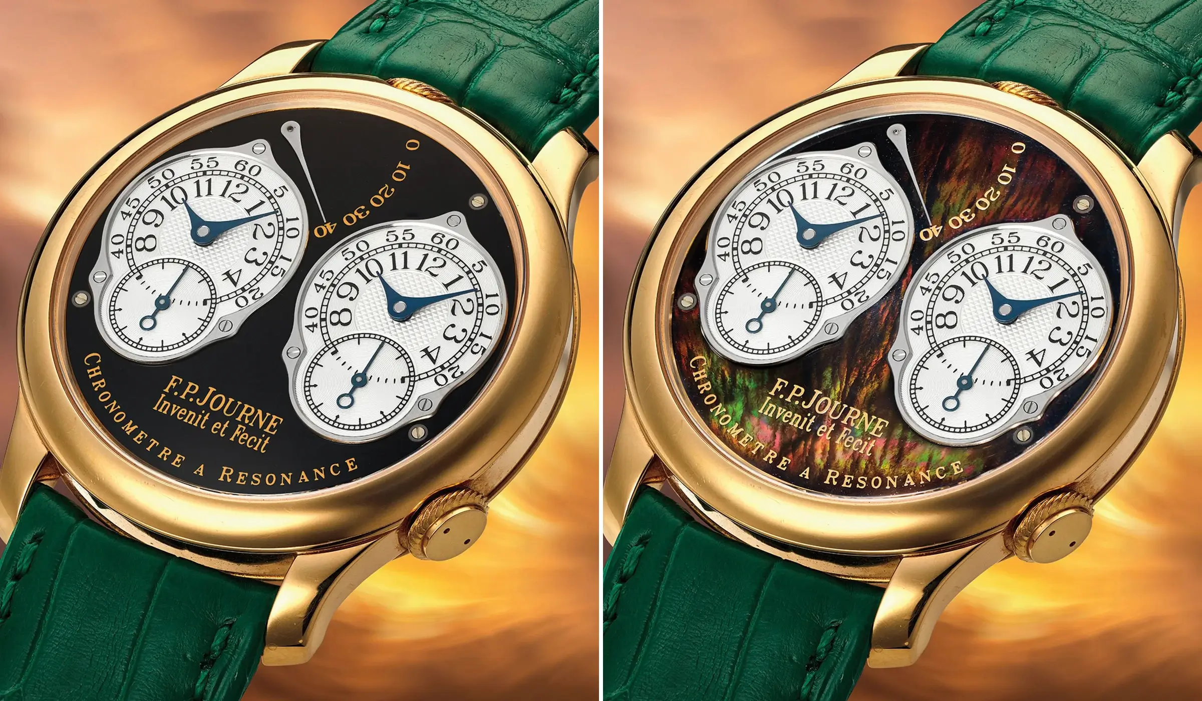 Dem Resonanzprinzip folgend, zeichnet sich die F.P.Journe Chronomètre à Résonance durch ihre charakteristischen zwei Unruhen aus, die sich auf natürliche Weise synchronisieren oder in „Resonanz“ zueinander schwingen, wodurch die negativen Einflüsse auf die Ganggenauigkeit von Arm- und Körperbewegungen reduziert werden sollen. Diese doppelte Konstruktion setzt sich auch auf dem Zifferblatt fort: Auf dem versilberten Zifferblatt befinden sich zwei separate, silbern guillochierte Anzeigen für Stunden und Minuten, deren Anordnung die Darstellung zweier unterschiedlicher Zeitzonen ermöglicht. Ergänzt werden sie darunter von zwei kleinen Sekundenanzeigen. Unterhalb dieser beiden Sekundenregister ist in klassischer F.-P.-Journe-Manier der Schriftzug „Invenit et Fecit“ eingraviert – lateinisch für „erfunden und gefertigt“ –, eine bewusste Anlehnung an die Signaturtraditionen vergangener Jahrhunderte.