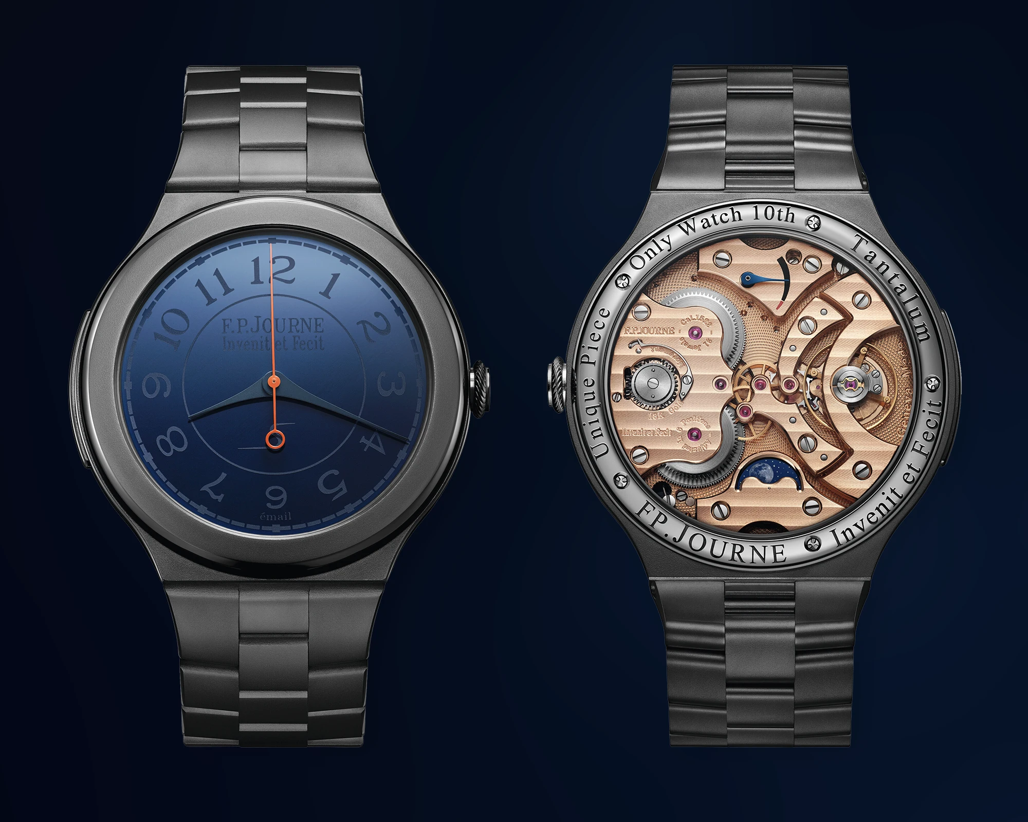 Normalerweise ist es das Letzte, was sich ein Uhrenträger wünscht, dass ein Betrachter nicht in der Lage ist, das Stück faszinierender Handwerkskunst an seinem Handgelenk zu erkennen. Mit dem Chronomètre Furtif gelingt F.P.Journe jedoch genau das. Der vollständig aus Tantal gefertigte Zeitmesser – Gehäuse wie Armband entstehen in den eigenen Werkstätten von Les Boîtiers de Genève – verdankt seinen Namen der bewussten Zurückhaltung seiner Anzeigen. Das tiefblaue, gebrannte Emaillezifferblatt wirkt aus vielen Blickwinkeln nahezu homogen, da Ziffern und Skalen Ton in Ton ausgeführt sind und erst im richtigen Lichteinfall erscheinen – einzig der orangefarbene Sekundenzeiger setzt einen gezielten Akzent. Gangreserve sowie Mondphasenanzeige sind ausschließlich beim Blick durch das Saphirglas der Gehäuserückseite erkennbar und Bestandteil des seinerzeit neuen Handaufzugskalibers 1522, das erstmals in der Geschichte von F.P.Journe einen zentralen Sekundenanzeiger integrierte.