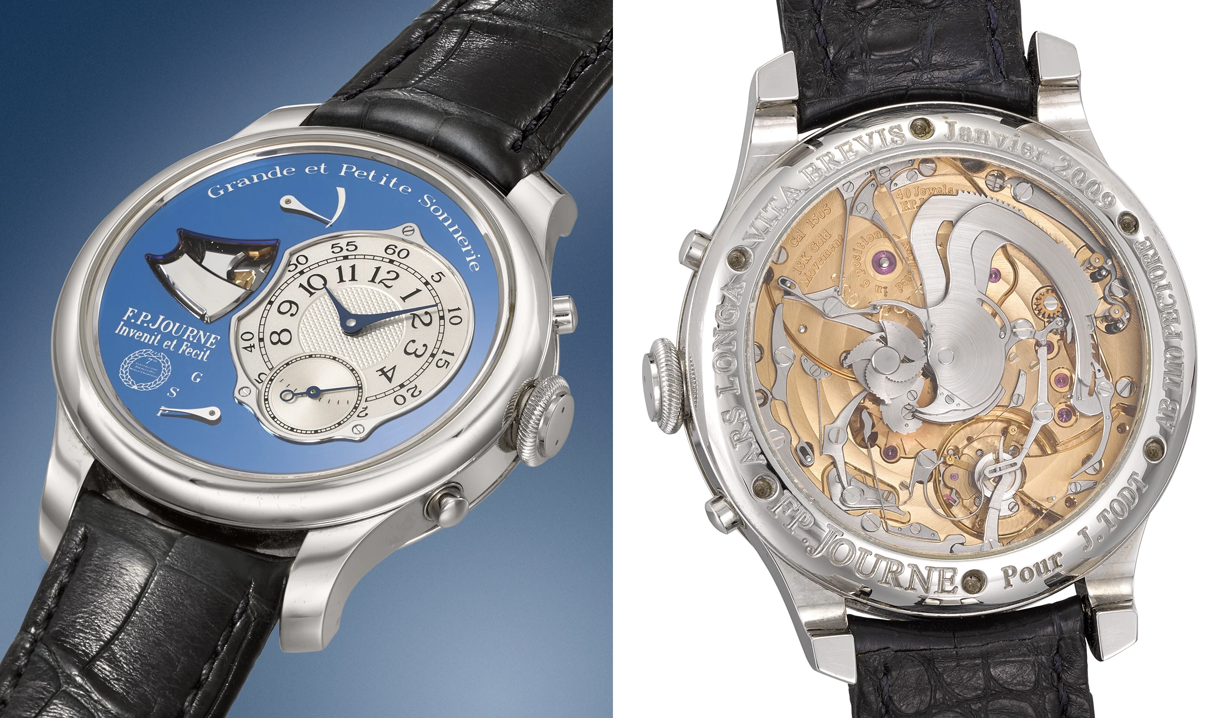 Allen voran steht das innerhalb der Kollektion einzigartige spiegelpolierte Zifferblatt in Petrolblau, das zudem mit dem Logo des siebten Formel-1-Konstrukteursweltmeistertitels der FIA versehen ist. Der Gehäuseboden trägt neben dem Namen des ursprünglichen Besitzers unter anderem auch die lateinische Inschrift „ARS LONGA, VITA BREVIS“, entnommen den einleitenden Zeilen der Aphorismi des antiken griechischen Arztes Hippokrates und sinngemäß zu verstehen als „die Kunst ist lang, das Leben kurz“. Im Inneren der Uhr befindet sich das handaufgezogene Goldkaliber 1505 der Sonnerie Souveraine, das ebenfalls mit dem Namen des Erstbesitzers graviert wurde und zugleich das erste Uhrwerk von F.P.Journe war, das vollständig in den eigenen Genfer Ateliers gefertigt wurde. Das Uhrwerk kombiniert eine Grande- und Petite-Sonnerie mit einer Minutenrepetition, wodurch sowohl ein automatisches akustisches Schlagen der Stunden und Viertelstunden – je nach Betriebsmodus – als auch eine Minutenrepetition auf Abruf ermöglicht wird.