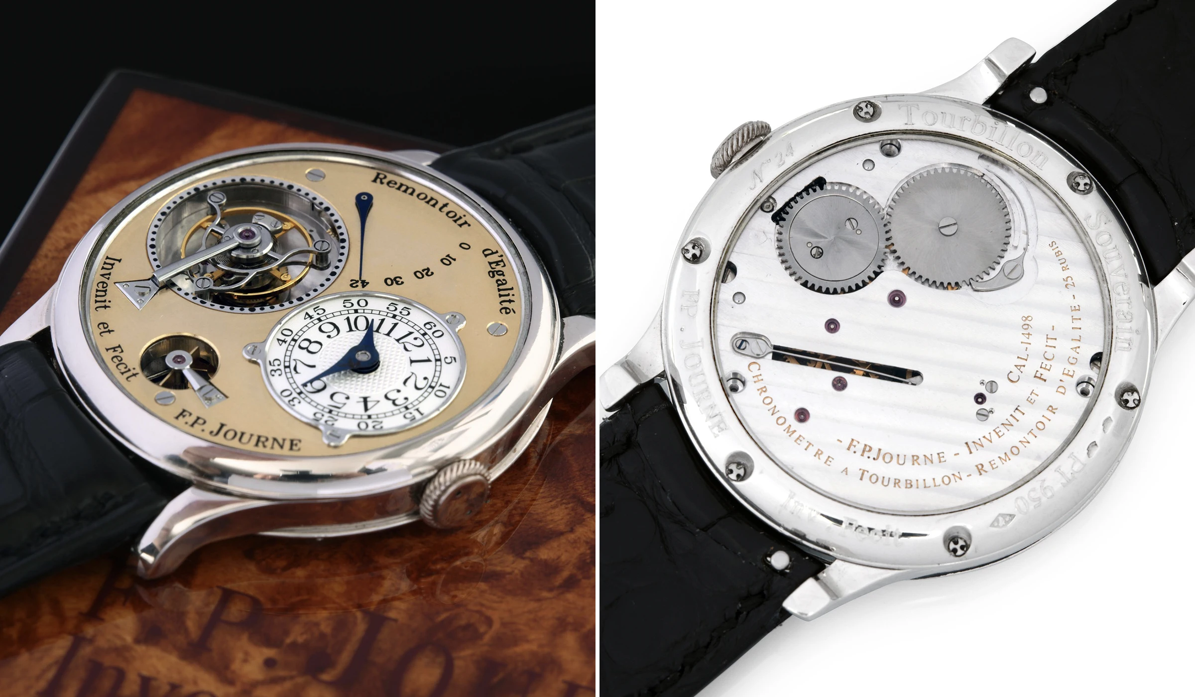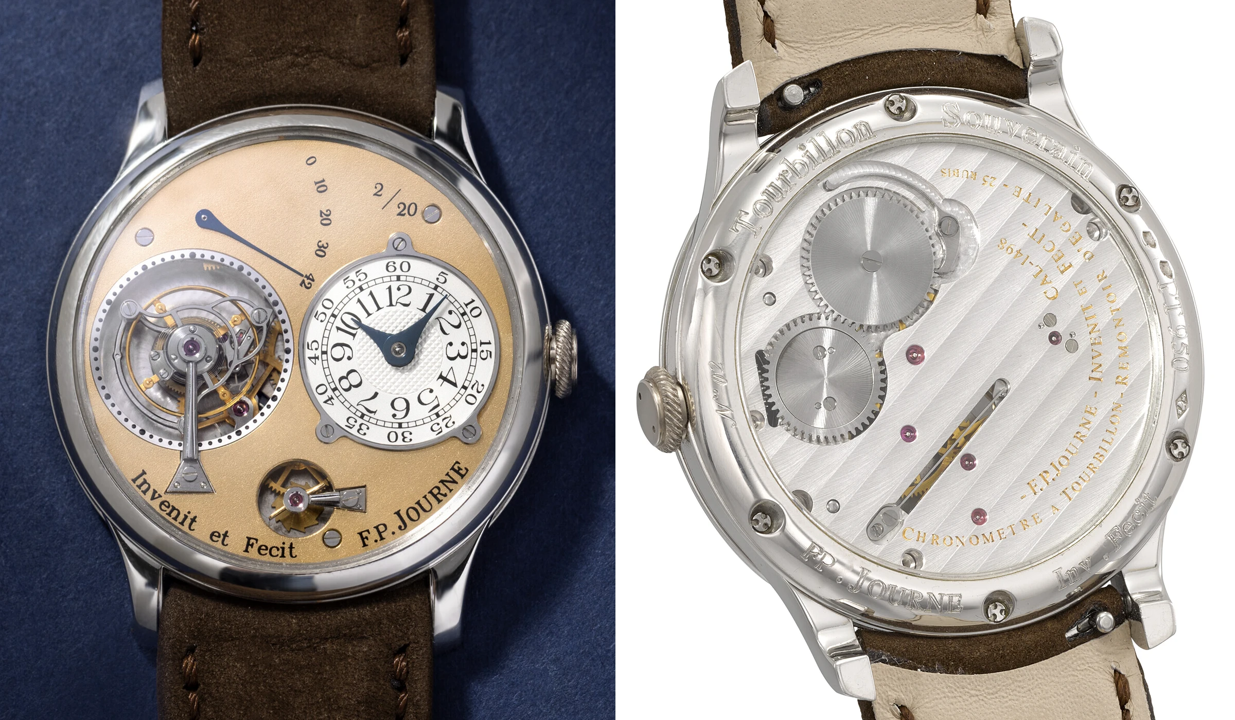 Die Nummer 8 unserer Liste verfügt gleich über mehrere Besonderheiten, die den hohen Verkaufspreis erklären lassen: Die Tourbillon Souverain à Remontoir d’Egalité mit der Nummer 24 auf dem Gehäuse ist nicht nur ein Unikat mit einem 38 mm Platingehäuse, sie ist zudem die letzte Uhr, die direkt von François-Paul Journe persönlich veräußert wurde. Darüber hinaus zeigt die Uhr einige besondere Merkmale ästhetischer Natur. Die Inschriften auf dem Gehäuseboden wurden von Hand graviert und fallen deutlich flacher aus als die später bei nachfolgenden Exemplaren mittels Laser aufgebrachten, tieferen Gravuren. Das Zifferblatt aus Gelbgold ist vergleichbar mit jenen der von Hand finissierten Ausführungen des Tourbillon Souverain à Remontoir d’Égalité – etwa den Exemplaren Nummer 13 und Nummer 15 –, und nicht zuletzt sind die Anzeigen der kleinen Sekunde um den Tourbillonkäfig größer ausgeführt und von Hand finissiert.