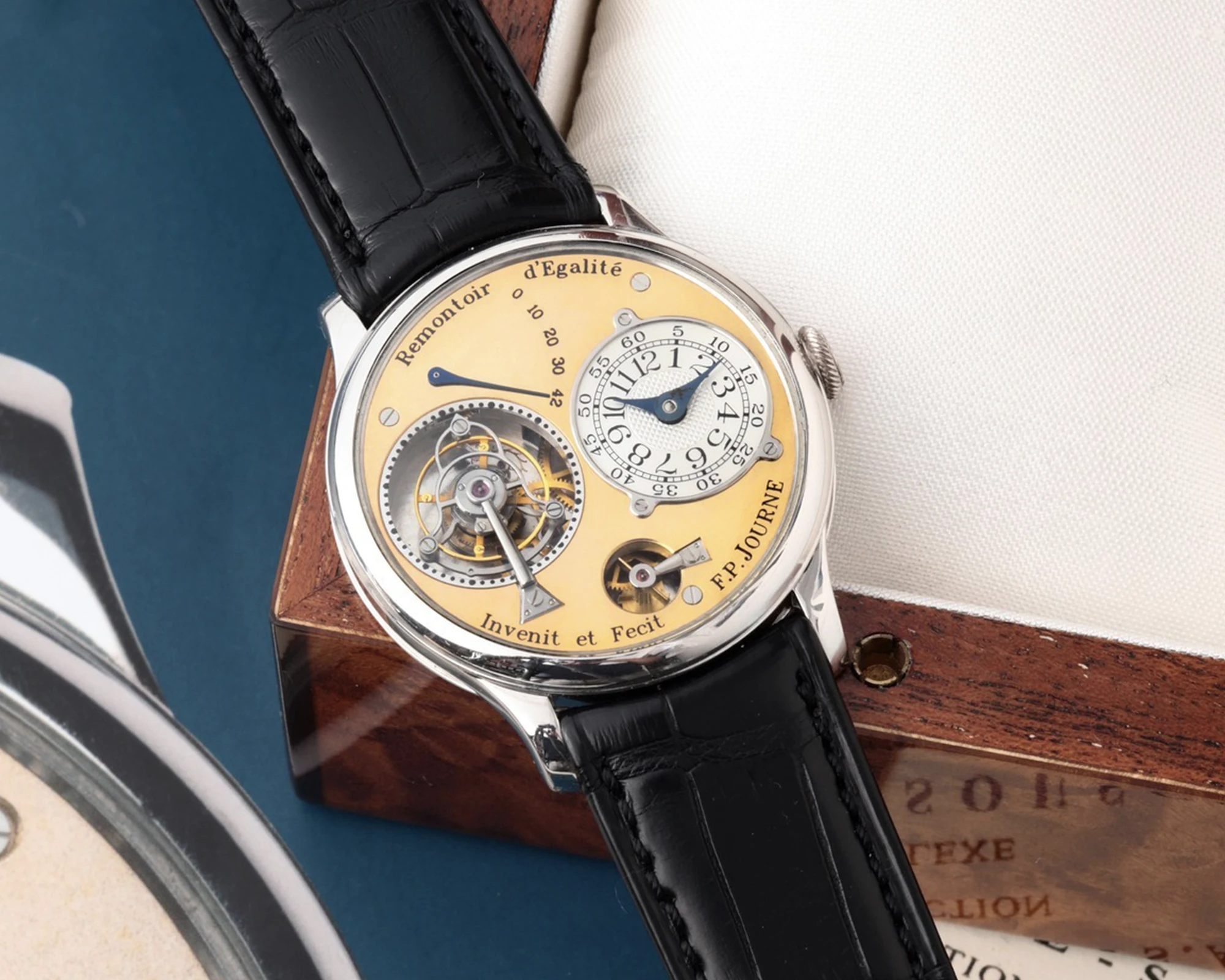 Die frühen Tourbillon Souverain à Remontoir d’Egalité-Modelle mit Messingwerk, zu denen auch die Nummer 8 unserer Liste der teuersten, jemals auf einer Auktion verkauften F.P.Journe Uhren zählt, lassen sich in vier klar voneinander abgrenzbare Serien einteilen. An vorderster Stelle steht die erste Serie, die die sogenannten Souscription-Modelle von 1999 umfasst. Zunächst entstanden zwanzig nummerierte Exemplare in Platin, die direkt von François-Paul Journe selbst verkauft wurden. Ergänzt wurde diese Gruppe im selben Jahr durch eine zweite Souscription-Phase mit lediglich zwei Einzelstücken: einem Unikat in Roségold sowie einem Unikat in Platin – der hier beschriebenen Uhr. Beide waren mit dem Schriftzug Remontoir d’Égalité auf dem Zifferblatt versehen, und auch diese Uhren wurden direkt von François-Paul Journe persönlich veräußert.