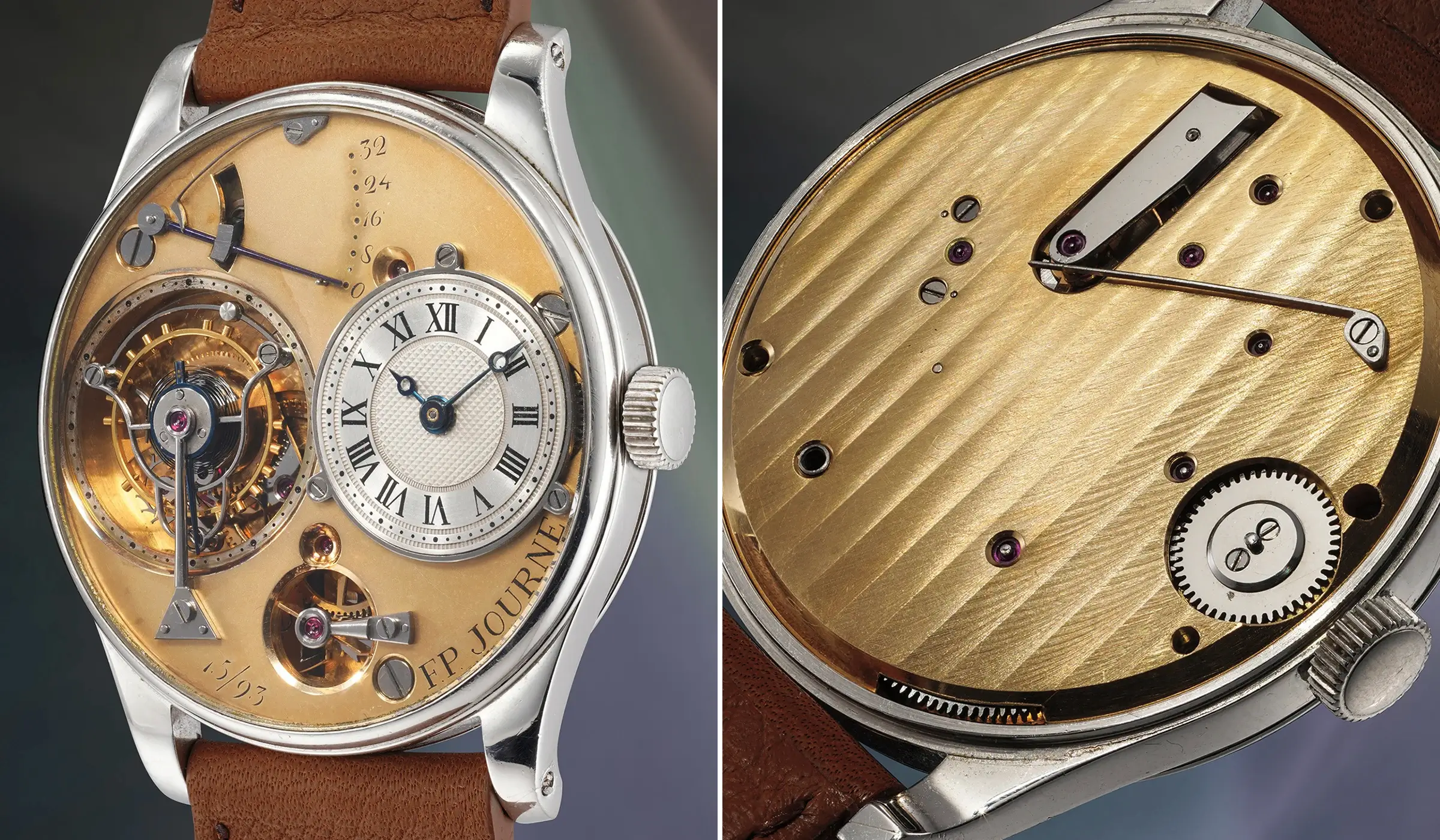 Im Jahr 1993 fertigte Journe dann mit der Tourbillon à Remontoire d’Egalité „15/93“ die nunmehr zweitteuerste, jemals auf einer Auktion verkaufte F.P.Journe Uhr an. Diese Uhr beschreibt der Uhrmacher selbst mit den Worten: „Diese erste Tourbillon-Armbanduhr zollt fünf Uhrmachern Tribut: Abraham-Louis Breguet als Erfinder des Tourbillons, Ernest Guinand für die Form des Tourbillonkäfigs, Jost Bürgi für das Remontoir-System, Ferdinand Berthoud für die Gesamtästhetik – und mir selbst, da sie Jahrzehnte an Erfahrung und Lernprozess widerspiegelt.“ Viele der hier gezeigten Merkmale sollten später identitätsstiftend für die späteren Zeitmesser von Journe werden. Dazu zählt vor allem das goldene „Zifferblatt“, das streng genommen keines ist, sondern die Grundplatine des Uhrwerks selbst darstellt. Da sowohl Grundplatine als auch Brücken aus massivem Gold gefertigt sind, entspricht das sichtbare Zifferblatt aus Gelbgold der Unterseite dieser Grundplatine. Bei den später serienmäßig produzierten Modellen des Tourbillon Remontoir d’Égalité wechselte François-Paul Journe zunächst zu Brücken aus Messing. Erst 2004 kehrte er zur vollständig aus Gold gefertigten Werkarchitektur zurück – ein Merkmal, das sich seither als eines der zentralen Kennzeichen der Marke etabliert hat. Auch das Gehäuse nimmt mit einem Durchmesser von 38 Millimetern bereits weitgehend die späteren Proportionen vorweg. Dennoch unterscheidet es sich in einigen Details von späteren Ausführungen des Modells, insbesondere durch eine deutlich ausgeprägte Stufe in der Lünette, breitere Bandanstöße sowie verschraubte Bandstege.