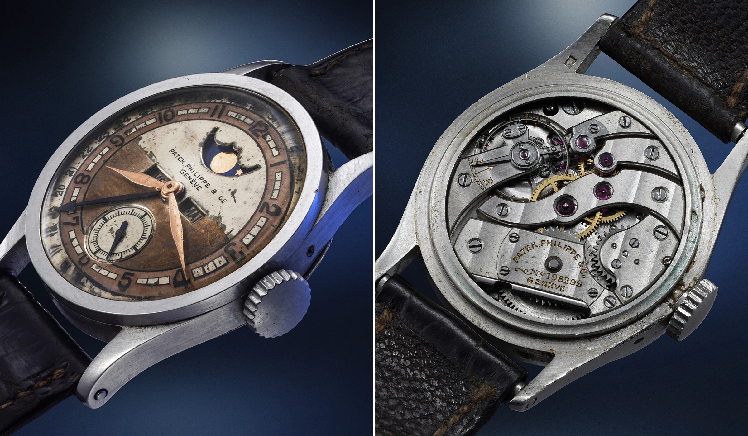 Aisin-Gioro Puyis Uhr ist trotz ihres erheblichen Alters unangetastet und völlig in ihrem Originalzustand erhalten – einschließlich Armband und Schließe mit stimmiger Patina. Die Authentizität wird zusätzlich durch einen Patek-Philippe-Archivauszug bestätigt, der festhält, dass die Uhr mit einem versilberten Zifferblatt, roségoldenem Ring und emaillierten Stundenmarkierungen ausgeliefert wurde. Doch verfügt die Platin-Referenz 96 QL mit französischem Kalender über eine eigentümliche, halb elfenbeinfarbene, halb messingfarbene Verfärbung, die sich, anders als bei den beiden anderen bekannten Exemplaren mit roségoldenem Roulette-Ring, entlang der oberen Kante der Kalenderfenster in zwei Bereiche aufteilt. Eine Antwort auf die Frage, wie diese ungewöhnliche Patina zustande gekommen ist, fand Phillips in einem Interview von 1982, in dem Li Guoxiong, Puyis langjähriger Diener, von diesem Vorgang berichtete: Während der fünf Jahre in der Sowjetunion bat Puyi Li eines Tages, die Uhr zu öffnen und – in der Annahme, das Zifferblatt sei wie das Gehäuse ebenfalls aus Platin gefertigt – die Oberfläche abzutragen, um die Materialschichten zu prüfen. Nachdem Li die Oberfläche abgetragen und festgestellt hatte, dass das Zifferblatt aus Messing bestand, wies Puyi seinen Diener an, nicht mehr an der Uhr zu arbeiten – dadurch entstand die ungewöhnliche halbkreisförmige Patina des Zifferblatts.