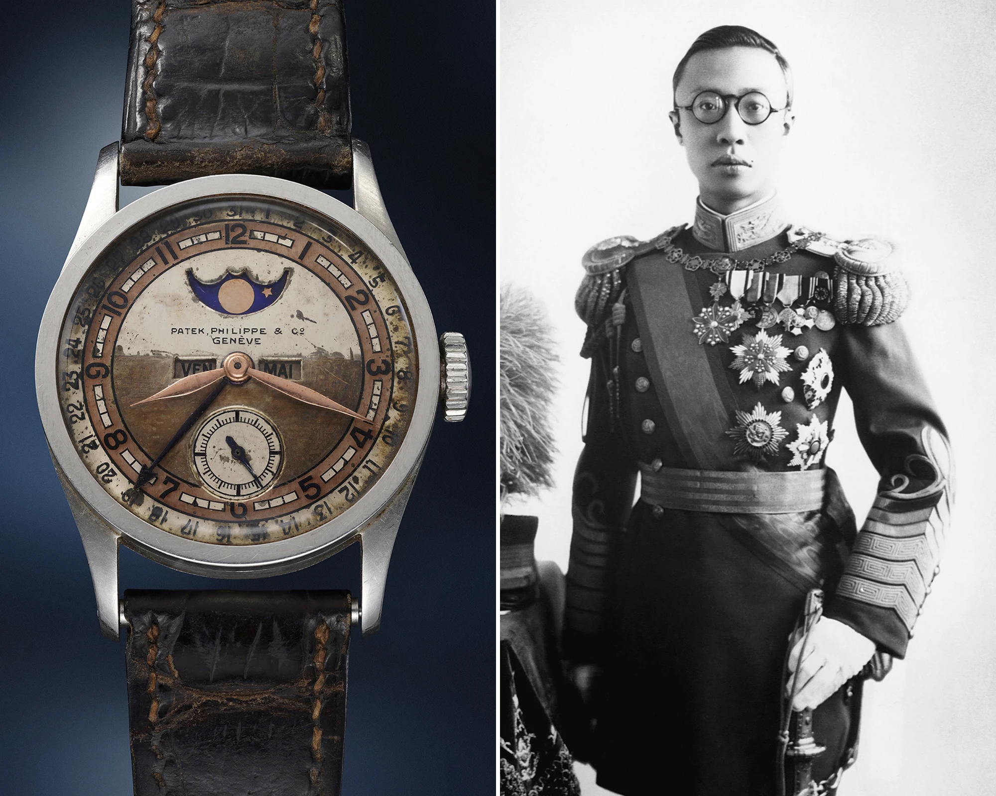 Aisin-Gioro Puyi bestieg 1908 im Alter von nur zwei Jahren den Thron und war von 1908 bis 1912 zugleich zwölfter und letzter Kaiser der Qing-Dynastie, der Herrscherdynastie des chinesischen Kaiserreichs. Doch als das jahrhundertealte chinesische Kaisersystem, verstärkt durch die Xinhai-Revolution von 1911, im Inneren politisch und gesellschaftlich zu kollabieren begann, musste Aisin-Gioro Puyi – um einen Bürgerkrieg zu vermeiden – formell abdanken und die Republik China wurde ausgerufen. Im Gegenzug dazu durfte der seinerzeit erst sechsjährige Puyi bis 1924 in der Verbotenen Stadt leben und finanzielle Privilegien genießen. Nachdem mehrere in den folgenden Jahren angesetzte Bestrebungen, Macht und Einfluss zurückzuerlangen, größtenteils erfolglos blieben, versuchte der entthronte Monarch im Jahr 1945 nach Japan zu fliehen und wurde dabei von sowjetischen Truppen aufgegriffen und im Kriegsgefangenenlager von Chabarowsk interniert. Hier genossen neben ihm Offiziere, Minister und hohe Beamte verhältnismäßig milde Bedingungen. Dort war es, dass ihn ein loyaler Dolmetscher namens Georgij Permjakow unterstützte, dem Puyi seine Patek Philippe Uhr im Jahr 1950 als Geschenk überreichte. Puyi blieb schließlich bis zum August 1950 in sowjetischer Haft, ehe man sich nach dem Sieg Mao Zedongs im Chinesischen Bürgerkrieg dazu entschied, den letzten Kaiser an die Volksrepublik China auszuliefern, wo er weitere neun Jahre inhaftiert wurde.