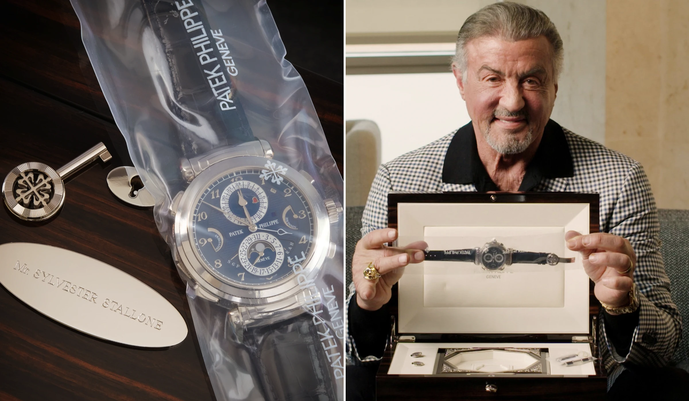 Die Nummer 15 der teuersten Patek Philippe Armbanduhren, die jemals auf einer Auktion verkauft wurden, zählte zur aus elf Stück bestehenden Uhrensammlung des US-amerikanischen Schauspielers Sylvester Stallone. Stallones Ref. 6300G-010 Grandmaster Chime konnte bei der Important Watches Auktion des Auktionshauses Sotheby’s im Jahr 2024 einen Gesamtpreis inklusive Aufgeld von 4.970.362 Euro erzielen.