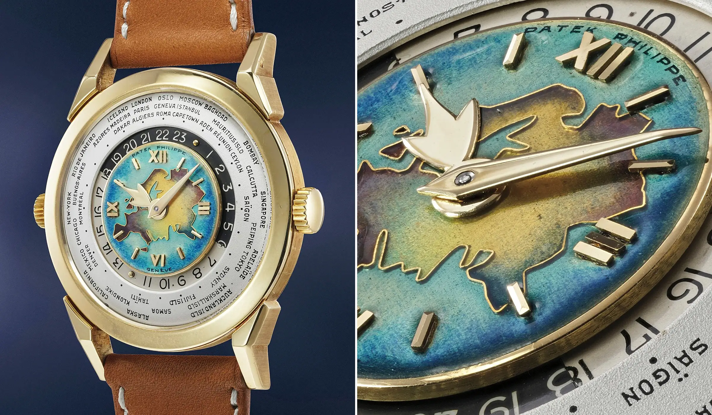 Auf Platz 11 der teuersten Patek Philippe Armbanduhren, die auf einer Auktion verkauft wurden, befindet sich die Ref. 2523 „Eurasia“, „Silk Road“. Dieses Weltzeitmodell mit zwei Kronen und einem seltenen Cloisonné-Emailzifferblatt erzielte seinerzeit den höchsten Preis, der jemals für eine Gelbgold-Armbanduhr auf einer Auktion erzielt wurde. Die erst kürzlich im Jahr 2021 entdeckte Uhr aus dem Jahr 1953 misst 36 mm und hat ein Zifferblatt mit der Darstellung Eurasiens. Die Weltzeitkomplikation besteht aus zwei Ringen: einem verstellbaren Ring mit den 24 Zeitzonen und einem zweiten 24-Stunden-Ring, der sich gegen den Uhrzeigersinn dreht. So kann die korrekte Zeit für jede Stadt auf dem jeweils benachbarten Segment des 24-Stunden-Rings abgelesen werden.