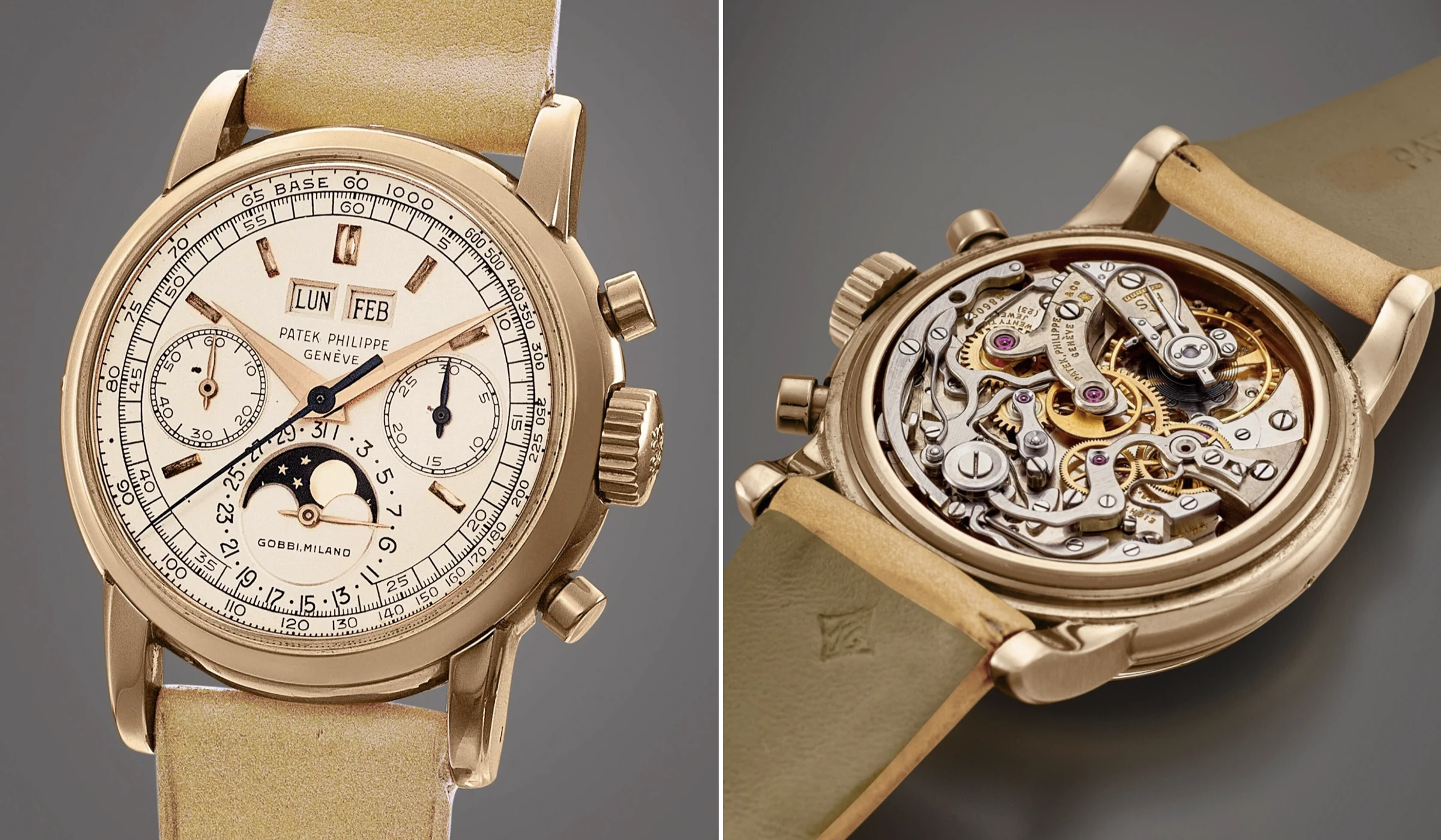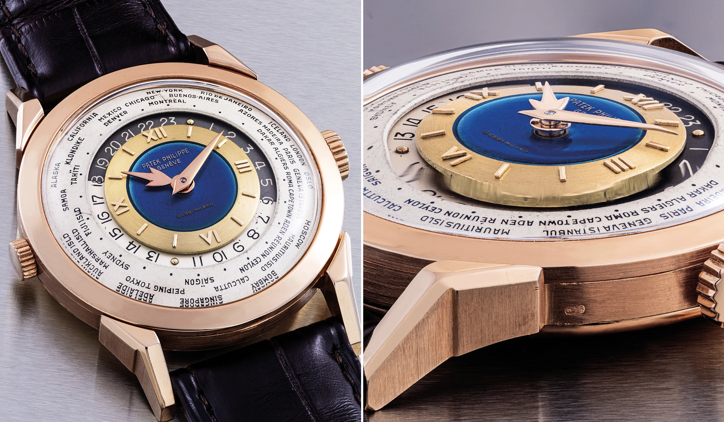 Beim Platz 6 der Liste der teuersten Patek Philippe Uhren, die jemals auf einer Auktion verkauft wurden, handelt es sich um eines der lediglich sieben Exemplare der Referenz 2523, die in Roségold gefertigt wurden und die gleich aus mehreren Gesichtspunkten eine besondere Stellung innerhalb dieser Gruppe einnimmt: Als erst das fünfte Exemplar der Referenz 2523 in Roségold, das jemals bei einer Auktion angeboten wurde, entstand diese Uhr 1953 und wurde im April 1957 an den angesehenen Patek-Philippe-Händler Gobbi in Mailand verkauft. Dadurch handelt es sich um die einzige bekannte Referenz 2523, die sowohl die Signatur von Patek Philippe als auch jene des Mailänder Händlers Gobbi trägt. Die Funktionsweise der Uhr erfolgt folgendermaßen: Zunächst wird über die Krone bei 3 Uhr die lokale Zeit eingestellt, wobei sich der 24-Stunden-Ring entgegen den Zeigern dreht. Anschließend wird über die Krone bei 9 Uhr der äußere Städtering so justiert, dass der aktuelle Standort auf 12 Uhr steht. Nach dieser Kalibrierung lässt sich die jeweilige Zeit aller Weltstädte unmittelbar ablesen. Der zweifarbige 24-Stunden-Ring unterscheidet Tag- und Nachtzeiten durch einen silbernen Bereich für den Tag und einen grauen für die Nacht.