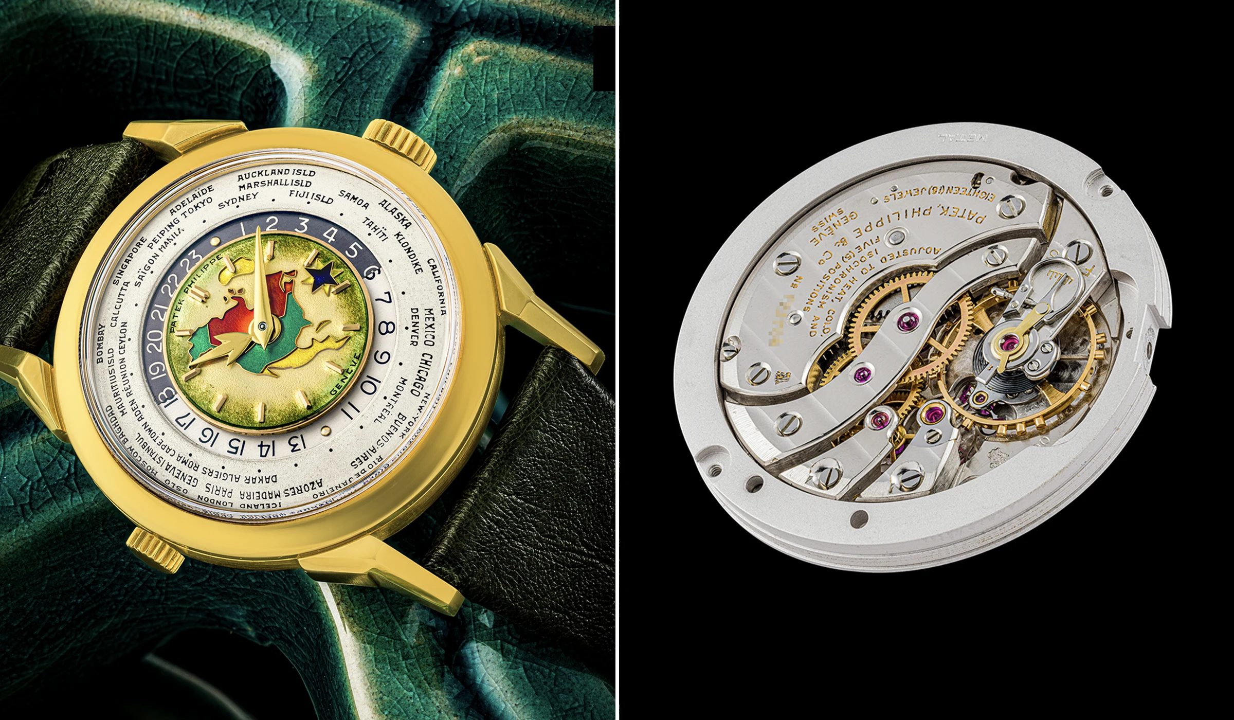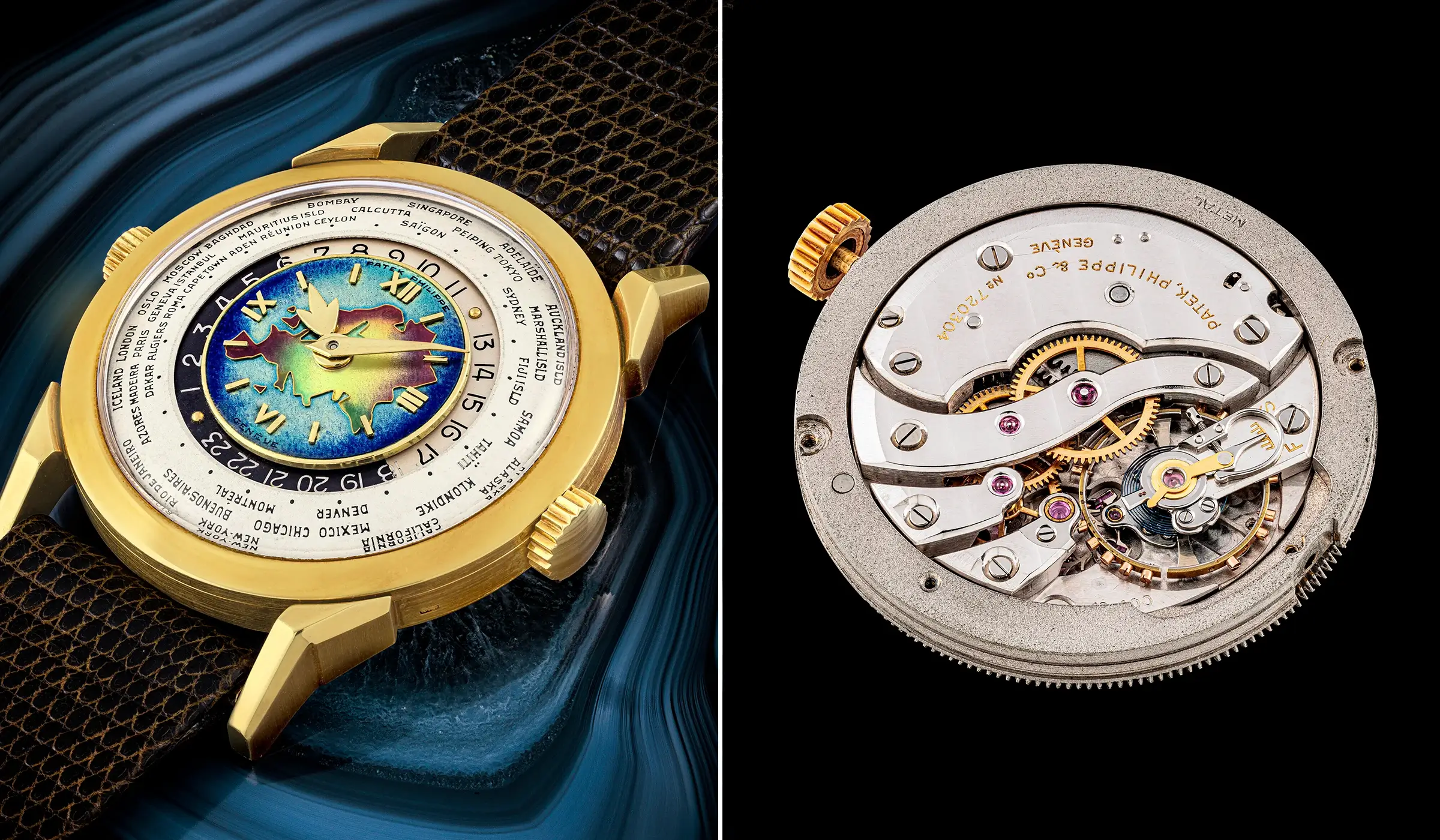 Das handgefertigte Cloisonné-Emailzifferblatt der hier beschriebenen Uhr wird der Emailkünstlerin Marguerite Koch zugeschrieben, die nahezu ausschließlich für die Zifferblattmanufaktur Stern Frères tätig war. Für das 35,5-mm-Gehäuse mit der Nummer 306’201, das 1954 und 1955 gefertigt wurde, griff Patek Philippe auf den Gehäusemacher Antoine Gerlach zurück, dessen Punze – eine „4“ in einem Schlüssel – sich im Inneren des Bodens befindet. In dieses Gehäuse verbaute Patek Philippe das im Jahr 1953 gefertigte Kaliber 12-400 HU (Heures Universelles), das über die Werknummer 720’304 verfügte und mit der von Louis Cottier entwickelten Modifikation für das Weltzeitsystem ausgestattet ist.