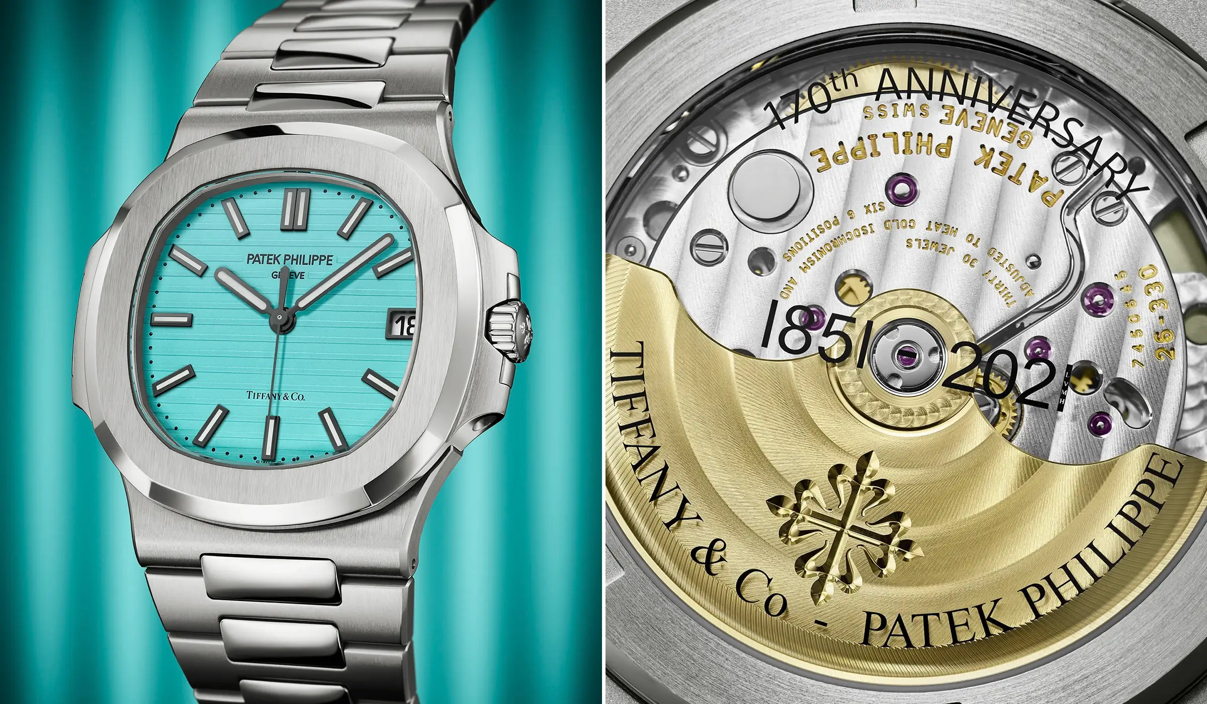 Die Nautilus Referenz 5711 stellte bei ihrer Lancierung im Jahr 2006 eine moderne Weiterentwicklung der ersten Luxus-Sportarmbanduhr von Patek Philippe dar, die 1976 als Referenz 3700 vorgestellt wurde. Mit der Einführung der Referenz 5711 wurde die Nautilus durch gezielte Anpassungen in die Gegenwart überführt – unter anderem durch einen Saphirglasboden sowie ein hauseigenes Automatikwerk mit Zentralsekunde. Von den insgesamt 170 Exemplaren, die von der Nautilus Ref. 5711/1A-018 gefertigt wurden, wurden alle ausschließlich über Tiffany-Boutiquen in New York, Beverly Hills und San Francisco vertrieben – mit einer einzigen Ausnahme: der hier beschriebenen Uhr. Dieses Exemplar galt zugleich als die erste Uhr der Serie, die verkauft wurde, und stand dem erfolgreichen Bieter der Phillips-Auktion zur sofortigen Auslieferung zur Verfügung. Die Uhr wurde nicht nur deshalb besonders, da es sich um die erste Nautilus handelte, die mit einem Tiffany-Zifferblatt erschien, sie war zudem die letzte Ausführung der mit dem Automatik-Kaliber 26-330 S C ausgestatteten Referenz 5711, deren Produktion im Jahr 2022 endete. Ein Verweis auf die Kollaboration der beiden Marken ist zum einen auf dem Zifferblatt mit einer Doppelsignatur „Tiffany & Co.“ bei 6 Uhr sowie dem Patek-Philippe-Logo bei 12 Uhr – beide in schwarzem Druck zu erkennen – zu finden. Zum anderen lässt sich ein weiterer Verweis bei einem Blick auf den Saphirglasboden erkennen, der die Gravur „170th Anniversary 1851–2021 Tiffany & Co. – Patek Philippe“ trägt.