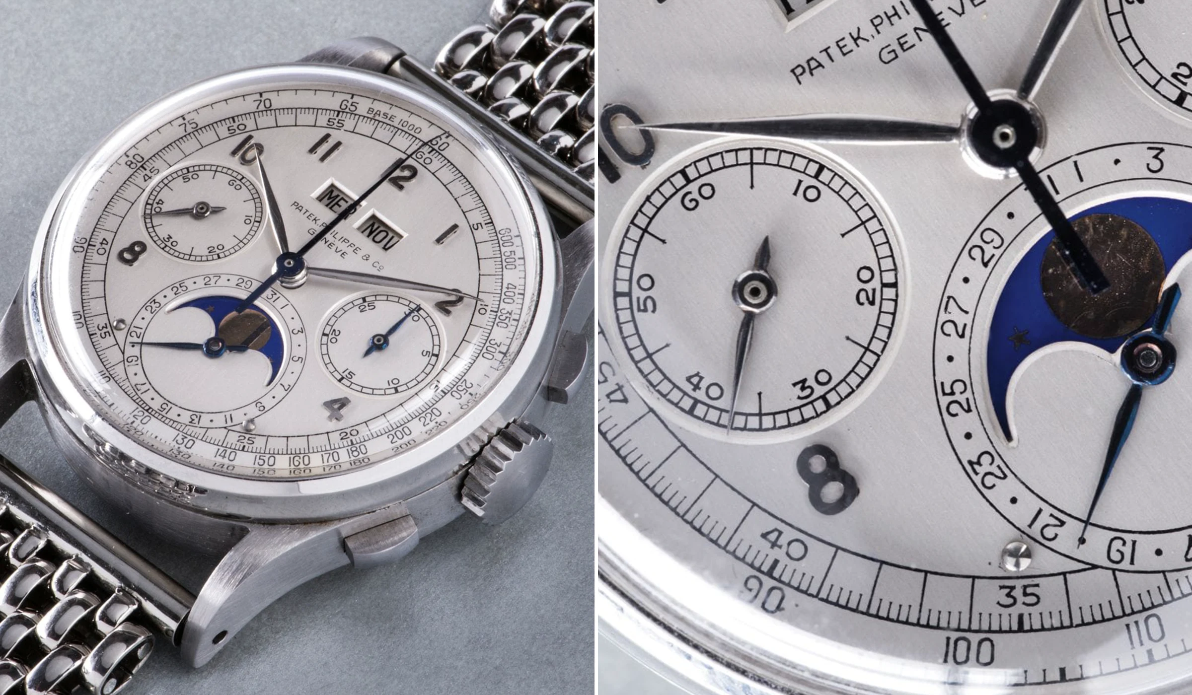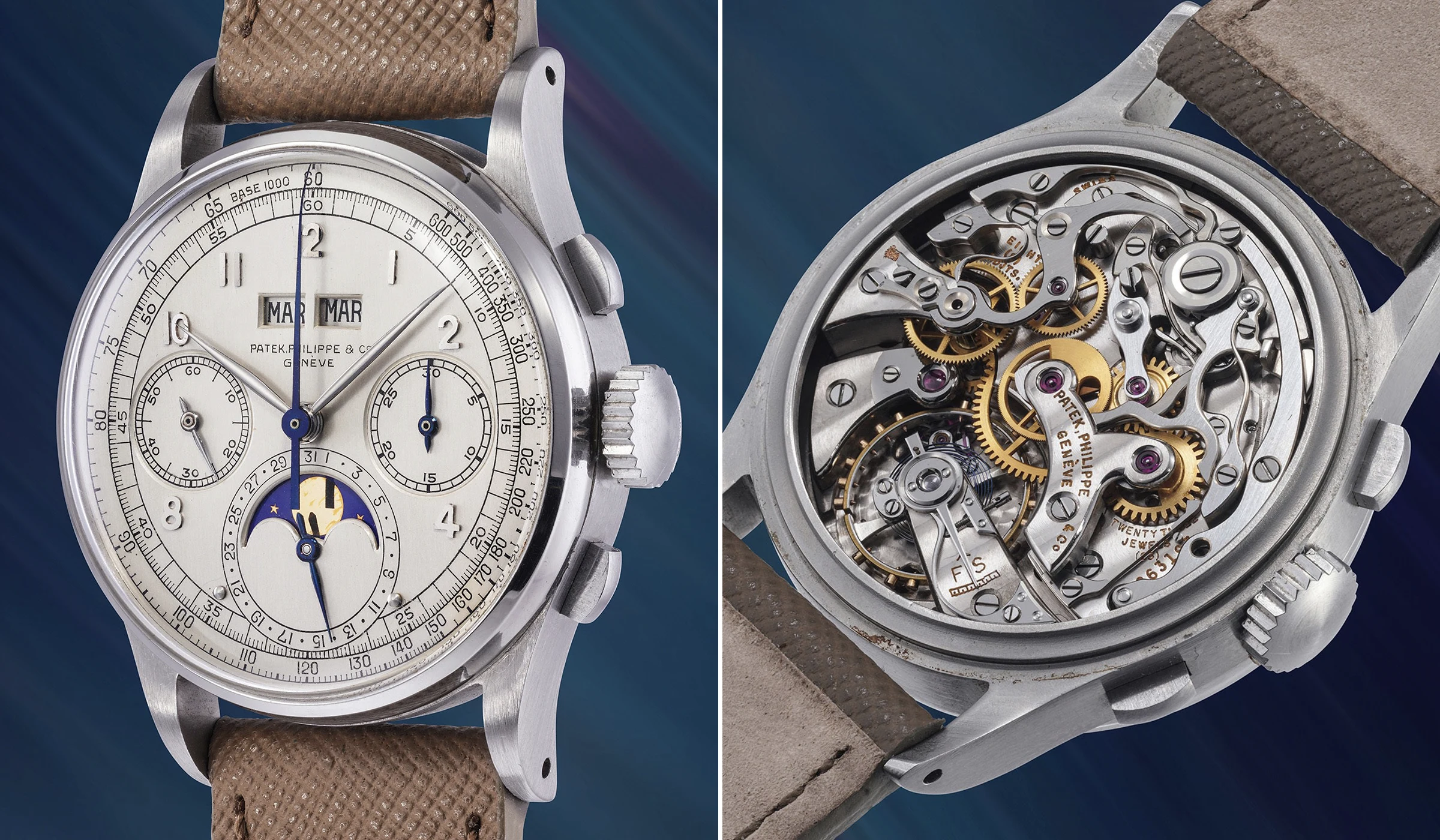 Auf Platz 3 und 4 der teuersten Patek Philippe Armbanduhren, die jemals auf einer Auktion verkauft wurden, ist die Ref. 1518 mit einem 35-mm-Edelstahlgehäuse aus dem Jahr 1944 vertreten, die über die Uhrwerksnummer 863’193 verfügt – die gesamten Details über die Uhr folgen im nächsten Abschnitt des Platzes 3. Die Referenz schrieb 1941 Geschichte als erster serienmäßig hergestellter Chronograph mit ewigem Kalender. Die Seltenheit dieses Modells ergibt sich natürlich aus der Verwendung von Stahl. Von den rund 281 Exemplaren, die hergestellt wurden, waren die meisten in einem Gehäuse aus Gelbgold untergebracht. Etwa 20 % der Ref. 1518 wurden in einem Roségoldgehäuse und nur vier Uhren in Edelstahl gefertigt.
