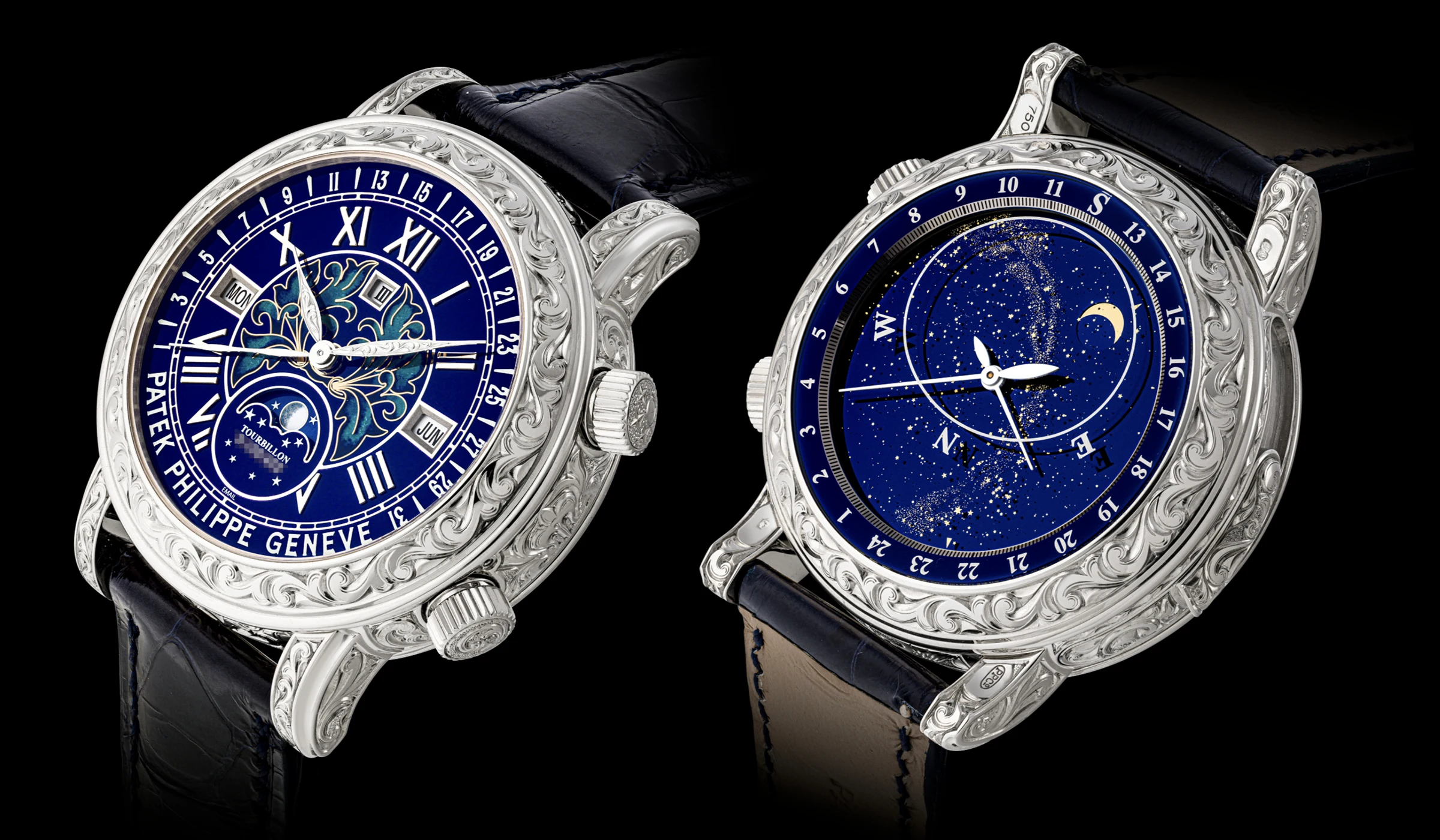 Als Platz 14 der teuersten Patek Philippe Armbanduhren, die jemals auf einer Auktion verkauft wurden, gilt die Sky Moon Tourbillon Ref. 6002G-001, die über zwei Zifferblätter verfügt. Diese doppelseitige Grande Complication mit blauem Cloisonné- und Champlevé-Emailzifferblatt wurde 2013 vorgestellt und löste das erste Sky-Moon-Tourbillon-Modell, die Referenz 5002 aus dem Jahr 2001, ab, die zuvor als die komplizierteste Armbanduhr der Welt galt. Die Sky Moon Tourbillon Ref. 6002G-001 ist mit zwölf Komplikationen ausgestattet und in einem vollständig von Hand ziselierten und gravierten 44-mm-Weißgoldgehäuse untergebracht, dessen Rankenornamente alleine über 100 Stunden Handarbeit erfordern. Was das Uhrwerk betrifft, so ist die Ref. 6002G-001 weitestgehend identisch mit ihrer Vorgängerin. Neben einem Tourbillon verfügt sie auch über eine Minutenrepetition mit zwei Kathedraltonfedern. Die Uhr zeigt auf der Vorderseite ein Zifferblatt mit mittlerer Sonnenzeit und beherbergt einen ewigen Kalender mit retrograder Datumsanzeige, Anzeigefenster für den Wochentag bei 9 Uhr, Schaltjahresanzeige bei 12 Uhr und Monat bei 3 Uhr sowie eine Mondphasenanzeige bei 6 Uhr.