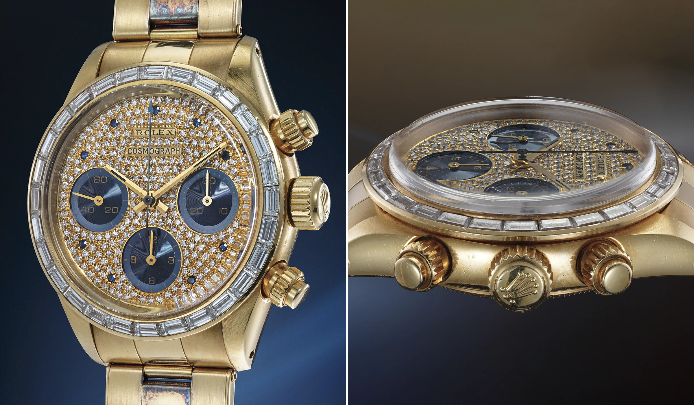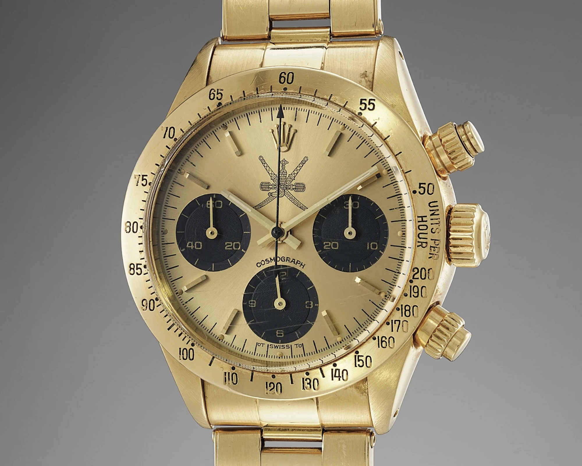 Der Platz 10 der teuersten Rolex Armbanduhren, die jemals auf einer Auktion verkauft wurden, geht auf den ehemaligen Sultan von Oman, Qaboos bin Said Al Said, zurück, der eine besondere Vorliebe dafür hegte, die feinsten Zeitmesser bei namhaften Uhrenhäusern wie Rolex und Patek Philippe in Auftrag zu geben, um sie treuen Dienern und ausländischen Würdenträgern zu schenken. Diese Uhr war Teil einer Serie von Daytona-Modellen in Gelbgold mit Edelsteinbesatz, die Qaboos über den traditionsreichen Londoner Juwelier Asprey bestellte. Asprey kam als offizieller Händler und Vermittler zwischen dem Sultanat Oman und Schweizer Manufakturen die Aufgabe zu, Qaboos’ Leidenschaft für Uhren mit besonderen Konfigurationen zu stillen. Da bis dahin keine Daytona mit Edelsteinbesatz existiert hatte, vergab Rolex für dieses Modell die neue Referenznummer 6270 und die Auslieferung der ersten Exemplare begann um 1984.