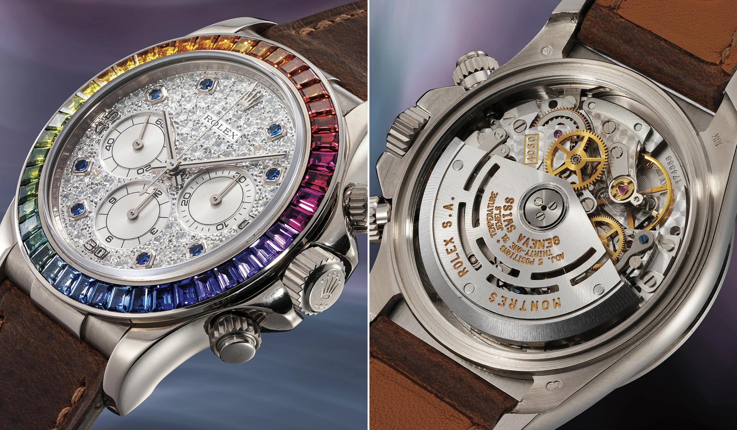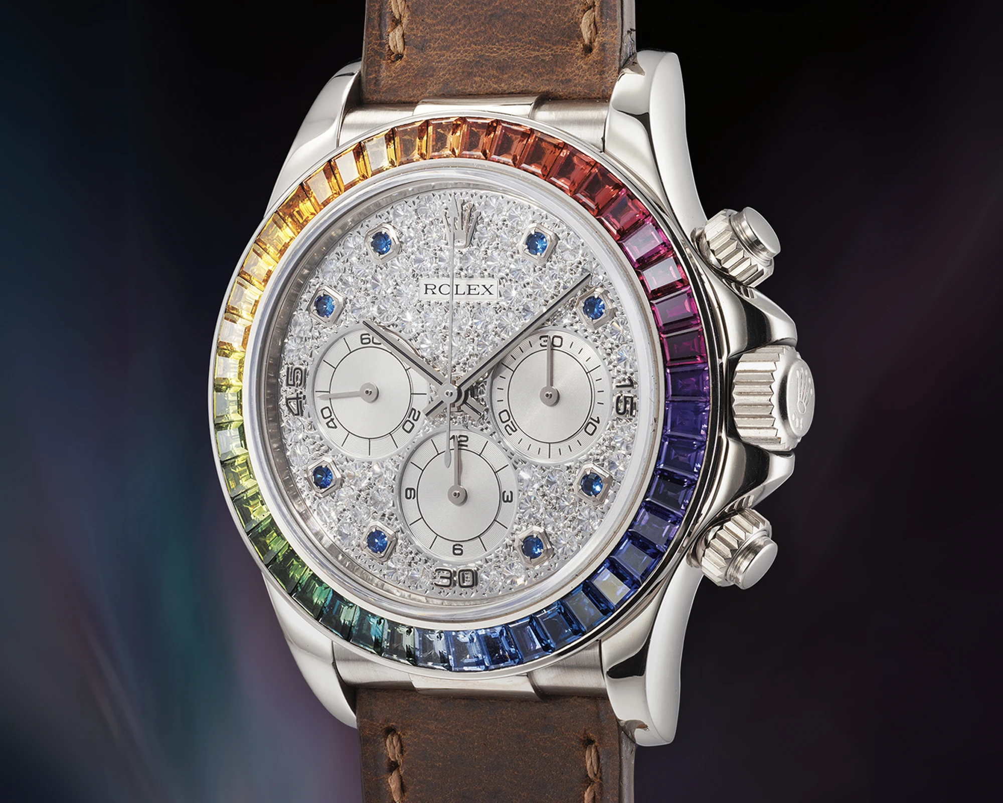 Obwohl Rolex als die wohl bekannteste Uhrenmarke der Welt gilt, im Jahr schätzungsweise über eine Million Uhren produziert und sich damit mit einem Marktanteil von rund einem Drittel der gesamten Schweizer Uhrenproduktion behauptet, umgibt die Marke mit der Krone durch ihre kalkulierte Diskretion eine Aura, die ebenso viel Prestigeträchtigkeit wie Mysterium suggeriert. Unter dieses Mysterium fallen auch die sogenannten „Off-Catalogue“-Rolex-Modelle, die nicht dem regulären Produktkatalog angehören, für VIP-Kunden reserviert sind und meist mit farbenfrohen Edelsteinen besetzt sind, die hohe Preisschilder zur Folge haben. Als eines der berühmtesten Rolex-„Off-Catalogue“-Modelle gilt ein weißgoldenes Unikat der Rolex Cosmograph Daytona mit der Referenz 16599SAAEC, das bereits um das Jahr 1994 von Rolex geschaffen wurde und mit 44 verschiedenfarbigen Saphiren im Baguetteschliff auf der Lünette besetzt ist, die das Farbspektrum eines Regenbogens nachzeichnen – weshalb diese Uhr auch als „Rainbow“-Daytona bekannt ist. Darüber hinaus verfügt ihr Zifferblatt über blaue Saphirindizes und ist mit pavégefassten Diamanten überzogen.