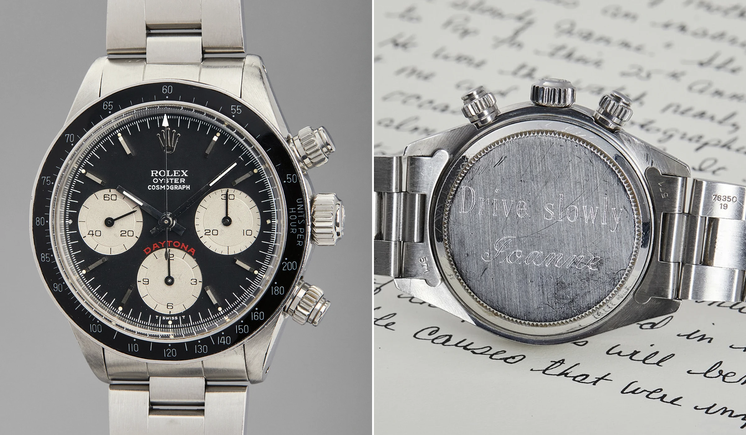 Doch welche Geschichte steckt hinter dieser Uhr – und welche Umstände begründeten ihren exorbitant hohen Verkaufspreis? Laut dem Auktionshaus Phillips erwarb Joanne Woodward die Rolex Daytona Ref. 6239 für ihren Mann Paul Newman während der Dreharbeiten des Films Winning im Jahr 1969. In Winning verkörperte Paul Newman die Rolle des Rennfahrers Frank Capua, und seine Frau Joanne Woodward spielte im Film passenderweise Capuas Ehefrau. Die Uhr, die über ein „Exotic“-Zifferblatt verfügt, das später in „Paul Newman“-Zifferblatt umbenannt wurde, wurde um das Jahr 1968 von Joanne Woodward bei Tiffany & Co. an der Fifth Avenue in New York erworben, worauf die von Hand eingravierte Inventarnummer auf der Rückseite eines Horns hindeutet. Im Laufe seines Lebens wurde Newman mit mehreren Generationen der Daytona fotografiert – bei der hier beschriebenen Uhr handelt es sich jedoch um die erste und zugleich einzige Daytona mit „Exotic“-Zifferblatt, die Newman trug. Auf dem Gehäuseboden findet sich die liebevolle Widmung „DRIVE CAREFULLY ME“. Die von Paul Newman getragene Uhr wurde von James Cox – einst der Freund und heute Vertraute von Newmans Tochter Nell Newman – um das Jahr 1984 in Empfang genommen, aufbewahrt und schlussendlich zur Auktion freigegeben.