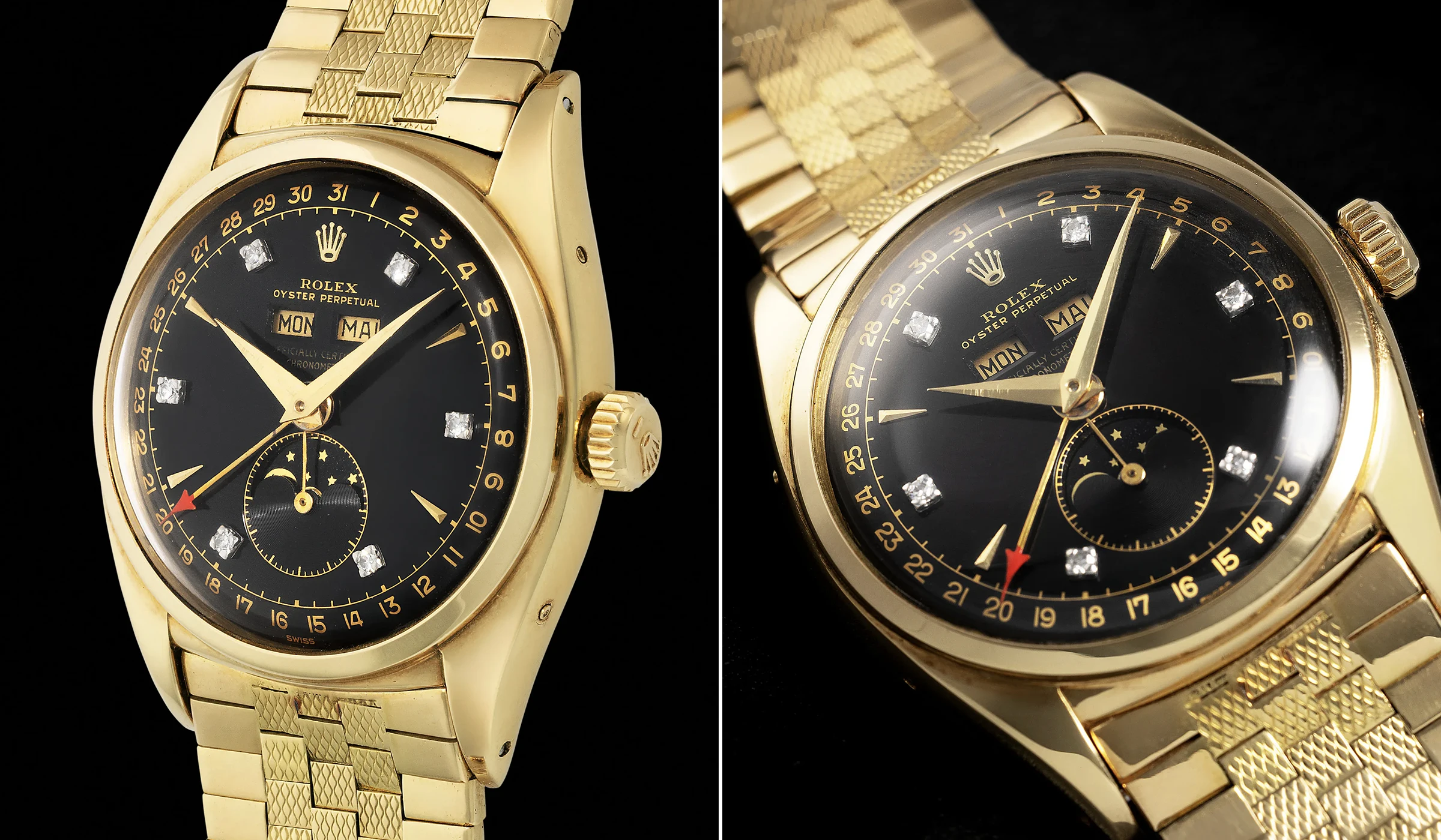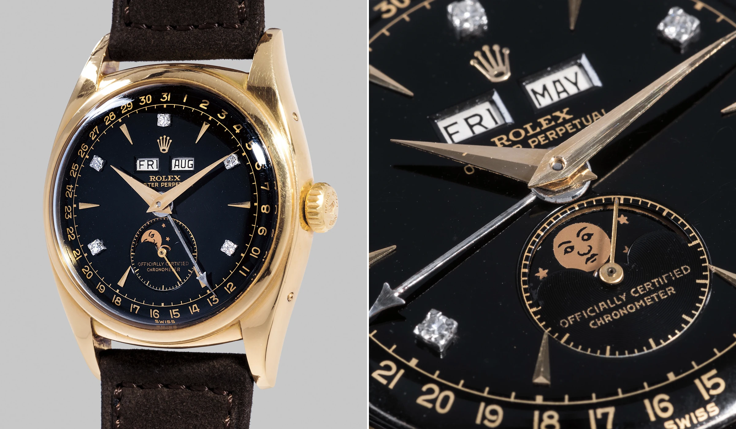 Die laut dem Auktionshaus Phillips um 1952 gefertigte Rolex Ref. 6062, die „Bao Dai“ erhielt, kennzeichnet sich durch die Charakteristika eines 36 mm messenden Oyster-Gehäuses in Gelbgold, eines hauseigenen automatischen Kalibers 9 3/4“‘ und einer – bei Rolex besonders seltenen – vollständigen Kalenderkomplikation mit Mondphasenanzeige. Die Rolex Ref. 6062 „Bao Dai“ ist eines von lediglich drei bekannten Exemplaren der Ref. 6062, die über die Kombination eines schwarzen Zifferblatts und Diamantindizes verfügen. Während zwei dieser Uhren sechs Diamanten bei den ungeraden Stundenpositionen aufweisen, verfügt die Ref. 6062 „Bao Dai“ jedoch über fünf Diamantindizes bei den geraden Stunden, die mit einer daraus resultierenden Zifferblattgestaltung einhergehen, die diese Uhr zu einem wahren Unikat macht. Denn aufgrund des Diamantindexes bei 12 Uhr musste die Rolex-Krone im Schriftzug nach unten versetzt werden – folglich entfiel die übliche Anordnung „Rolex Oyster Perpetual“ oberhalb des Tages- und Monatsfensters. Zudem wurde auch der Hinweis „Officially Certified Chronometer“ aus dem Zentrum des Zifferblatts entfernt und unterhalb der Mondphasenanzeige positioniert.