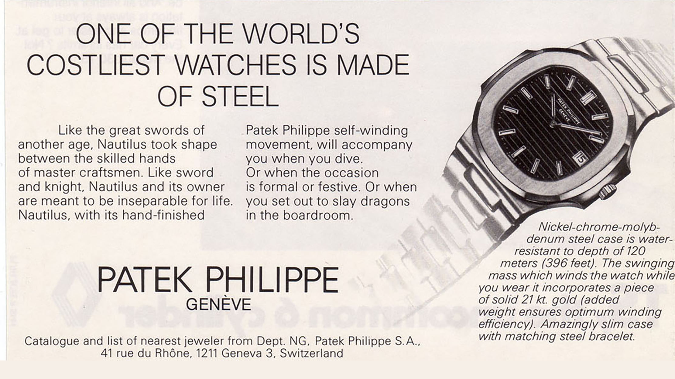 Den Grundstein für die Patek Philippe Nautilus legte die vom Uhrendesigner Gérald Genta entworfene Royal Oak von Audemars Piguet, die im Jahr 1972 vorgestellt wurde und ein völlig neues Konzept präsentierte: Zum ersten Mal in der Geschichte vereinte ein Zeitmesser robuste Funktionalität mit dem uhrmacherischen Prestige des Vallée de Joux, indem er das Konzept der Luxus-Sportuhr aus Stahl mit einem vollständig in das Gehäuse integrierten Armband begründete. Auch Patek Philippe tat sich mit Genta zusammen, was im Jahr 1976 im Design der Patek Philippe Nautilus mündete. In einer Zeit, in der die Gehäuse der meisten Luxusuhren aus Edelmetallen wie Gold bestanden, bewarb Patek Philippe die Nautilus mit den Worten: „Eine der teuersten Uhren der Welt ist aus Stahl gefertigt“.