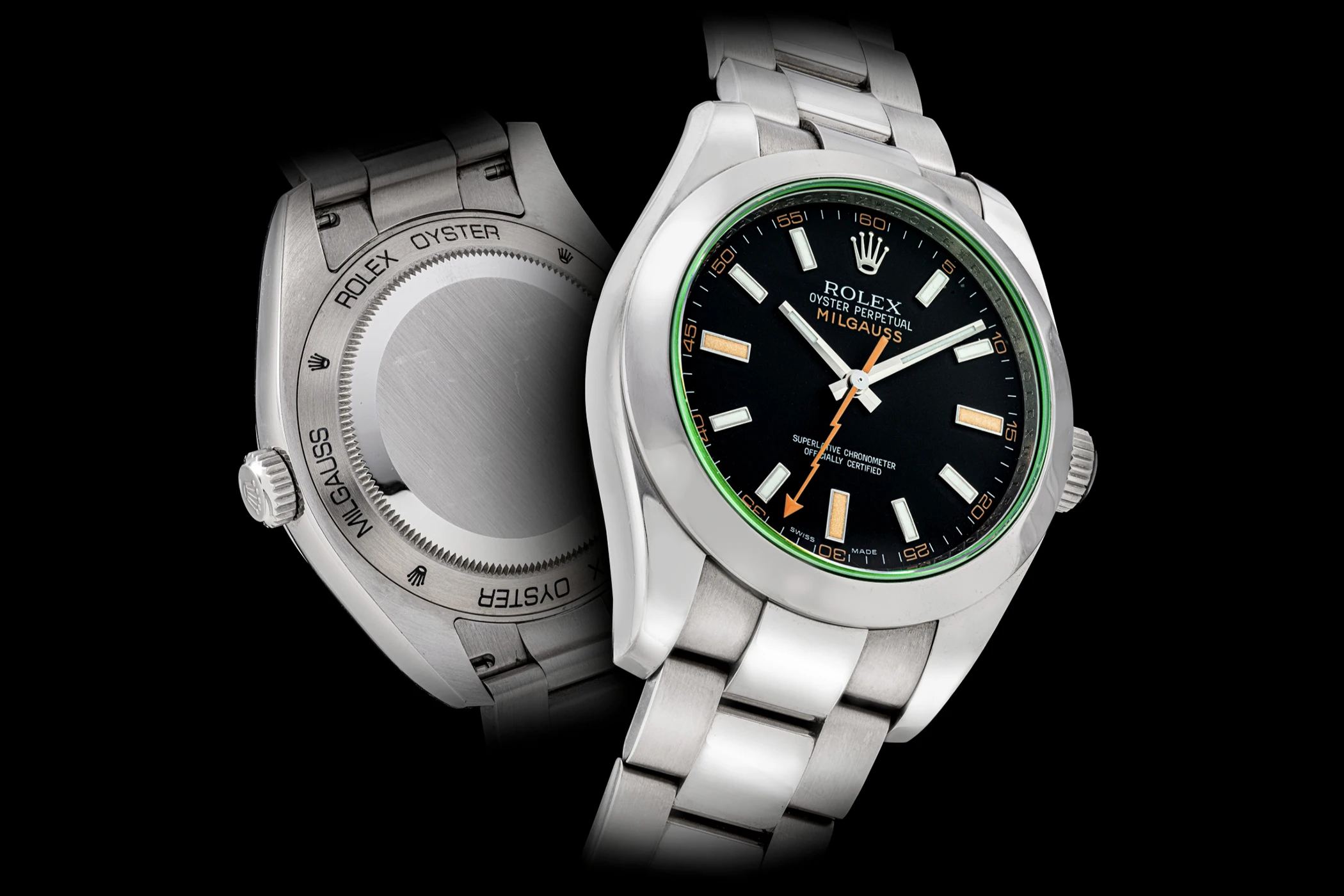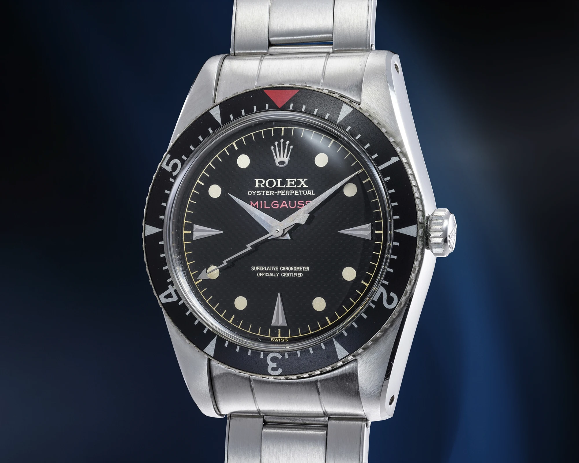 Auf dem Zifferblatt der ersten beiden Milgauss-Referenzen 6543 und 6541 findet die deutlichste Anspielung an Elektrizität und Magnetfeldresistenz Ausdruck in dem blitzförmigen Sekundenzeiger, der der Milgauss dazu verhalf, zu einem der wiedererkennbarsten Modelle der Krone zu werden. Jedoch konnte sich die Milgauss trotz dieser Merkmale nicht nachhaltig durchsetzen: Auf die erste Milgauss-Referenz 6543, die lediglich zwei Jahre lang in Produktion war, bevor sie 1956 von der Referenz 6541 abgelöst wurde, folgte 1960 die Referenz 6019, die vollständig mit dem Konzept des blitzförmigen Sekundenzeigers brach. Im Jahr 1988 wurde die Rolex Milgauss dann vollständig eingestellt. Doch im Jahr 2007, nach beinahe 20 Jahren, hob Rolex die Milgauss mit der Referenz 116400 aus der Versenkung. Diese Uhr sorgte dank einer Ausführung mit schwarzem Zifferblatt, orangefarbenen und weißen Indizes sowie eines grünen Saphirglases für Aufsehen. Diese Milgauss war die einzige Rolex, die mit einem getönten Saphirglas gefertigt wurde. Doch auch diese Varianten konnten nicht die erforderlichen Begehrlichkeiten wecken, und so wurde die Milgauss im Jahr 2023 erneut eingestellt.
