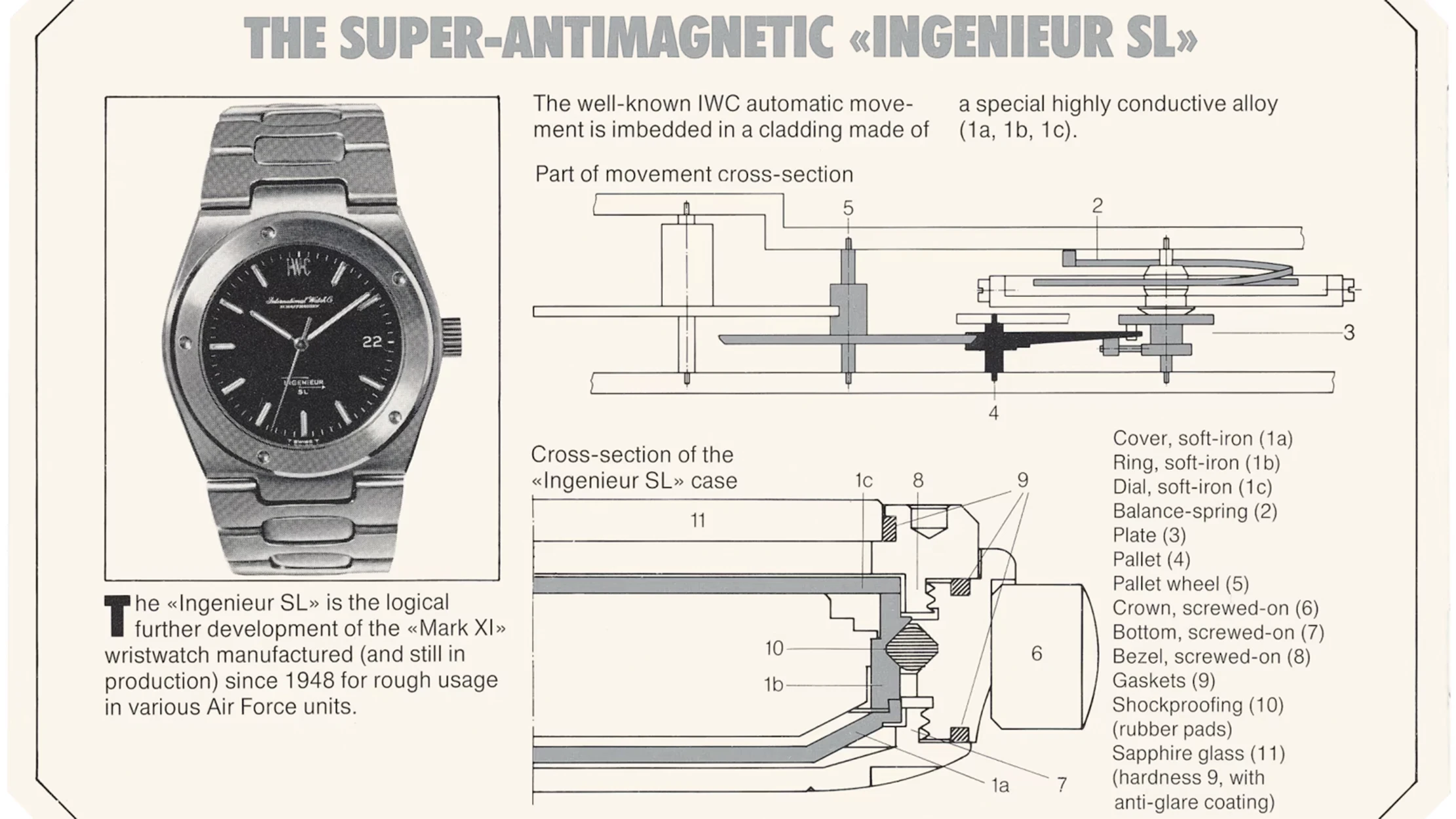 Als besonders stilprägend gelten die fünf vertieften Einkerbungen in der Lünette, die durch das Verschrauben mit dem Gehäusemittelteil entstanden. Im Inneren der Ingenieur arbeitete seinerzeit das Kaliber 8541ES, das durch ein Weicheisen-Innengehäuse vor Magnetfeldern geschützt war und der Ingenieur ihre technischen sowie antimagnetischen Eigenschaften verlieh. Ein Blick auf die Kaliberbezeichnung „ES“ offenbart mehr: Das „E“ steht für die Verwendung amagnetischer Materialien bei Anker, Ankerrad und Hebelscheibe, während das „S“ die Sekundenstoppfunktion des Werks bezeichnet. Zusammengenommen sorgten diese Komponenten dafür, dass das Uhrwerk bis zu 1.000 Gauss starken Magnetfeldern standhielt und durch eine Werksaufhängung mit Gummiring zusätzlich gegen Stöße geschützt war. Auch die IWC Ingenieur SL begeht in diesem Jahr ihr 50. Jubiläum.