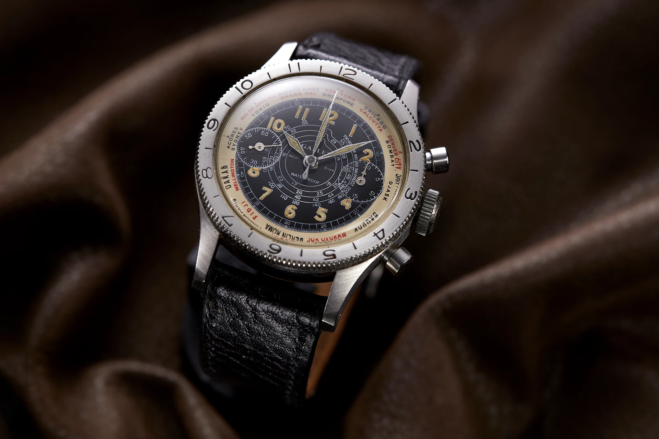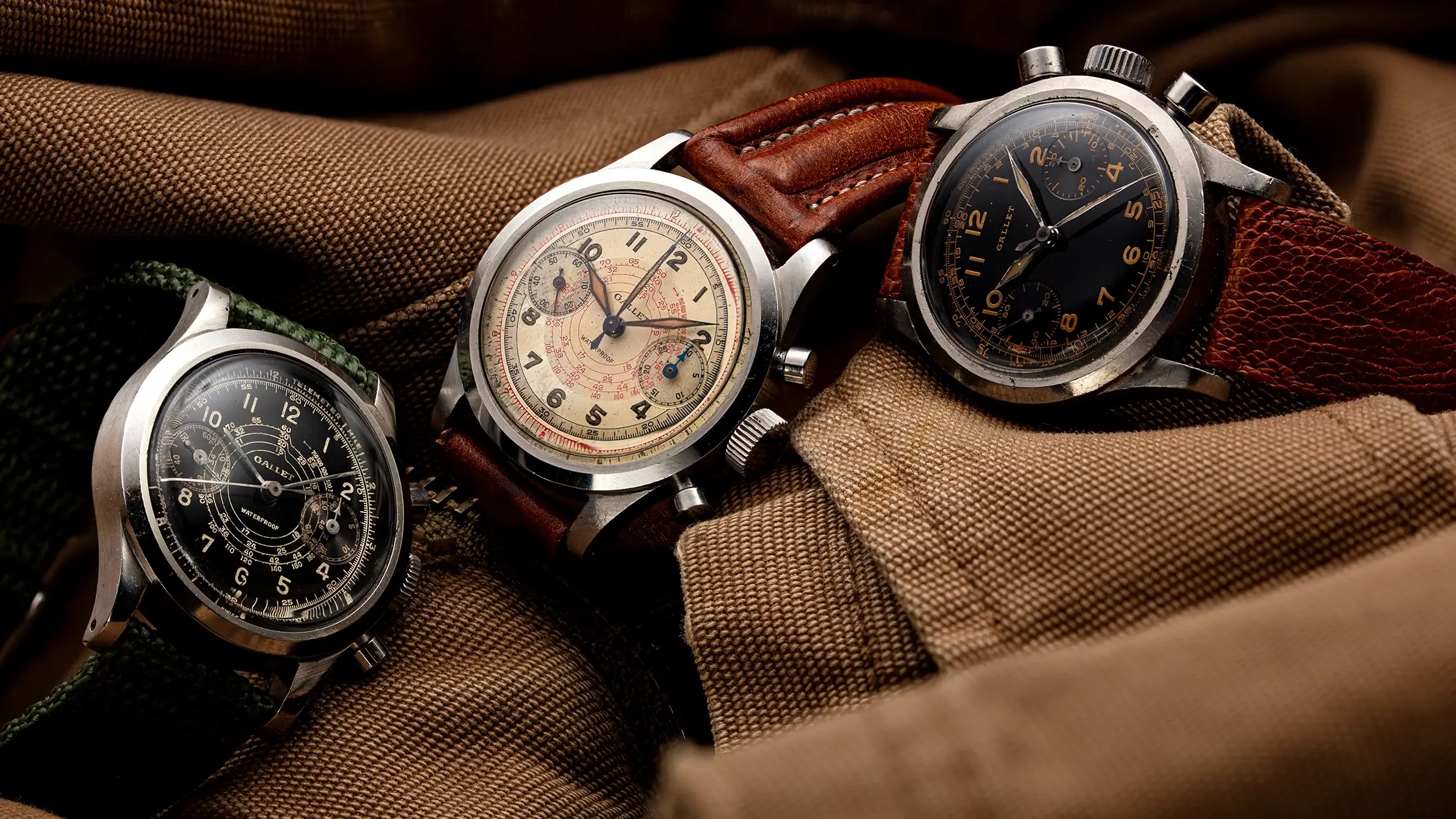 Besonders deutlich wird dies bei letzterer – der Marke Gallet, deren Geschichte bis in das Jahr 1826 zurückreicht, als das Unternehmen von Julien Gallet in La Chaux-de-Fonds gegründet wurde. Nach der im Jahr 2023 für circa 65 Millionen Schweizer Franken erworbenen Marke Universal Genève handelt es sich bei Gallet um die zweite Übernahme einer in den Jahrzehnten nach der Quarzkrise in Vergessenheit geratenen Uhrenmarke mit großer Tradition im Bau von Chronographen. 1903 schrieb Gallet Geschichte, als eine ihrer Stoppuhren zur Messung des ersten motorisierten Fluges der Gebrüder Wright verwendet wurde. Auf den Höhepunkt ihres Schaffens gelang Gallet vor allem mit zwei wesentlichen Modellen: Zum einen gilt der Gallet MultiChron Clamshell-Chronograph von 1938 als ein Meilenstein, da er den Chronographen als eine der ersten Uhren überhaupt mit einer wasserdichten Konstruktion kombinierte und somit vor Staub, Feuchtigkeit und Regen geschützt war. Zum anderen handelte es sich bei der 1939 vorgestellten Flying Officer um den ersten wasserdichten Armband-Chronographen, der über eine Weltzeit-Funktion, also Städtenamen am Zifferblattrand, verfügte und somit für die Verfolgung mehrerer Zeitzonen konzipiert war.