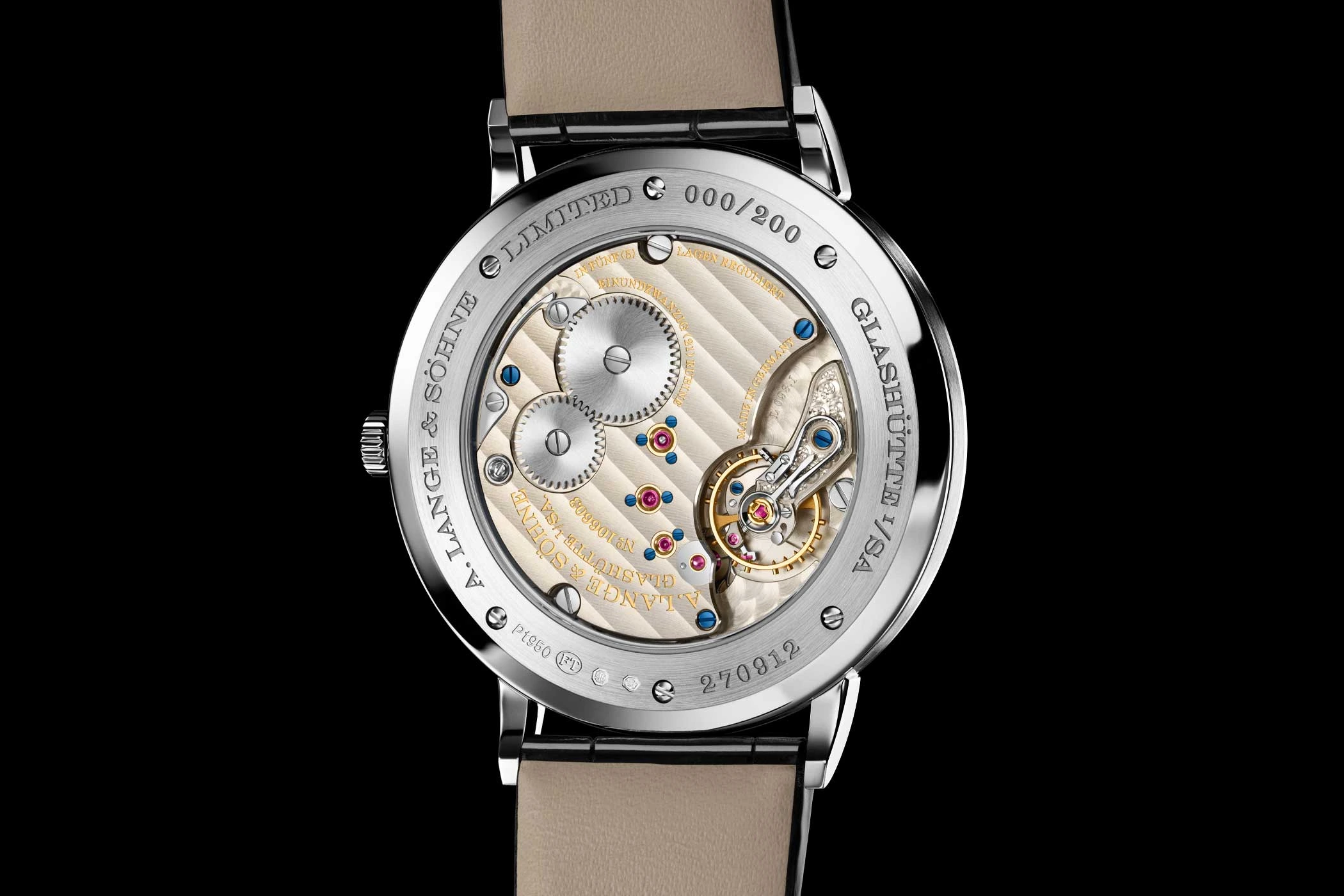 Das elegante Erscheinungsbild der auf 200 Stück limitierten Saxonia Thin mit Onyx-Zifferblatt verdankt sie dem besonders flachen Handaufzugswerk L093.1, dessen aufwendige Verzierungen durch den Saphirglasboden sichtbar sind.