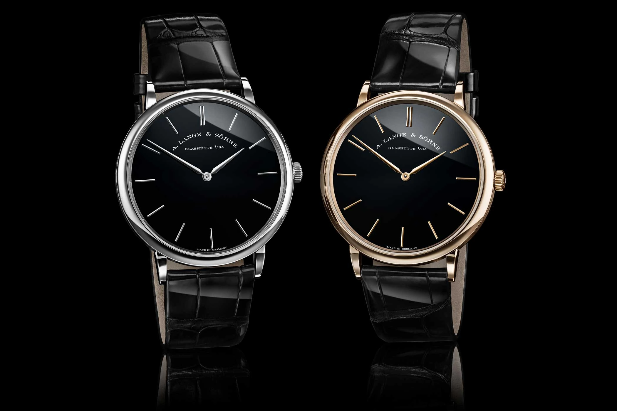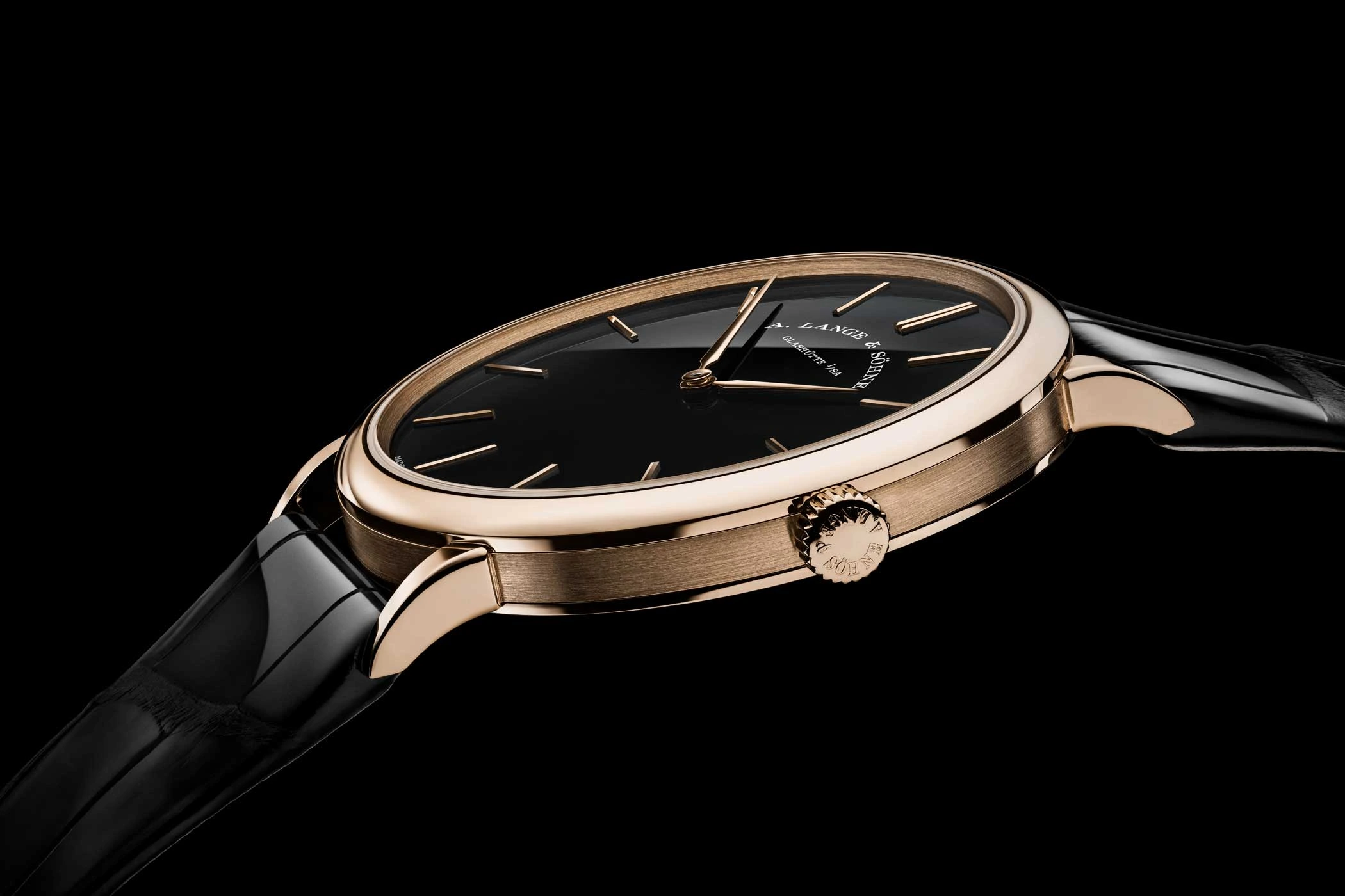 Denn mit ihrem flachen, bis drei bar wasserdichten Gehäuse aus 750er-Honiggold oder 950er-Platin, der wohlproportionierten Wölbung der schmalen Bandanstöße, den Alpha-Zeigern aus Gold und den schlanken Stabappliken hätte sie auch in den 1950er-Jahren die Handgelenke von Anzugträgern dezent-elegant geschmückt. Getragen wird die Saxonia Thin mit Onyx-Zifferblatt an einem schwarzen Alligatorlederband.