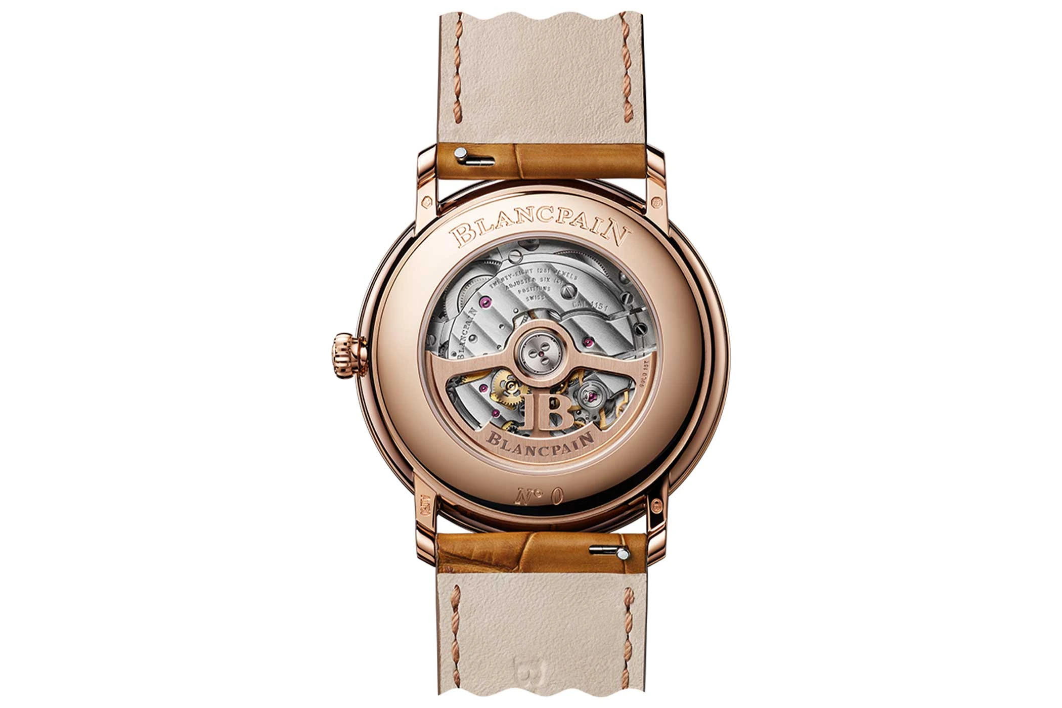 Es ist sorgsam verziert, mit einem durchbrochenen, beidseitig aufziehbaren Rotor aus Gelbgold ausgestattet und durch den Saphirglasboden sichtbar.